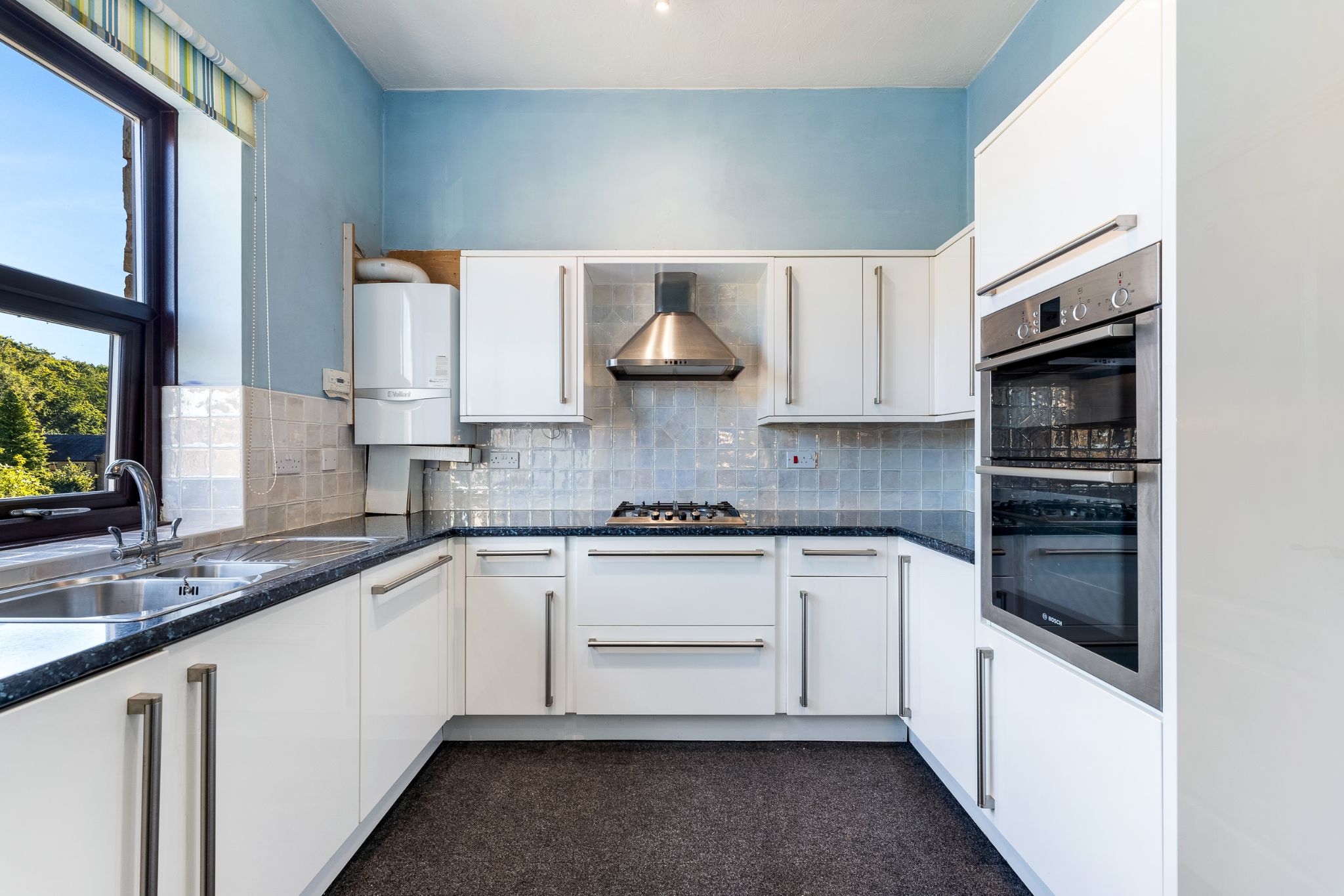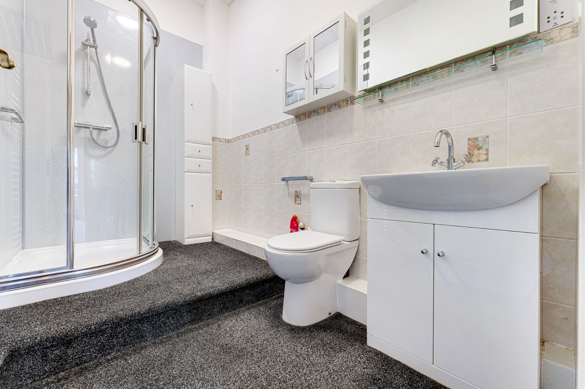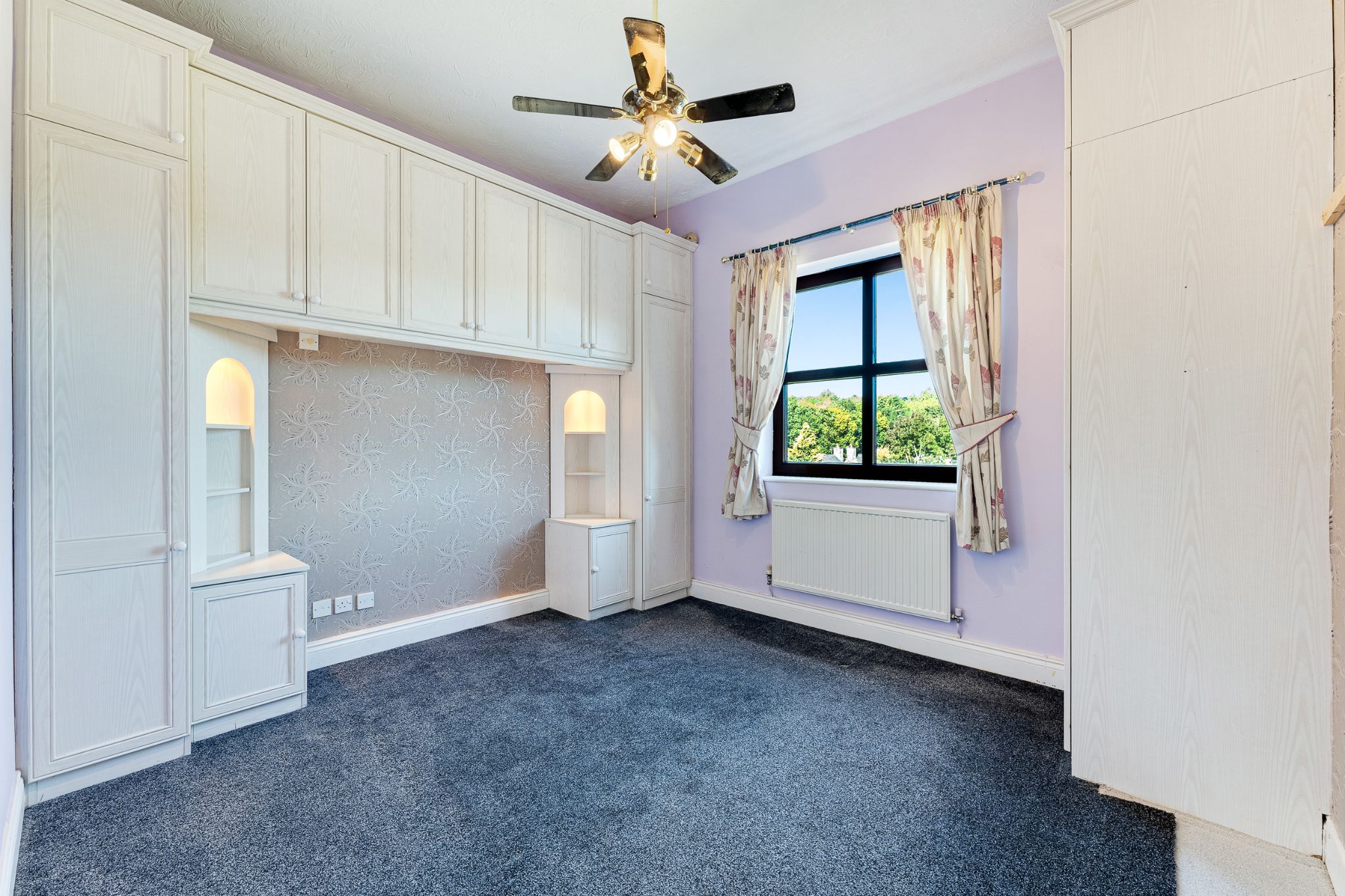 The master bedroom is a comfortable double size with fitted furniture and a remote-controlled ceiling fan, as well as a large window framing the peaceful leafy views. A part-tiled en-suite bathroom offers a walk-in rainfall shower, vanity basin, W.C. and chrome heated towel rail. Bedroom two is also a double size with fitted wardrobes, but would function equally well as a dedicated home study, dressing room or second snug lounge as desired. Completing the accommodation, a spacious shower room offers a large walk-in shower, vanity basin, W.C. and chrome heated towel rail.
