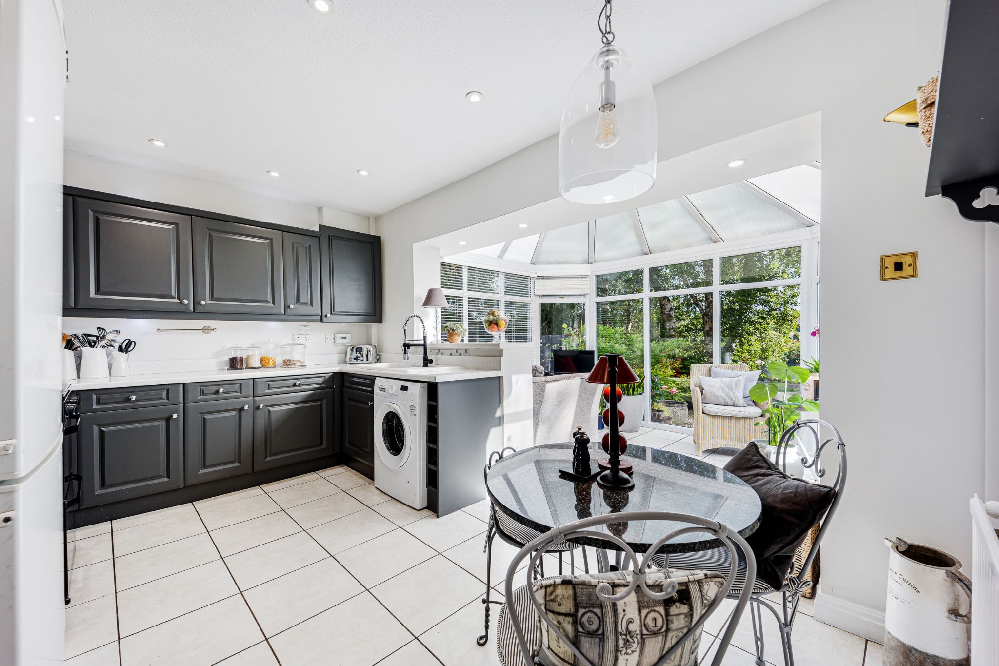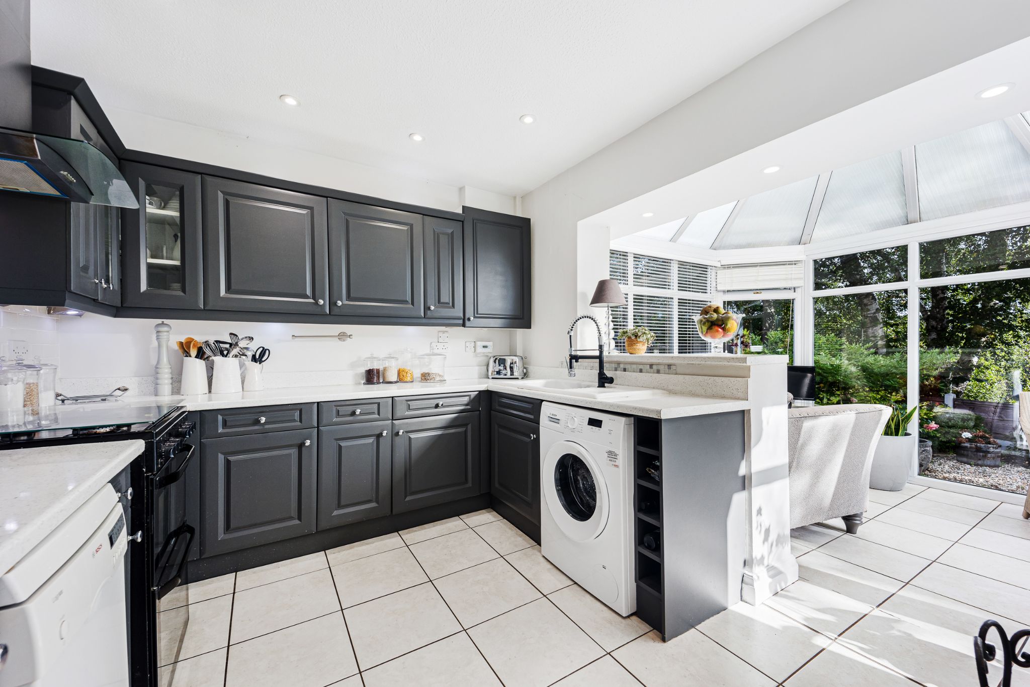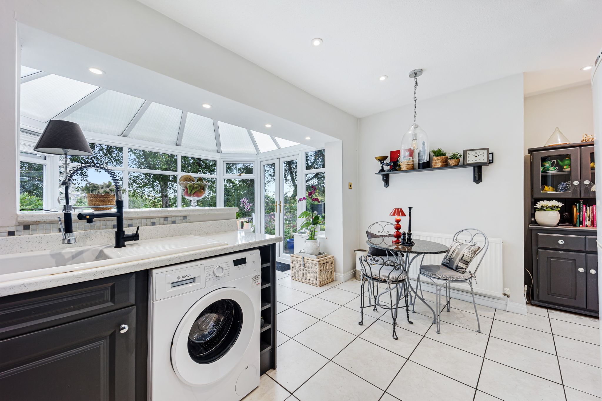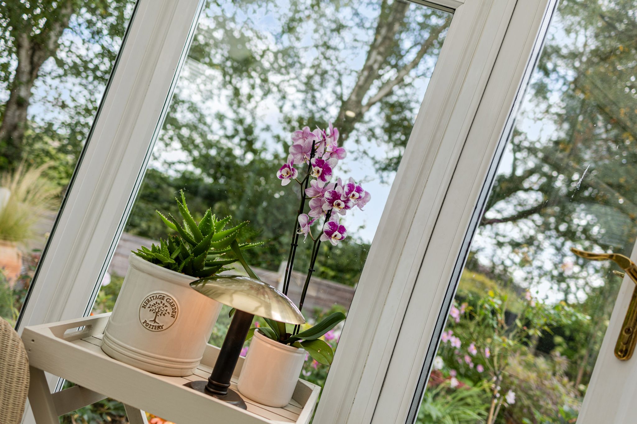 After parking up on the driveway, step through the composite front door into the entrance hallway. Fitted storage to the right offers plenty of space to neatly store coats and shoes, keeping the home neat and tidy. To the left is the welcoming lounge, a bright and calm room with a feature gas fireplace to add a cosy focal point. Continue through the glazed double doors into the kitchen-diner at the rear of the home. Grey base and wall units offer plenty of storage, and there's plumbing provisions for a cooker beneath the extractor hood, as well as space for your fridge-freezer, dishwasher and washing machine. An open archway leads through to the conservatory, where there's ample space for your dining table and furniture to allow you to enjoy watching the birds in the garden and the lovely views beyond.