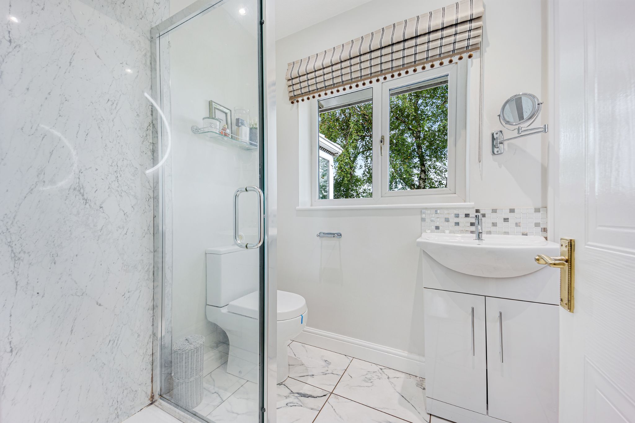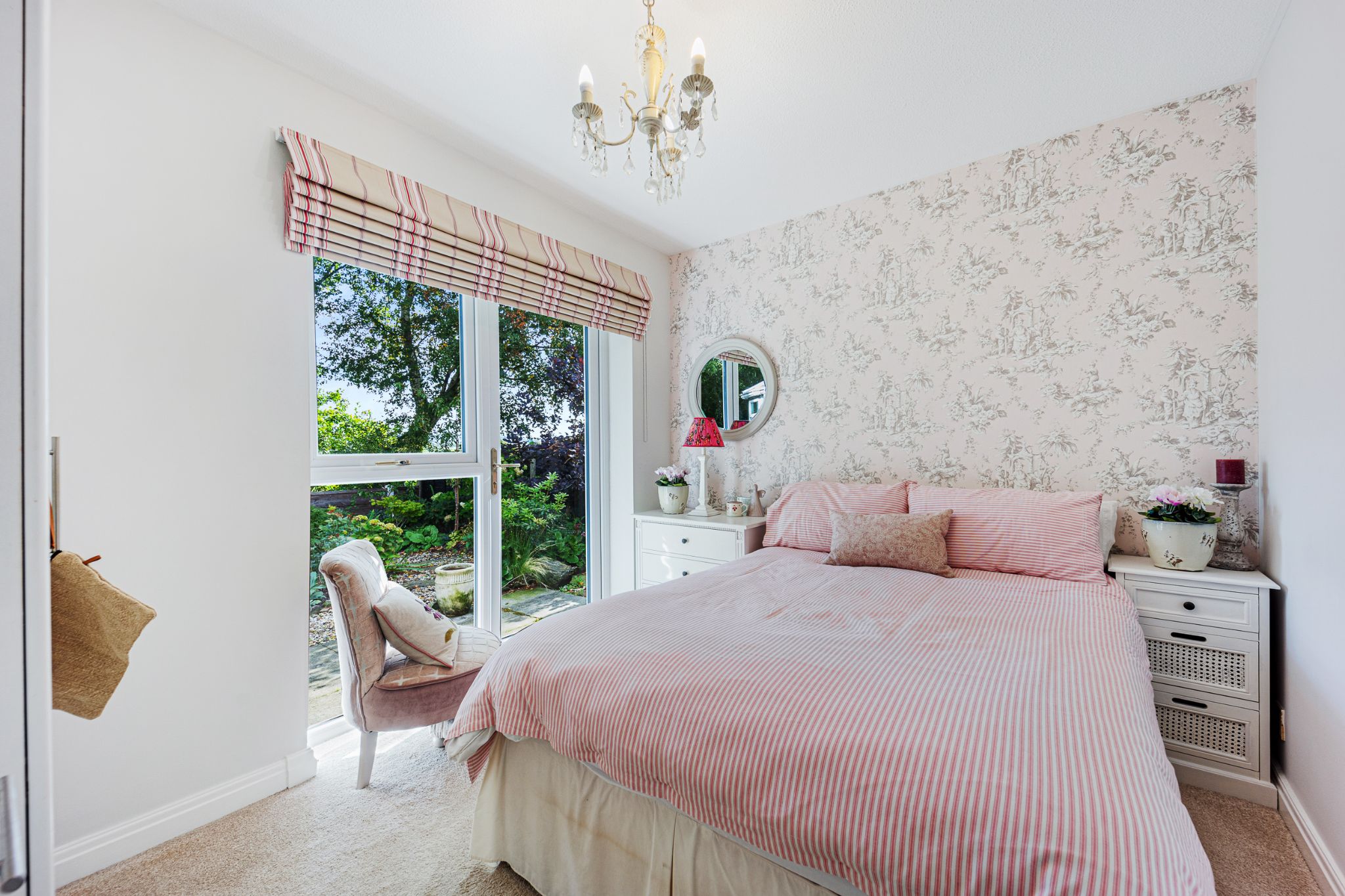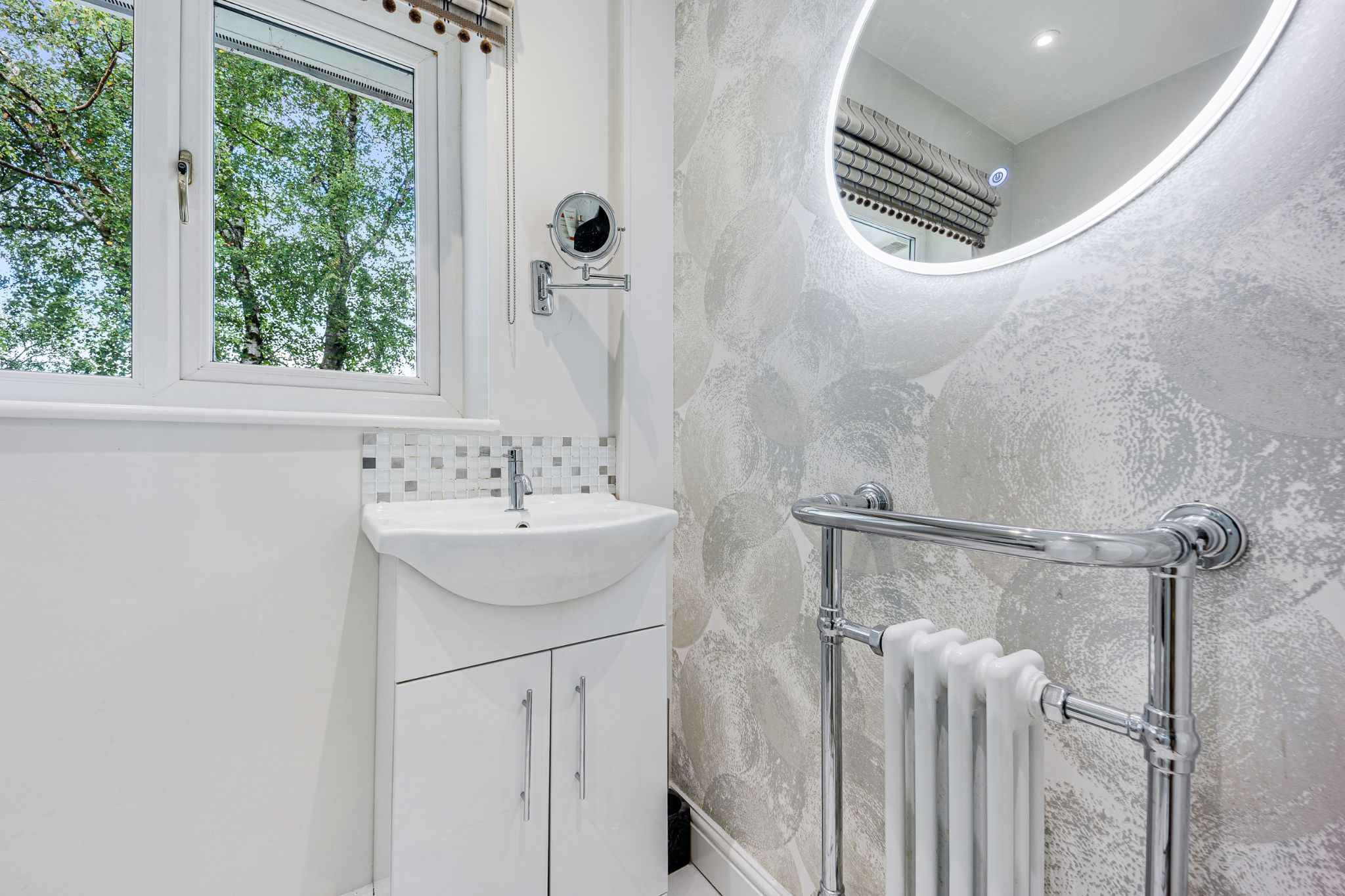 Retrace your steps through the hallway to find the two double bedrooms and shower room. The master sits to the front of the home, with contemporary white fitted furniture and leafy views. Bedroom two is also a good double size with white fitted furniture, and French doors leading out to the rear garden. Completing the internal accommodation, the shower room is part tiled in sleek white marbled porcelain tiles, with a walk-in shower, W.C., vanity basin, traditional chrome towel radiator and an LED mirror.