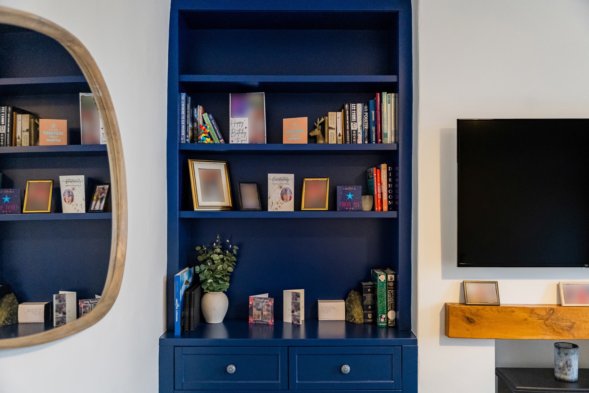 Through to the rear of the home where you’ll be “wowed” by the magnificent views over rolling countryside. A large window and glass door frame the lush green scenery of the surrounding countryside while pouring in a great amount of natural light, giving a beautiful, bright and airy feel. You’ll notice the wooden floor underfoot, a bespoke fitted unit with shelving and storage cupboards is built into the alcove, and a chimney breast holding the centre of the room with slate hearth and oak mantle that adds a subtle rustic touch.