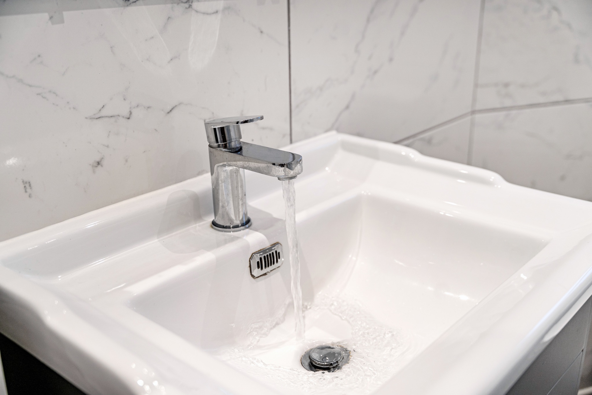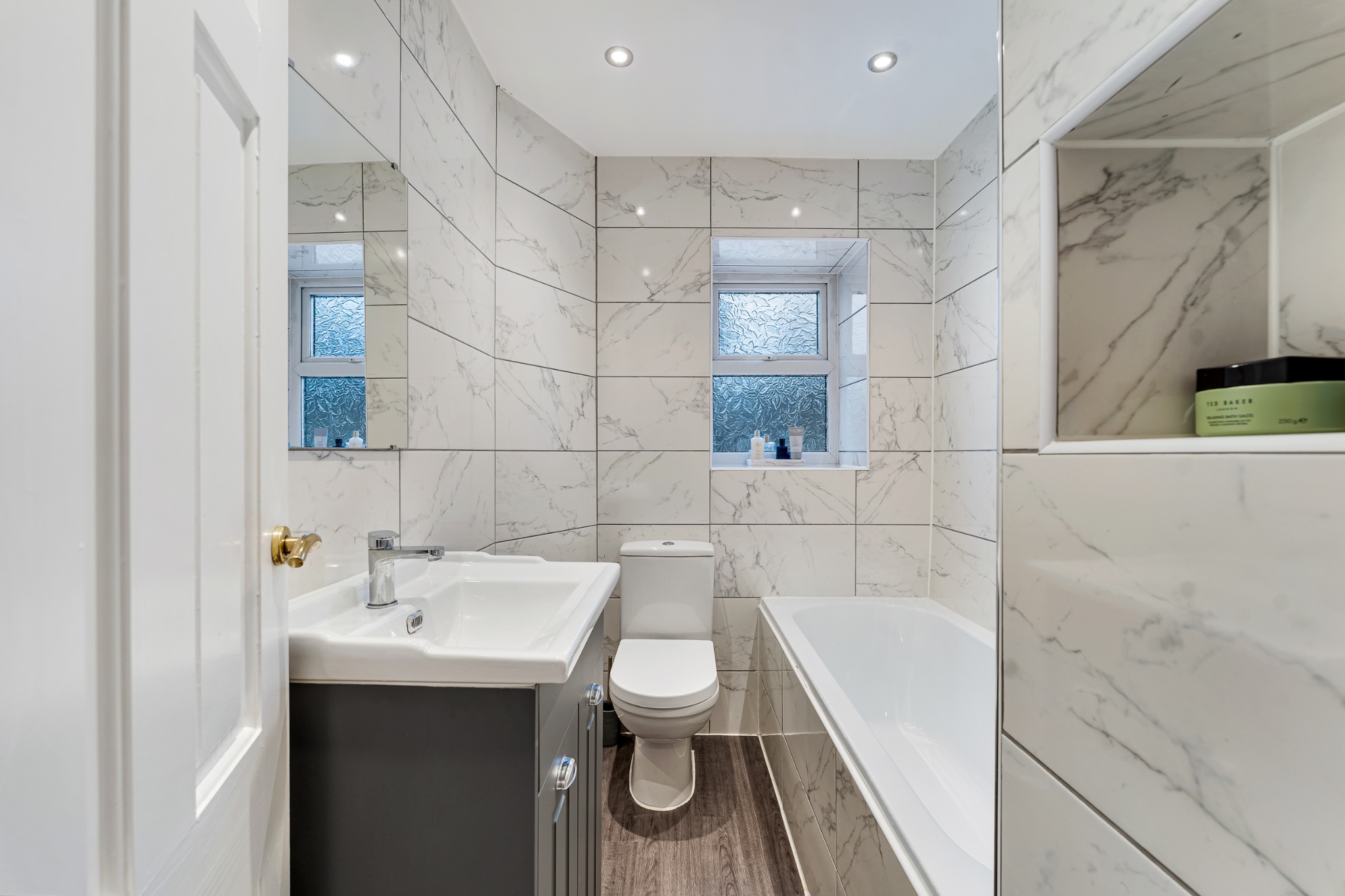 The 3 piece bathroom features, white marbled tiling to the walls and around the bath, with a suite comprising bath with shower, vanity basin with integral storage, and WC.
