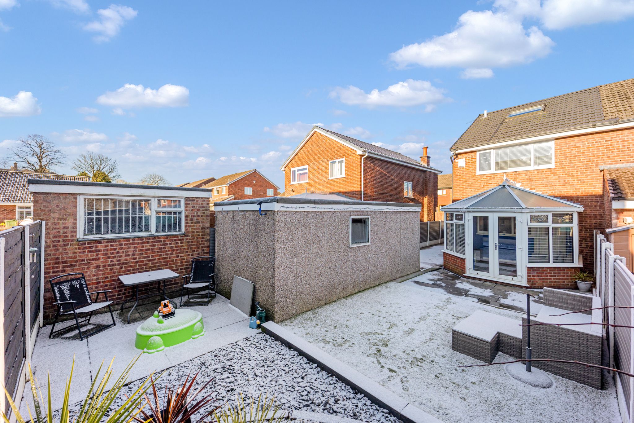 After parking on the driveway, step through the front door into a welcoming entrance vestibule. To the right, there is a spacious lounge that features an electric fire, creating a cosy focal point to the room . Continue through into the kitchen-diner, fitted with cream wall and base units, complemented by an array of integrated appliances including an electric oven and grill, electric hob, extractor hood, fridge freezer and plumbing for a washing machine. A practical breakfast bar provides an ideal space for casual dining or family living. To the rear, a bright and airy conservatory—currently used as a second lounge—enjoys patio doors opening directly onto the rear garden, making it a perfect space for entertaining and enjoying the warmer months.