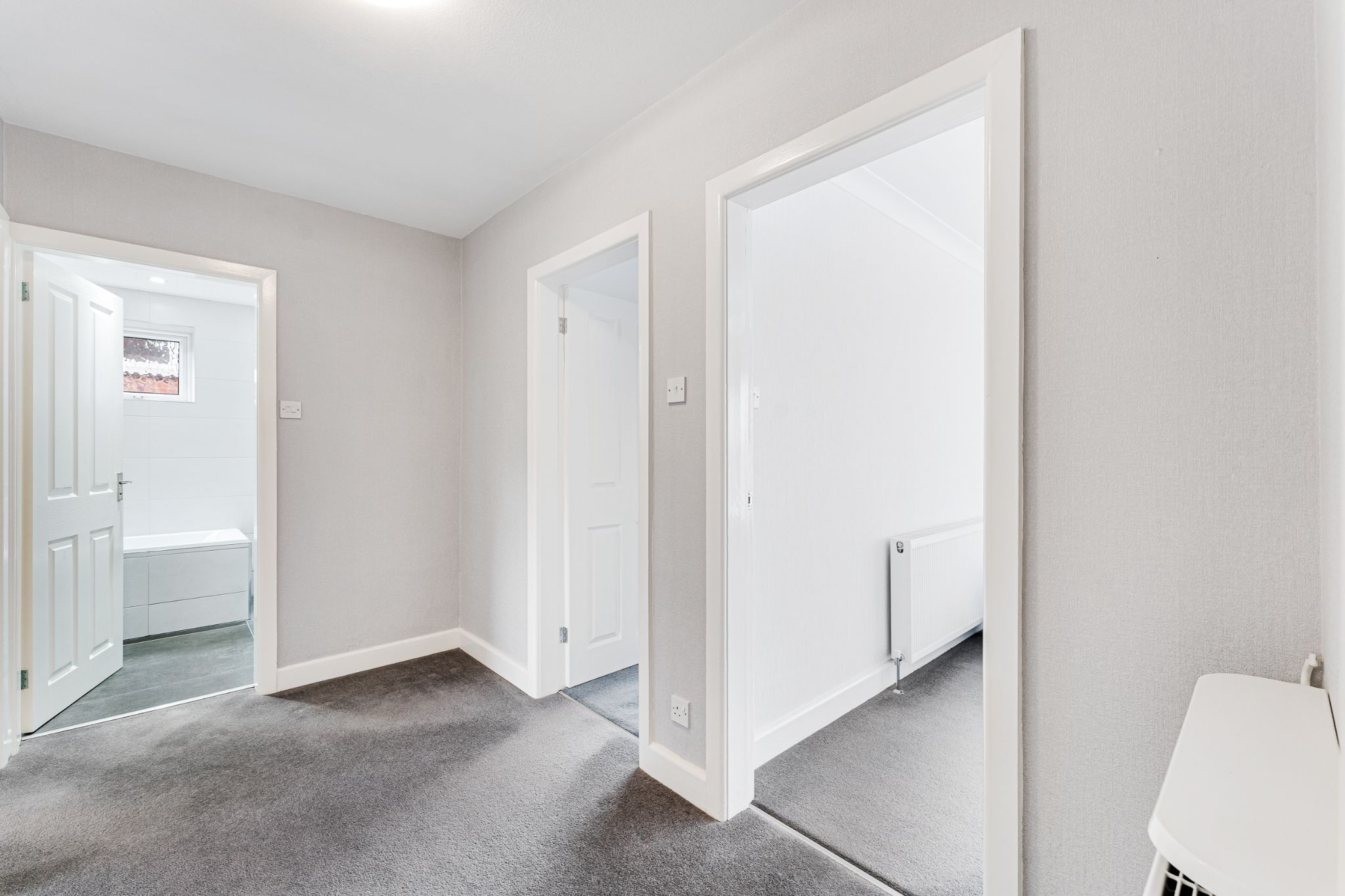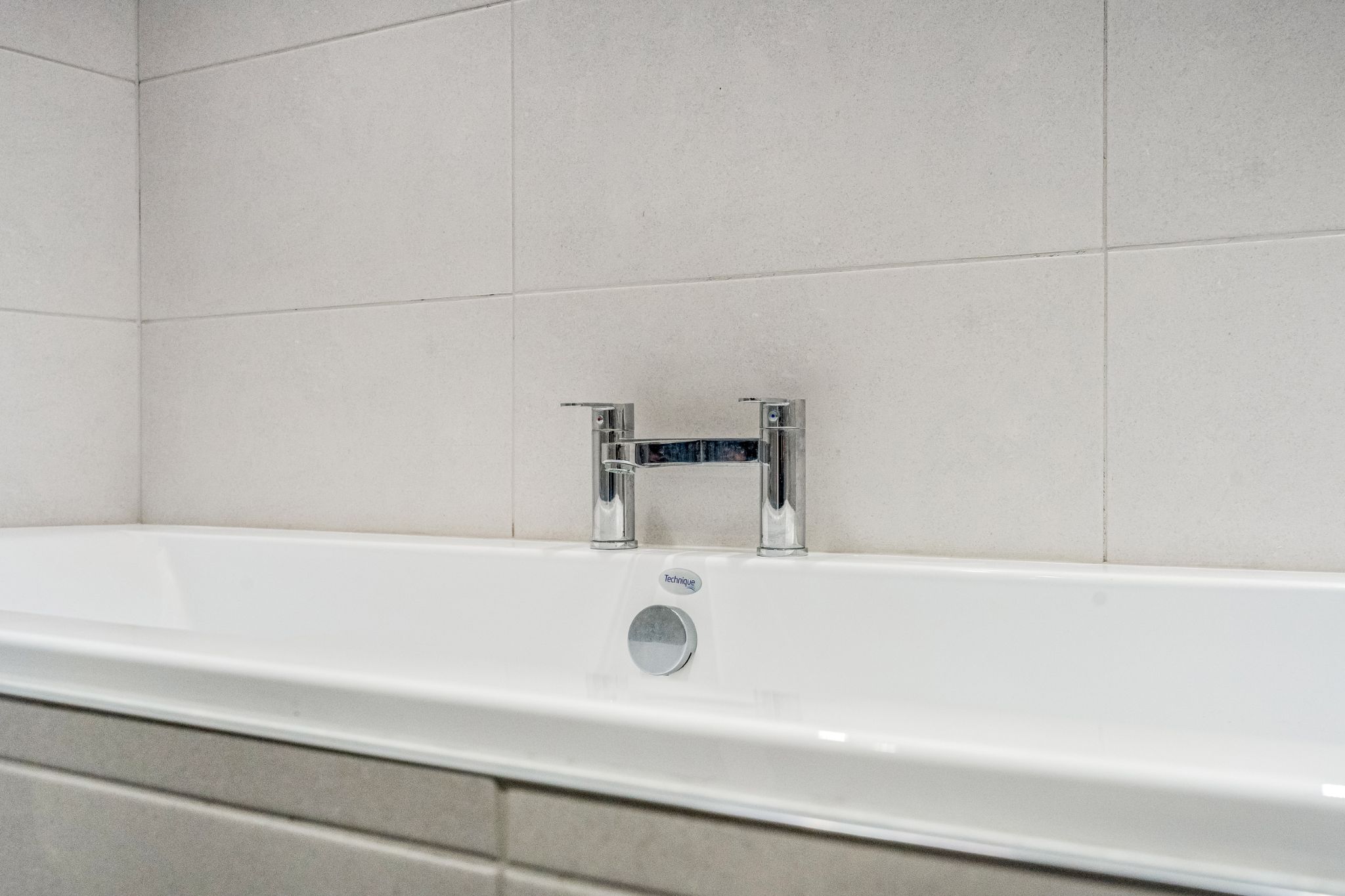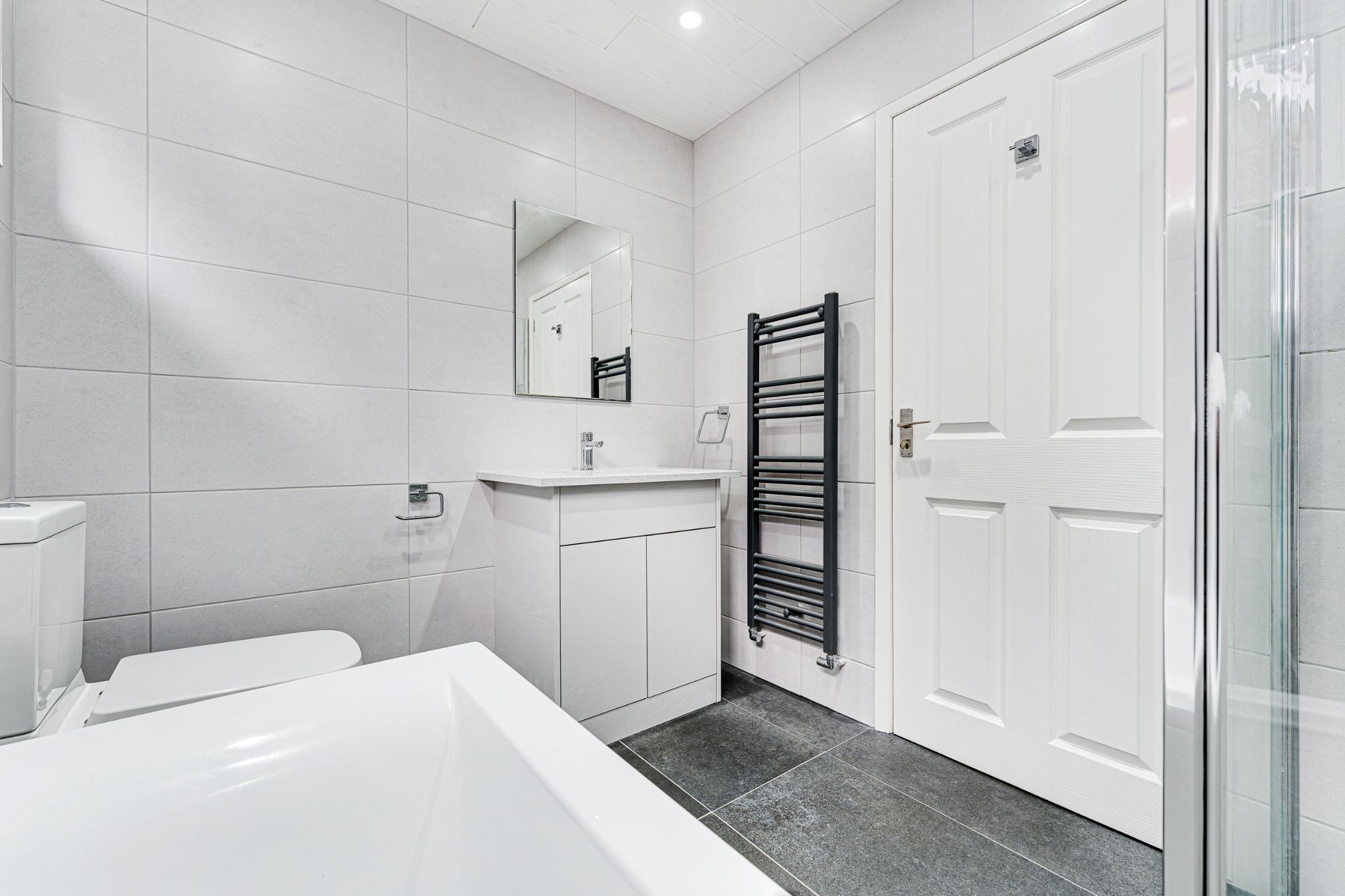Follow the hallway to discover three bedrooms and the family bathroom, along with two generous linen closets. There is also access to the large loft, which has boarding for storage and offers scope to be converted into living accommodation. The master bedroom is a spacious double with sleek white fitted furniture. Bedroom two is also a good double size, with leafy views over the rear garden, while bedroom three is a versatile space—ideal as a guest room, home office or snug lounge—with patio doors opening directly onto the garden. Completing the accommodation, the 4-piece bathroom is fully tiled in soft white and grey tones and features a bathtub, large walk-in rainfall shower, vanity basin, W.C., and heated towel rail.