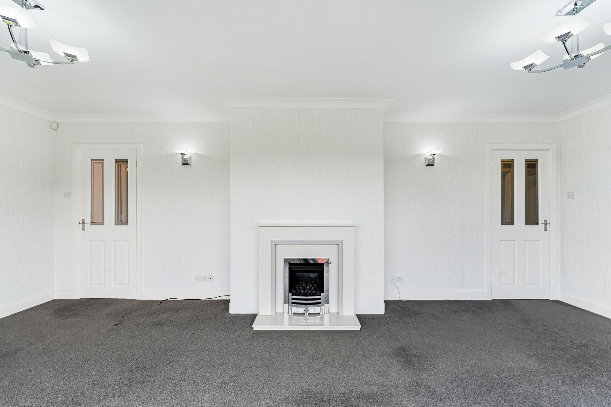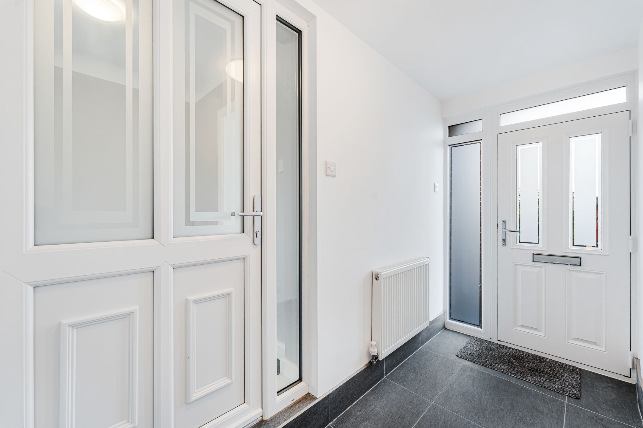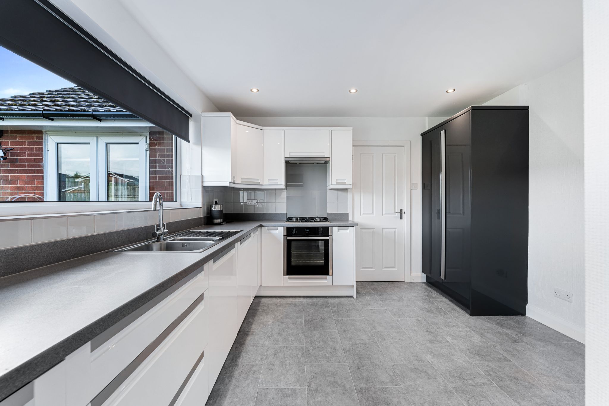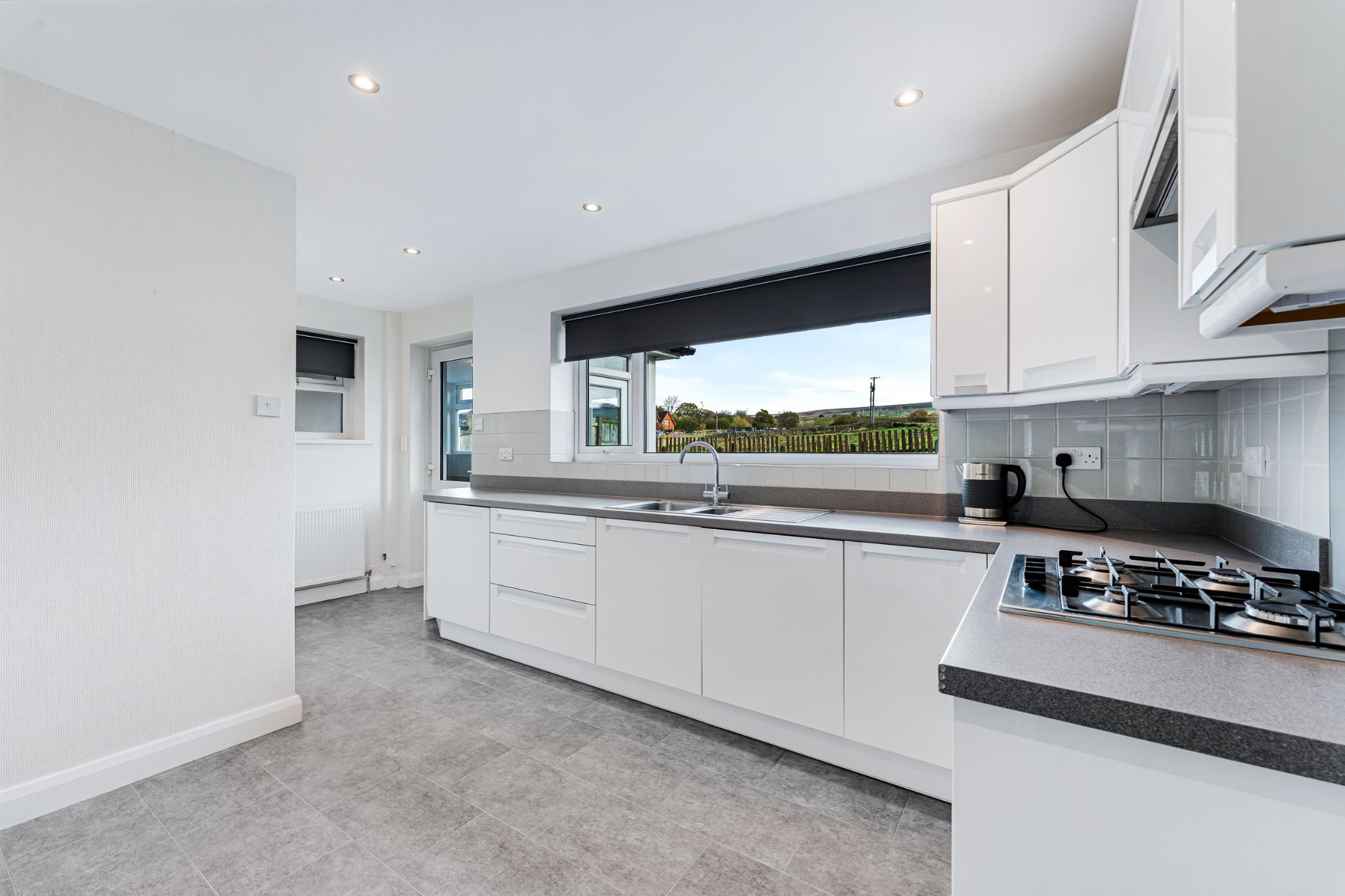 After parking on the driveway, step through the smart composite front door into the large porch—an ideal space to store coats and shoes before entering the welcoming hallway. To the right, the lounge is bright and inviting, with natural light streaming through the large picture window that perfectly frames the countryside views to the front. A feature gas fireplace adds a cosy focal point for the colder months. Across the hallway, the modern kitchen-diner is fitted with sleek white gloss units and a range of integrated appliances including a Neff Slide & Hide oven, 4-ring gas hob with extractor, fridge, and dishwasher. A full-height pantry provides useful storage, and the stainless-steel sink sits beneath a window capturing the uninterrupted views of open fields behind the home. Just off the kitchen, the utility room offers additional storage and plumbing for laundry appliances, with a door leading out to the rear garden.