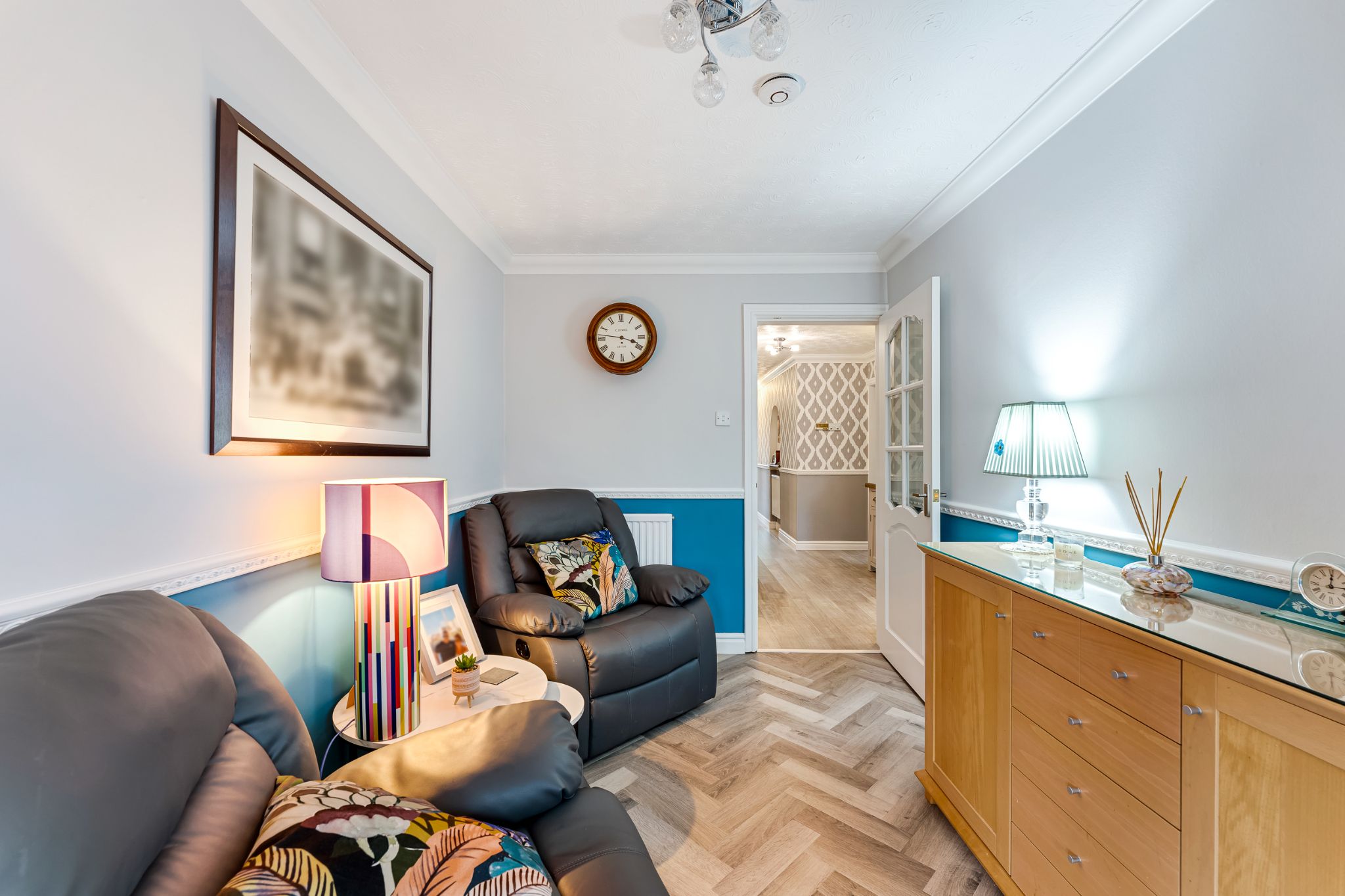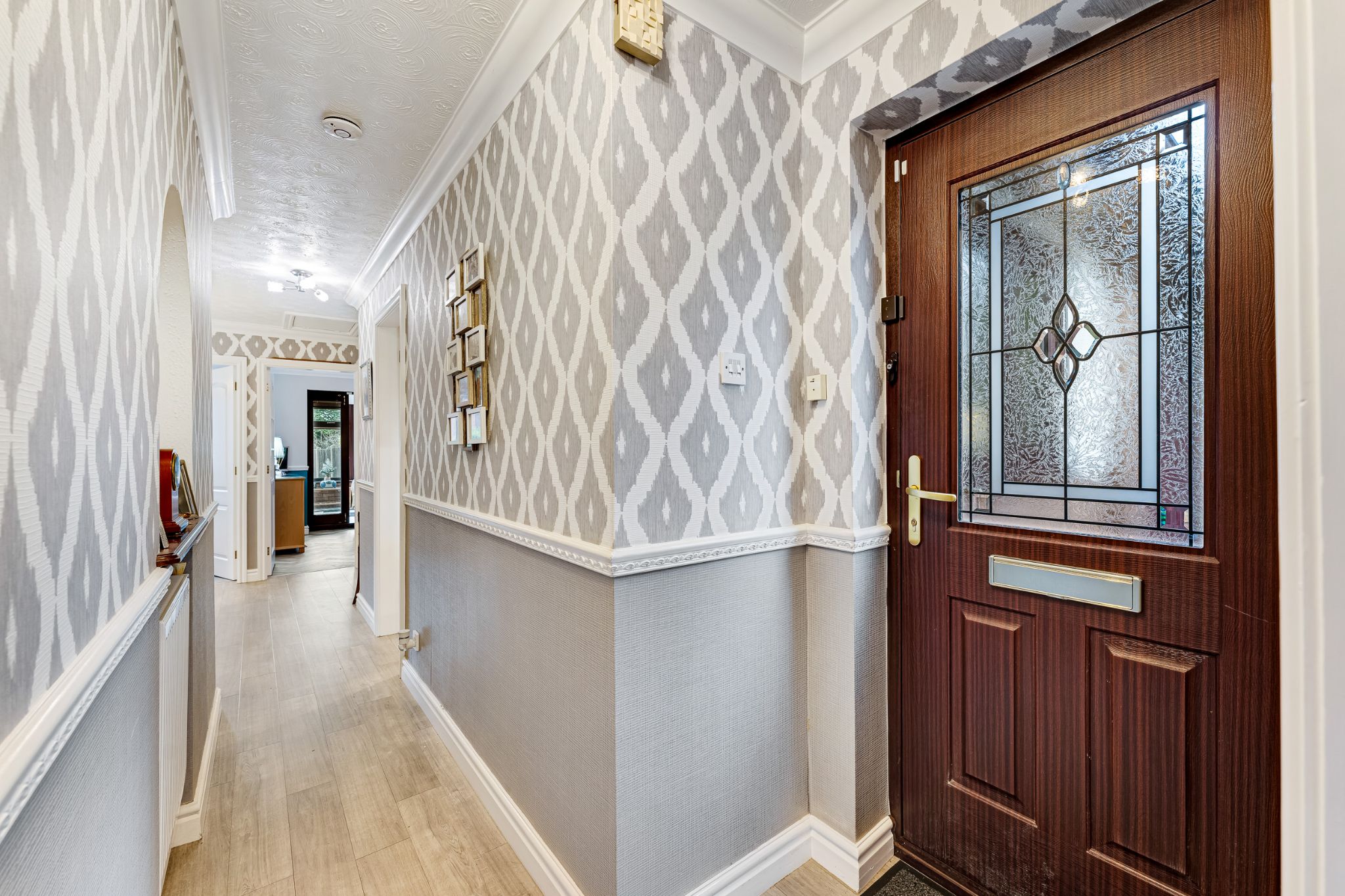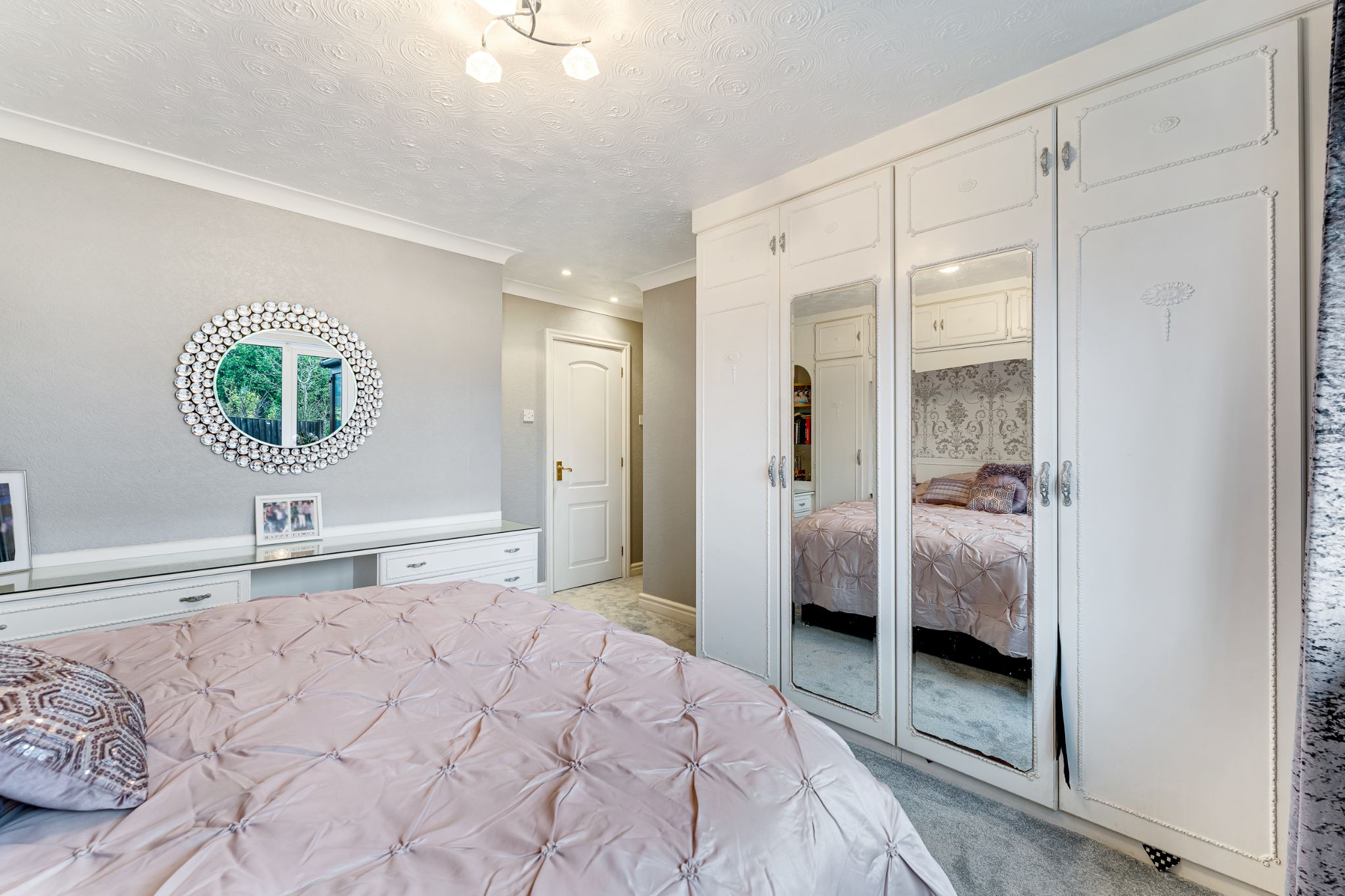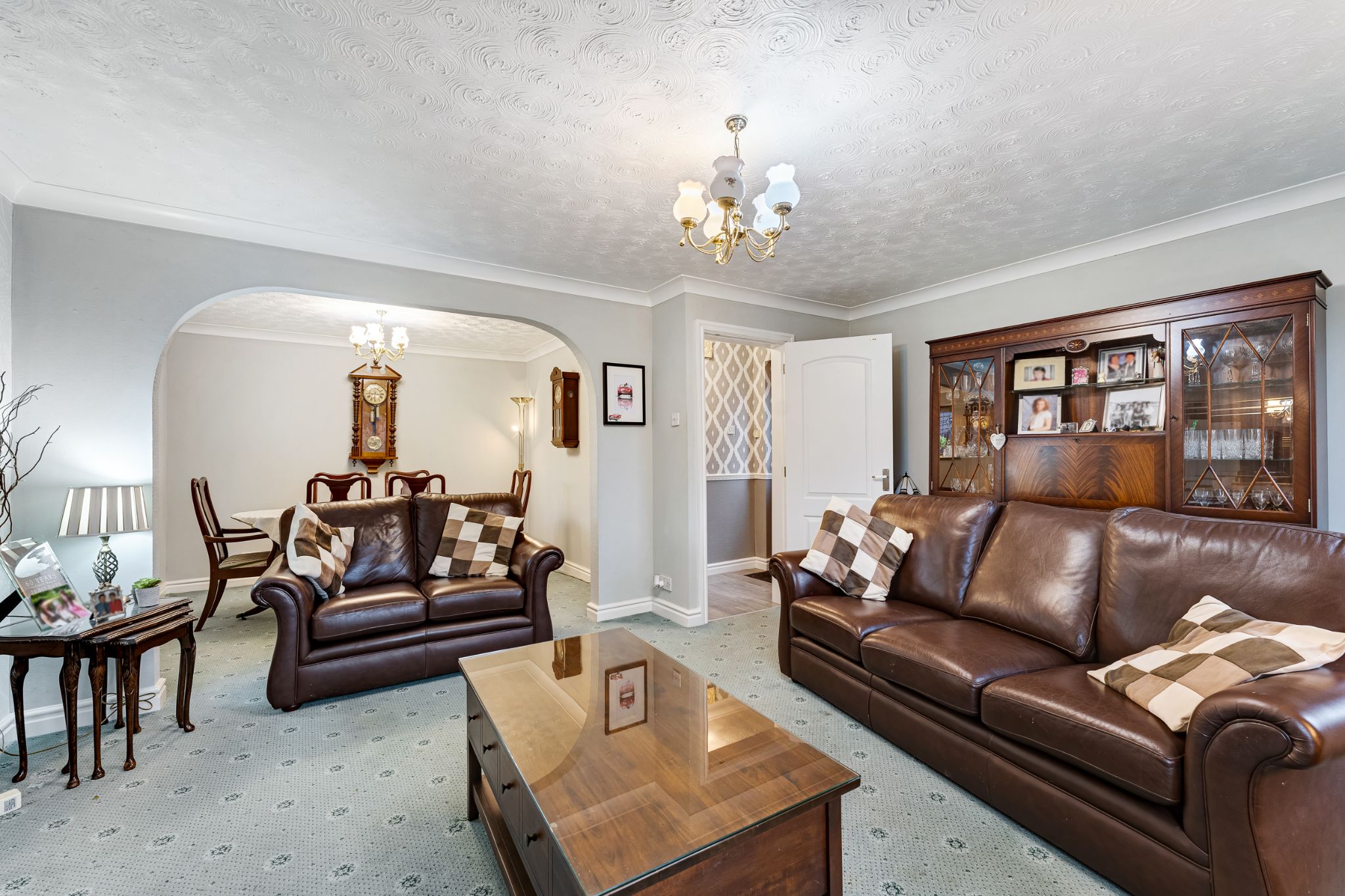 The hallway connects you to three bedrooms and the bathroom towards the rear of the home. The master bedroom is a great size with fitted furniture and a fully tiled en-suite with W.C., pedestal basin and enclosed shower. Bedroom two is a double size also with fitted wardrobes and offers leafy views to the rear garden. Bedroom three, currently used as a second lounge, has patio doors opening up to a large conservatory with an insulated roof - a lovely spot to enjoy a morning coffee. The main bathroom has fully tiled elevations in contemporary tones, with a vanity basin, bath, W.C. and chrome heated towel rail.