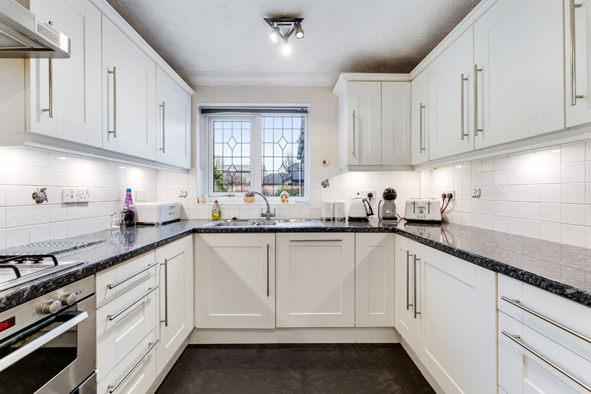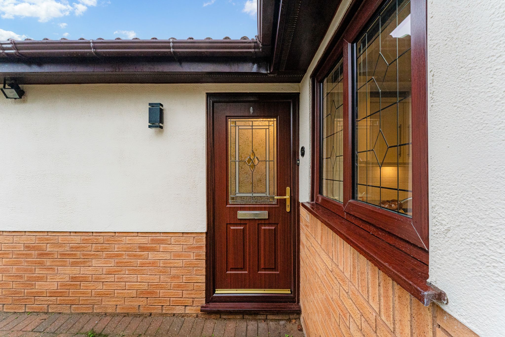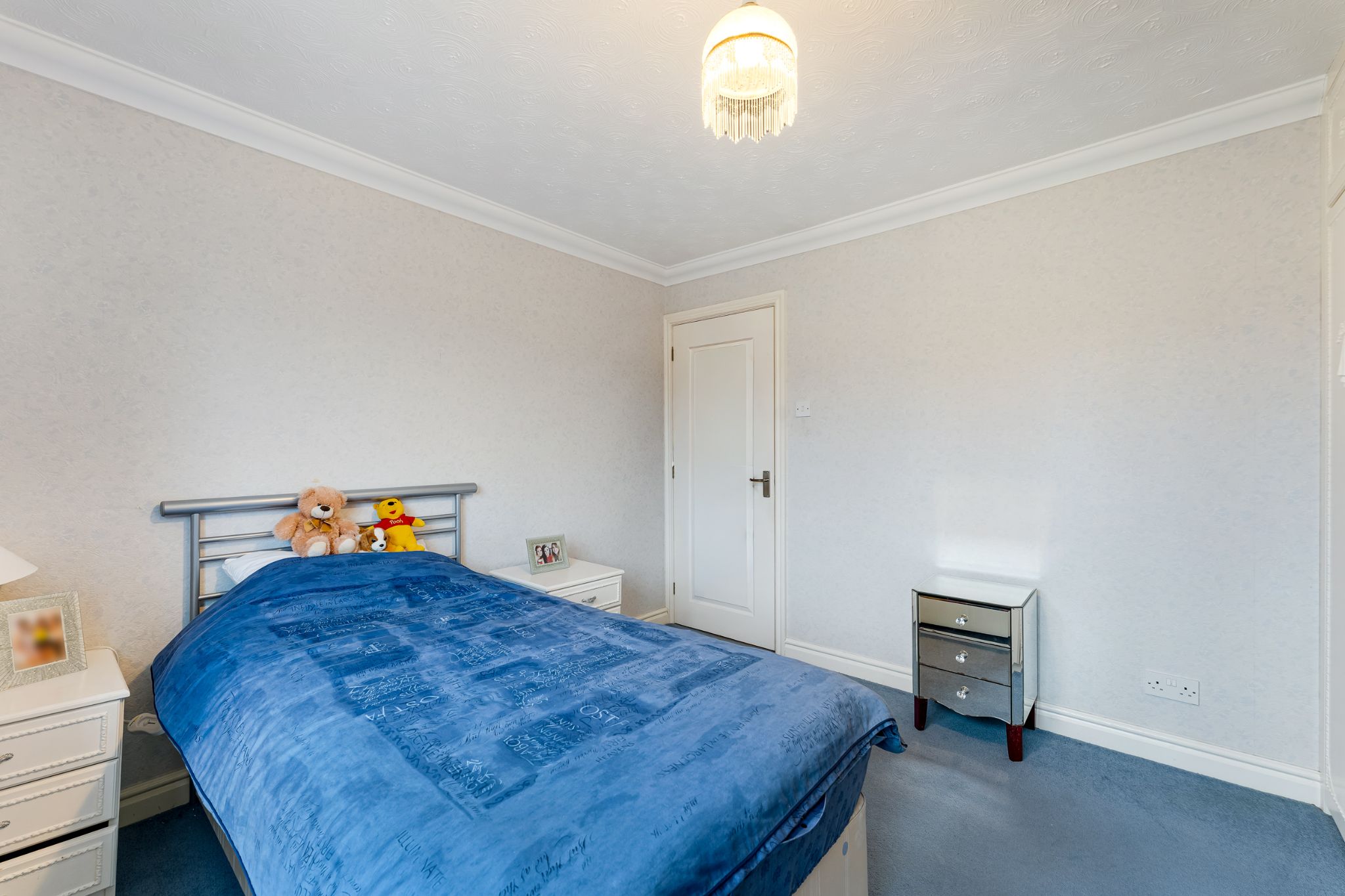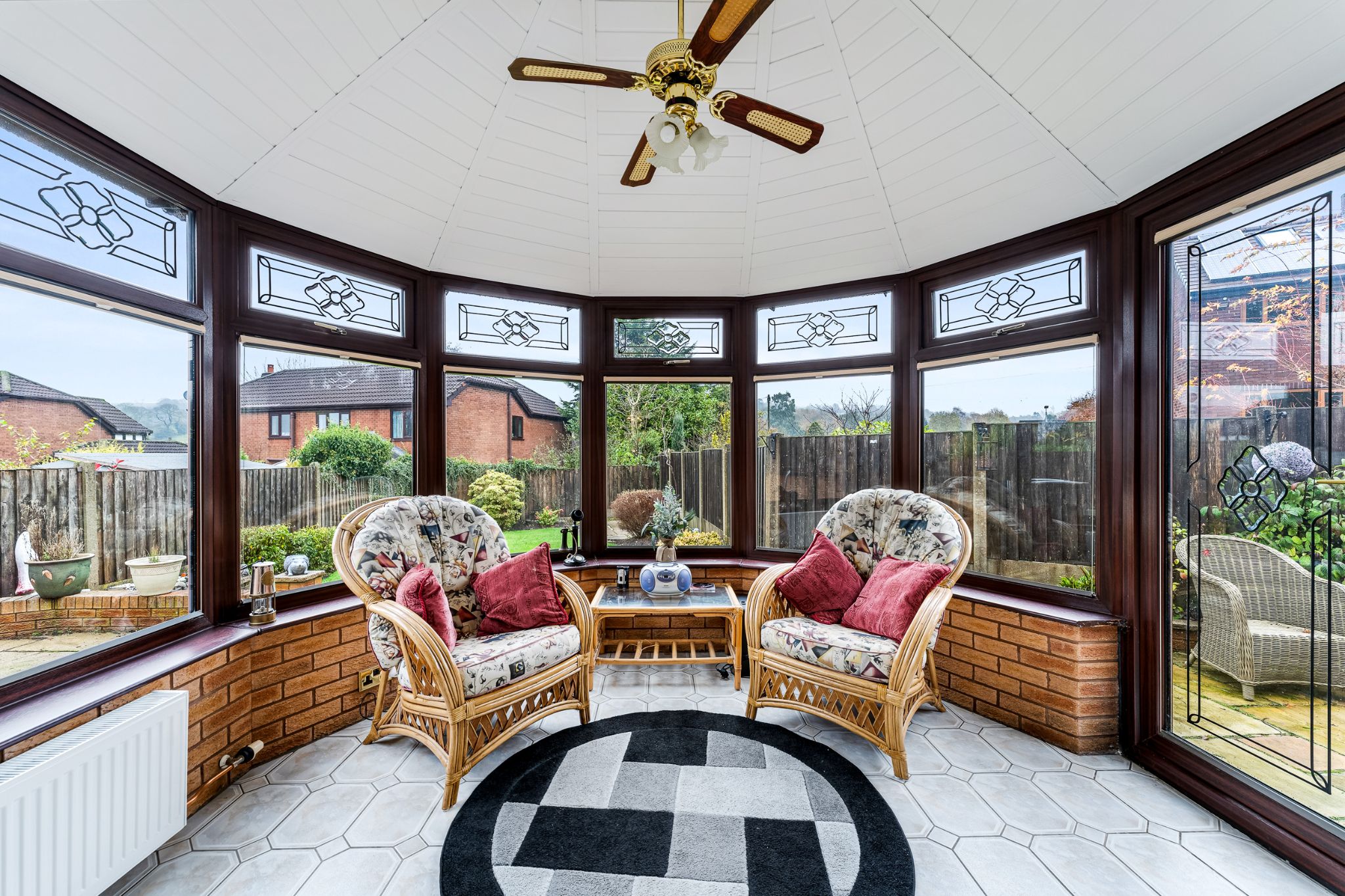The hallway connects you to three bedrooms and the bathroom towards the rear of the home. The master bedroom is a great size with fitted furniture and a fully tiled en-suite with W.C., pedestal basin and enclosed shower. Bedroom two is a double size also with fitted wardrobes and offers leafy views to the rear garden. Bedroom three, currently used as a second lounge, has patio doors opening up to a large conservatory with an insulated roof - a lovely spot to enjoy a morning coffee. The main bathroom has fully tiled elevations in contemporary tones, with a vanity basin, bath, W.C. and chrome heated towel rail.