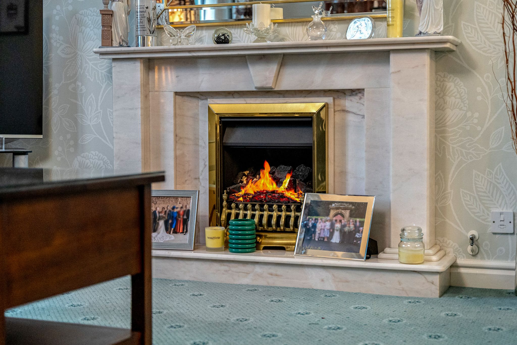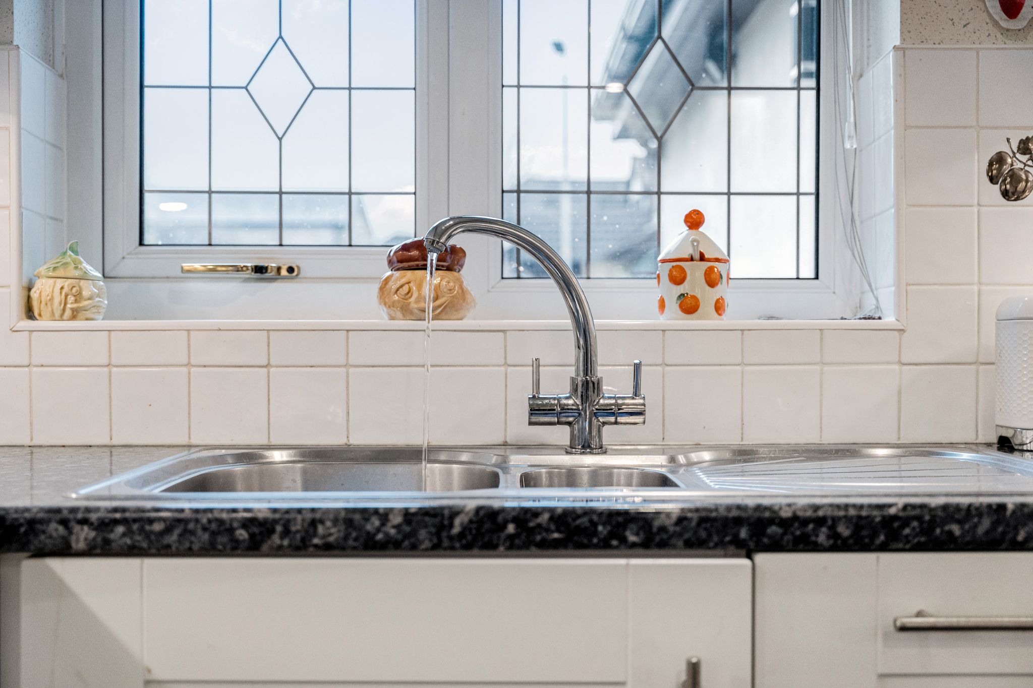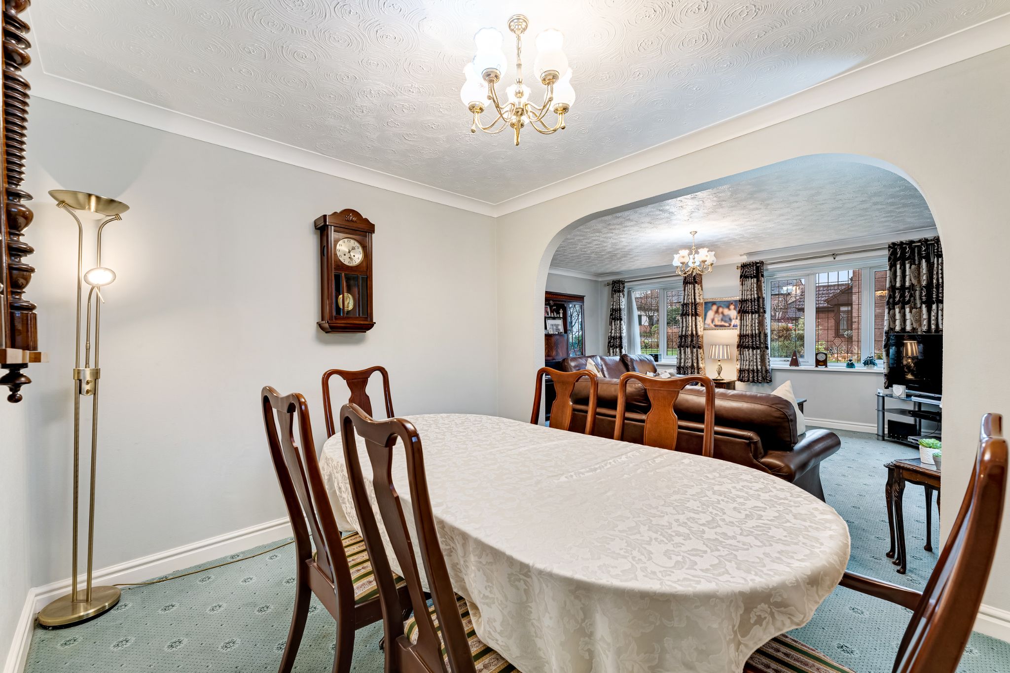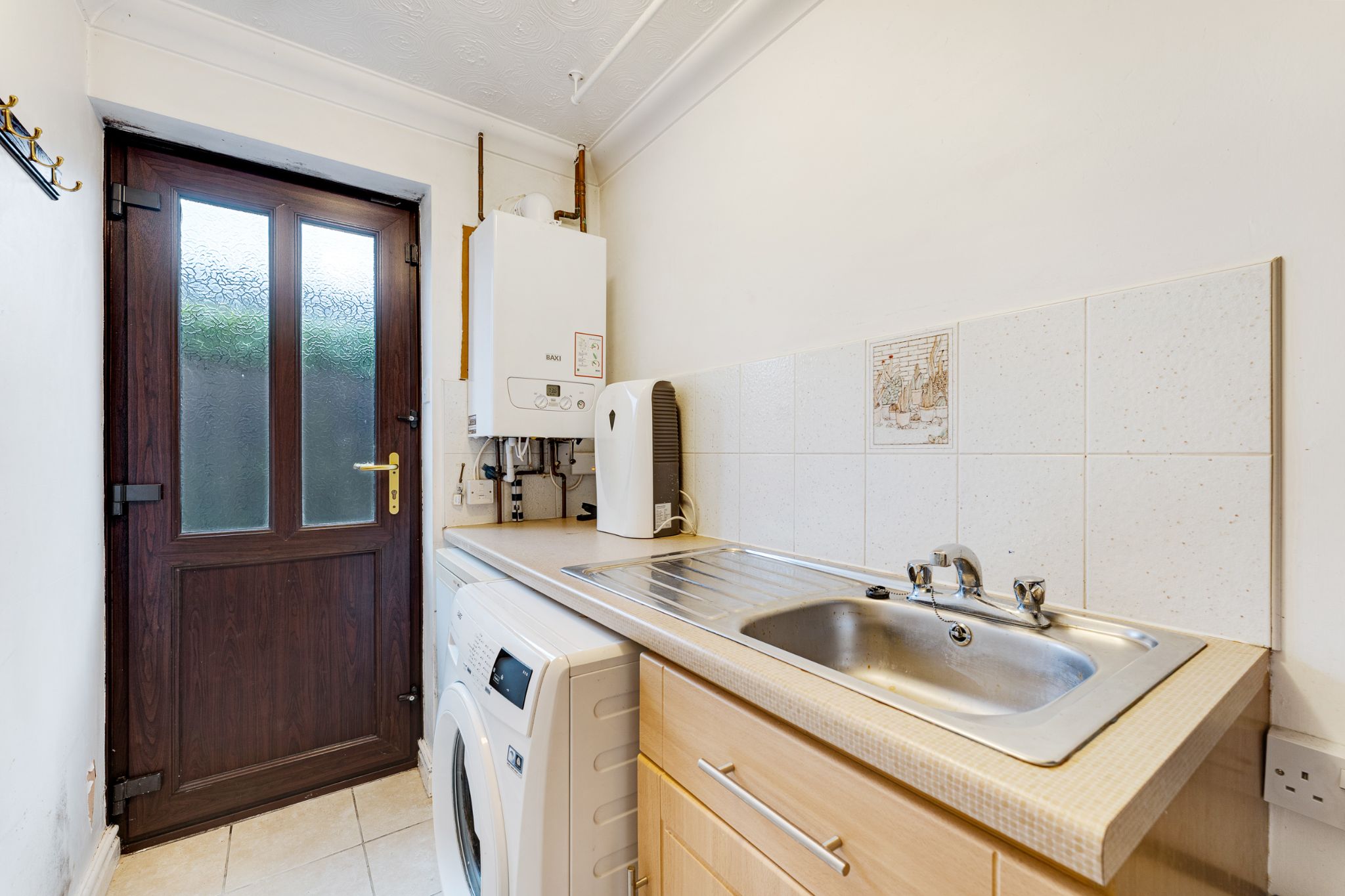 Into your welcoming entrance hallway. To the left there is a good-sized lounge with two windows, filling the space with natural light and a feature fireplace. An open archway leads through to the dining room, which could be converted into an additional bedroom if required. Continuing through the hallway to the kitchen which has white wall and base units, integrated appliances including an oven, grill, 4-ring gas hob, extractor fan, dishwasher and a breakfast bar. Across from the kitchen there is a handy utility room with storage units, a stainless steel sink and plumbing for a washing machine. There is a side door that leads to the rear garden for convenience.