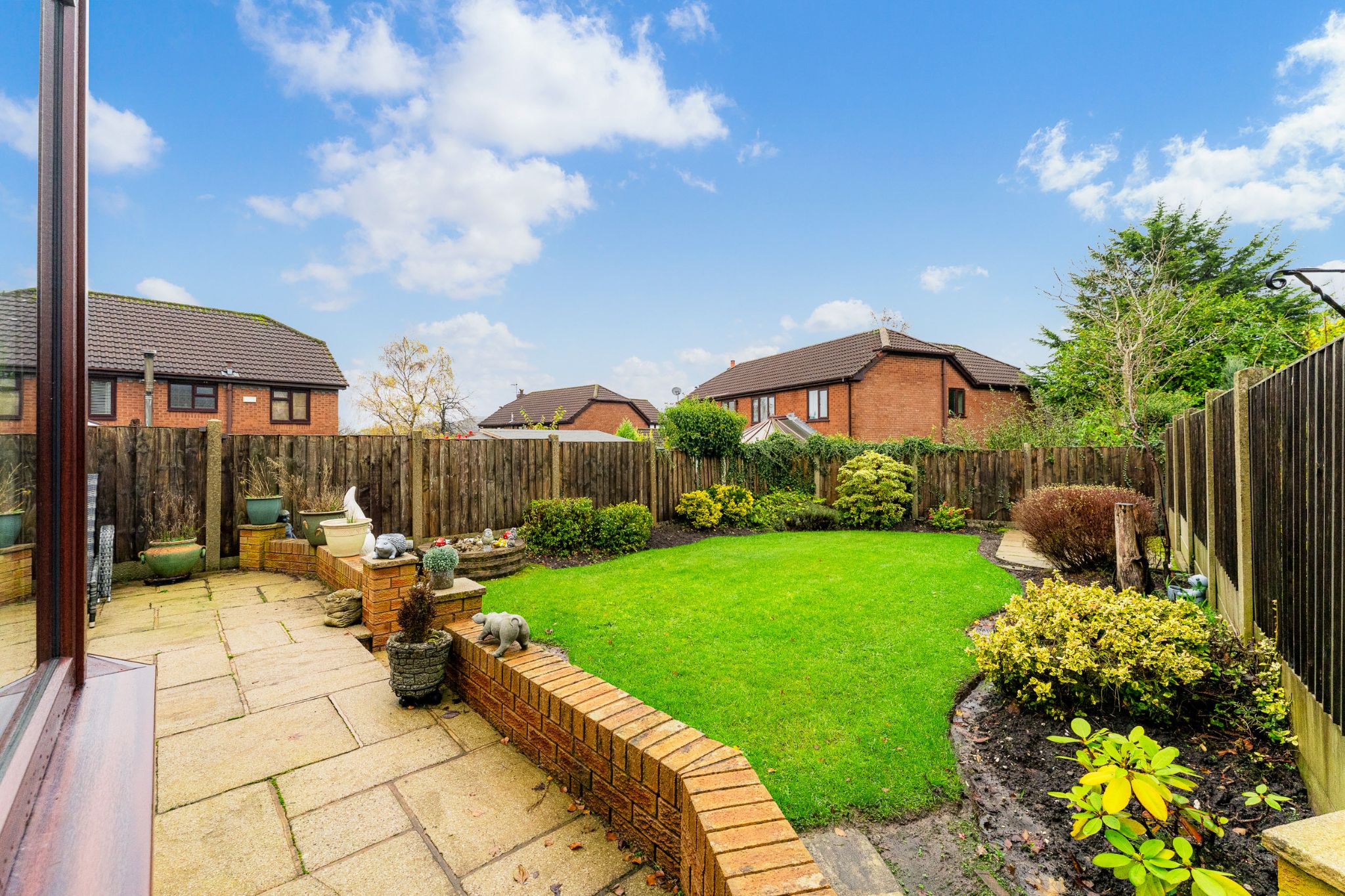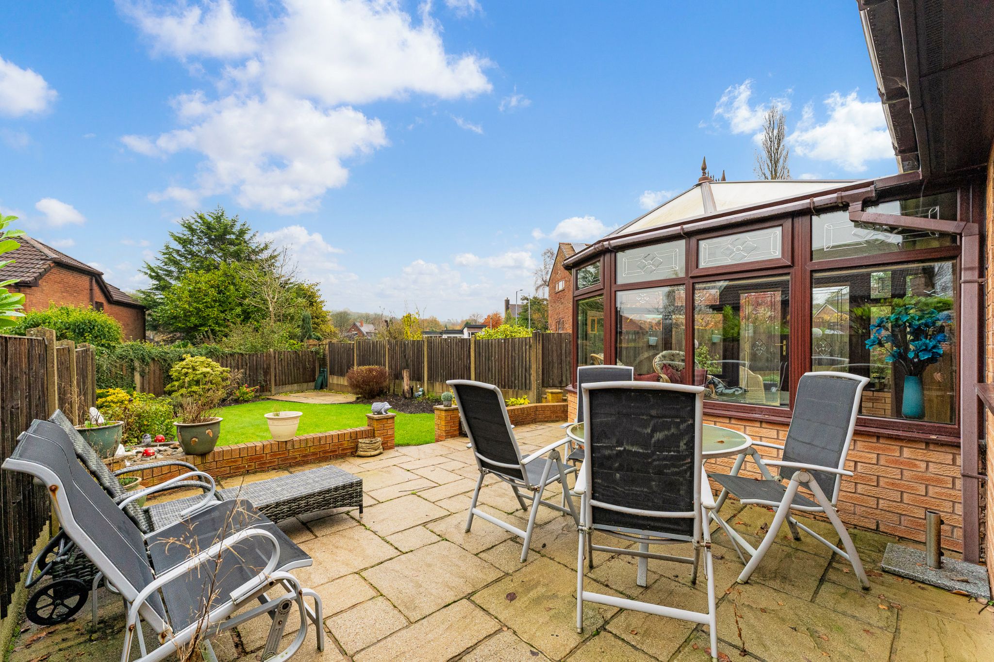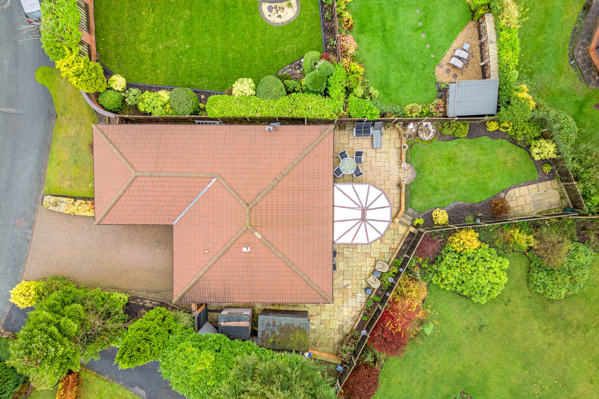 Step out of the conservatory on to a large flagged patio which has plenty of space to set up your outdoor furniture. Steps lead down to a manicured lawn, surrounded by mature flowerbeds. The patio continues around the side of the home, where a shed offers additional storage and a secure pedestrian gate leads to the driveway. Due to the generous size of this plot, there is scope to extend the home or driveway if desired (subject to any necessary planning permissions). To the front of the home is a neat front garden, block paved driveway and large garage with an up and over door.