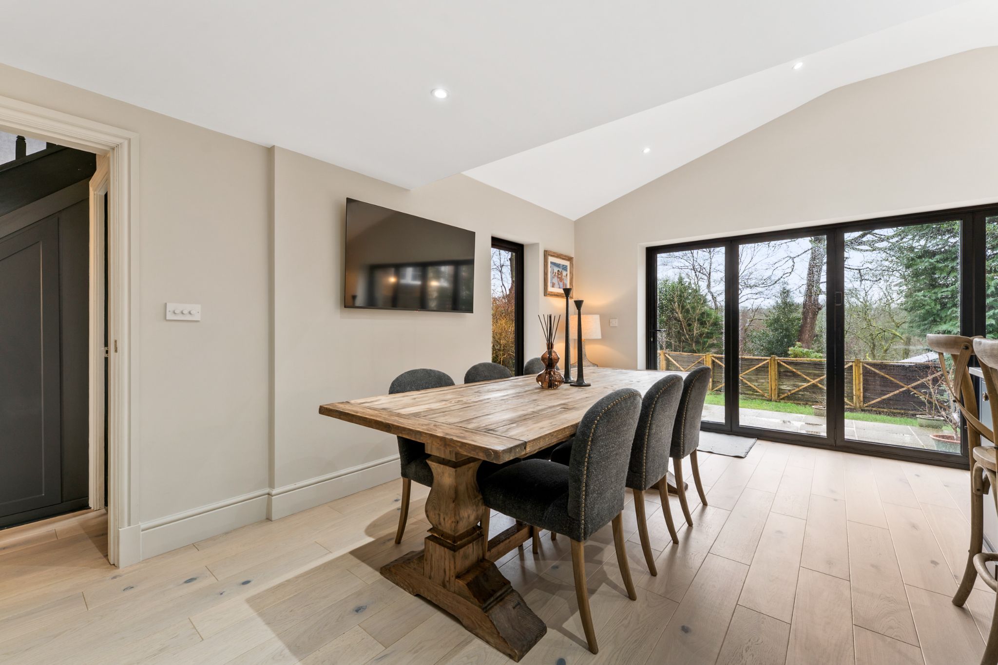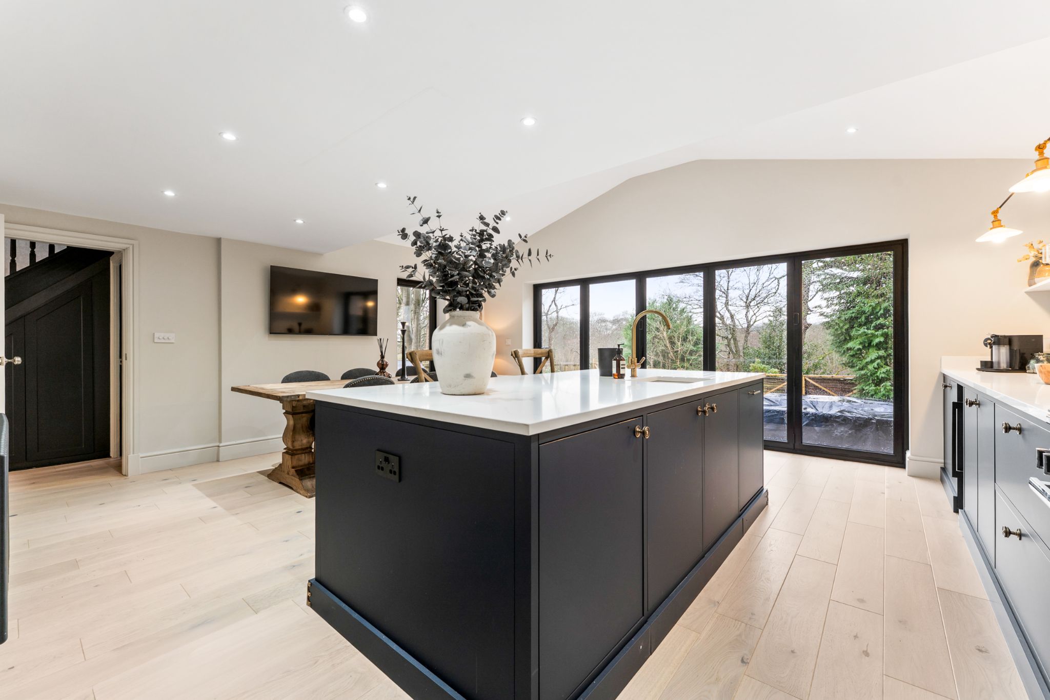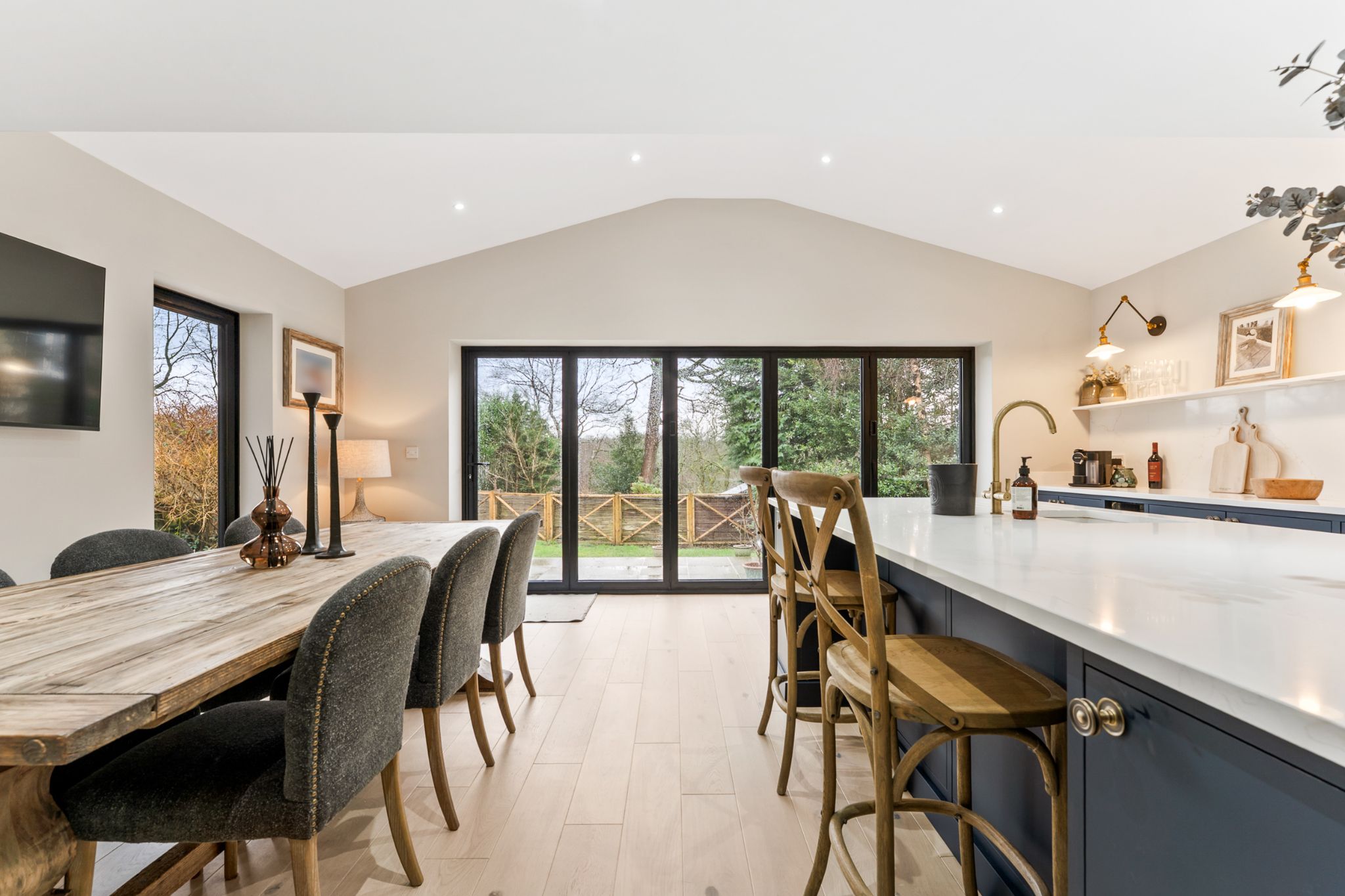 Enter into the spacious entrance hallway featuring understairs storage perfect for your coats and shoes and with engineered oak flooring that flows throughout the ground floor. To your left, is the beautifully appointed lounge that enjoys a dual aspect windows overlooking both the front and rear gardens, while a log burner creates a warm and inviting focal point. Positioned opposite is a versatile second reception room, currently used as a snug but equally suited to use as a home office, playroom or additional sitting room. Continuing through the hallway, you’ll find the impressive extended kitchen-diner — a superb family and entertaining space. Large bi-folding doors open seamlessly onto the rear garden, flooding the room with natural light. The kitchen is fitted with stylish navy base units complemented by marble quartz worktops, and benefits from an island with extra storage, a breakfast bar and plenty of space for a dining table. Integrated appliances include a dishwasher, under counter fridge, extractor hood, wine/drinks fridge, and an instant hot water mixer tap. Just off the kitchen is a generous utility room, converted from part of the garage and fit with stone wall and base units, a stainless steel sink with mixer tap, space for a large fridge freezer, and plumbing for a washing machine and dryer. The recently installed boiler is also housed here. A convenient downstairs WC completes the ground floor, convenient for guests.