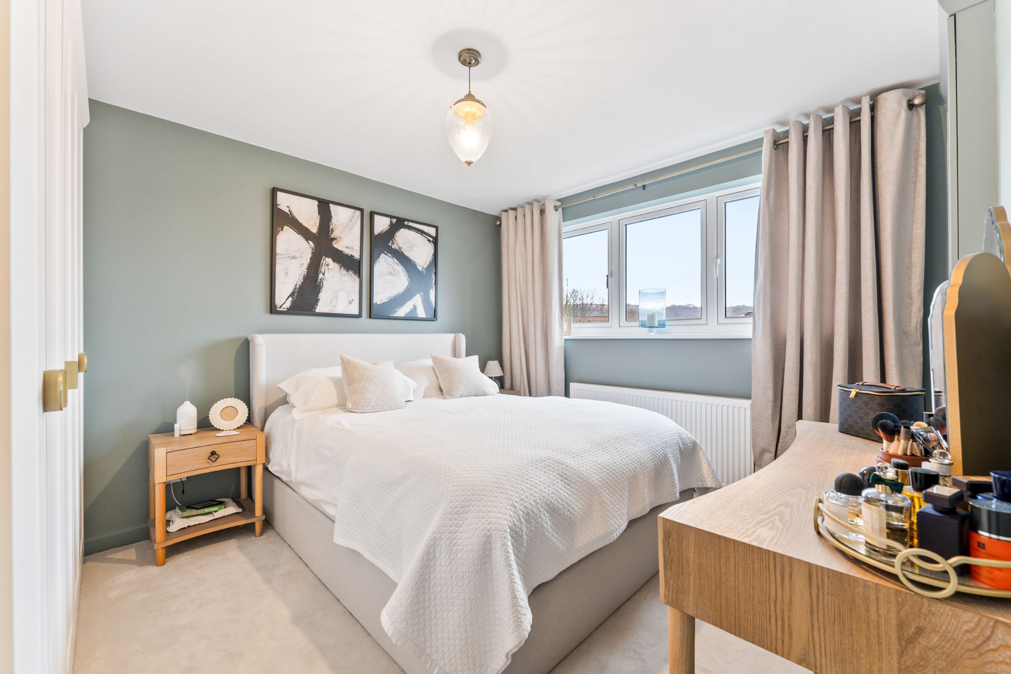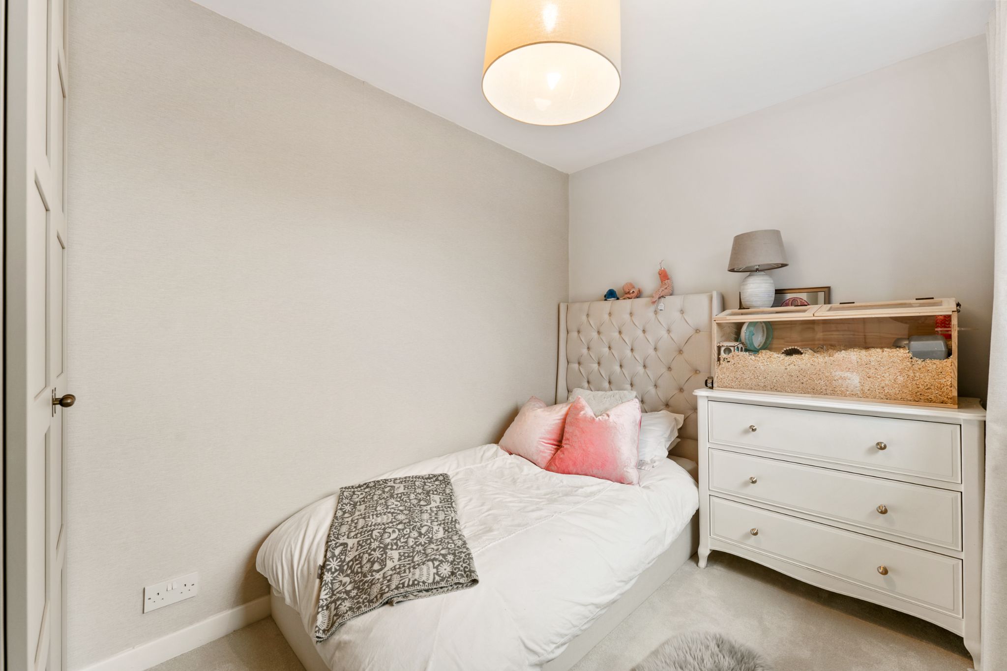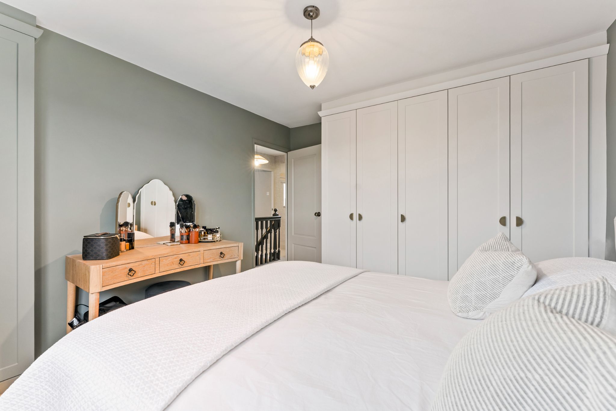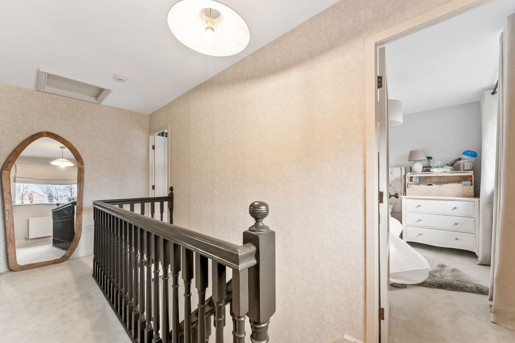 The landing provides access to three well-proportioned bedrooms and the family bathroom. The master bedroom is positioned to the front of the property and benefits from fitted wardrobes, along with a built-in storage cupboard finished with elegant gold hardware. Bedroom two also enjoys built-in storage, while bedroom three is a generous single room offering views over the rear garden and adjoining woodland. The stylish three-piece family bathroom has been thoughtfully designed and fully tiled in neutral tones. It features a contrasting wood vanity unit with basin, WC, built-in tiled wall shelving, and a bath complete with both overhead and handheld shower fittings, finished with classic Burlington taps.