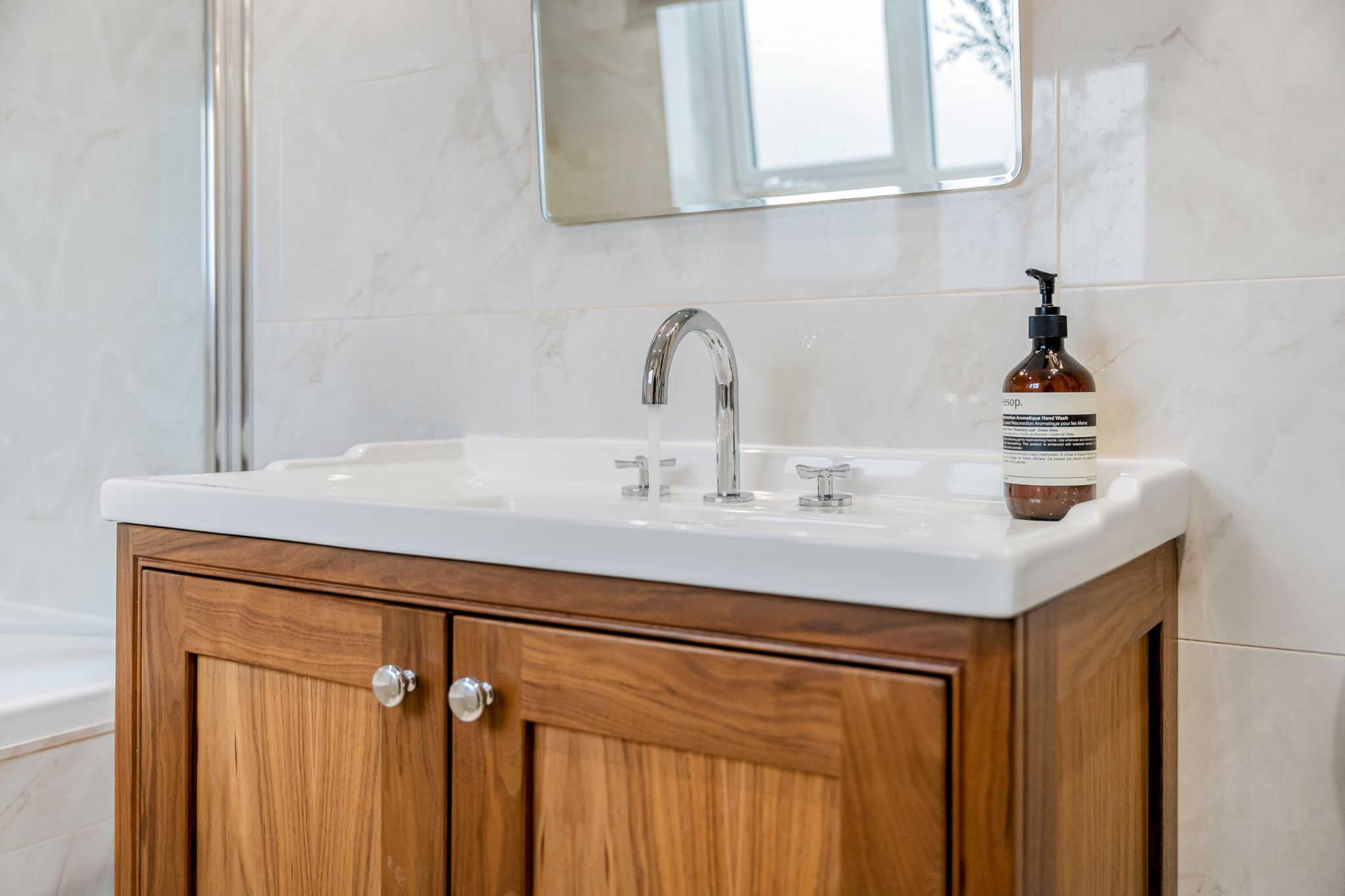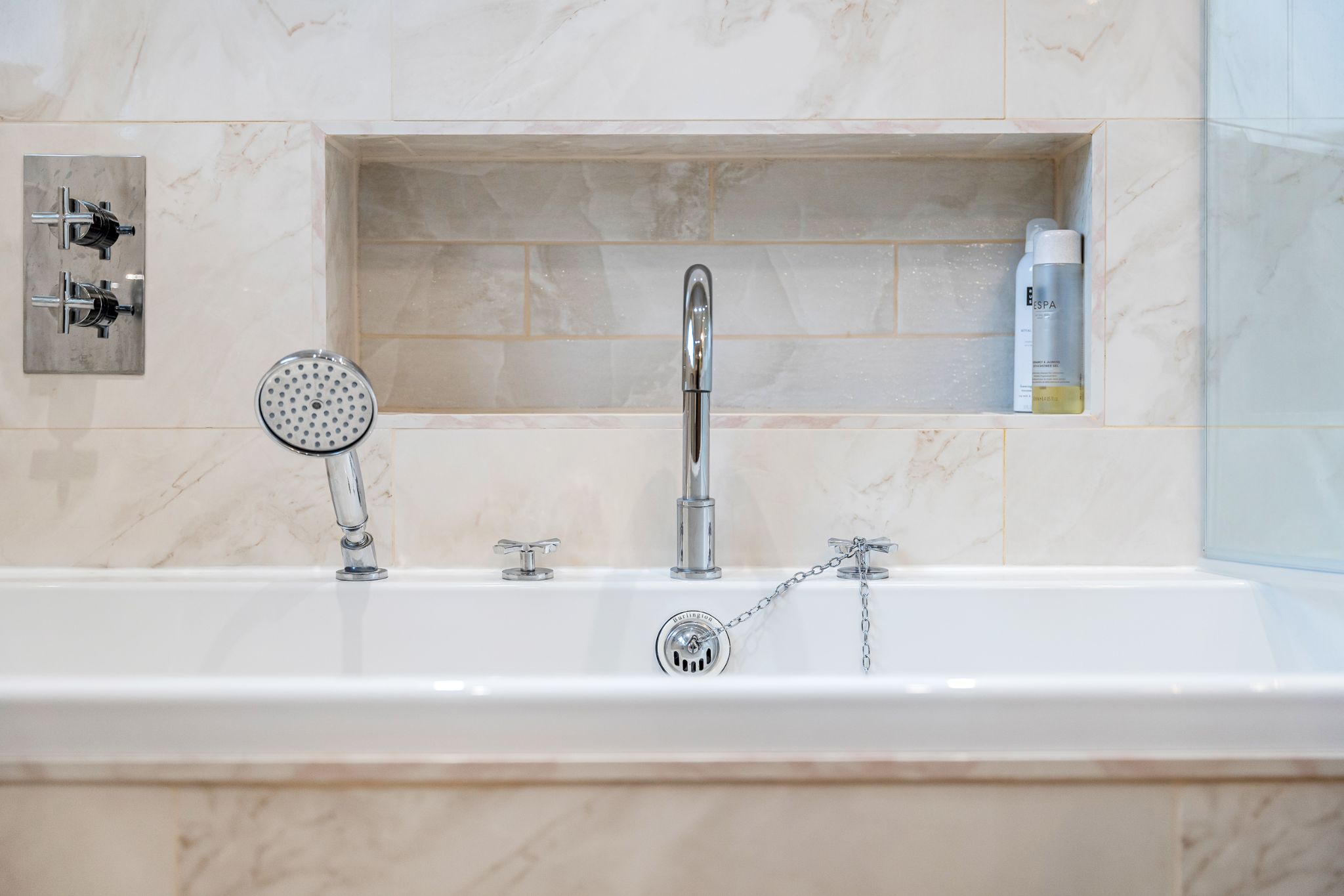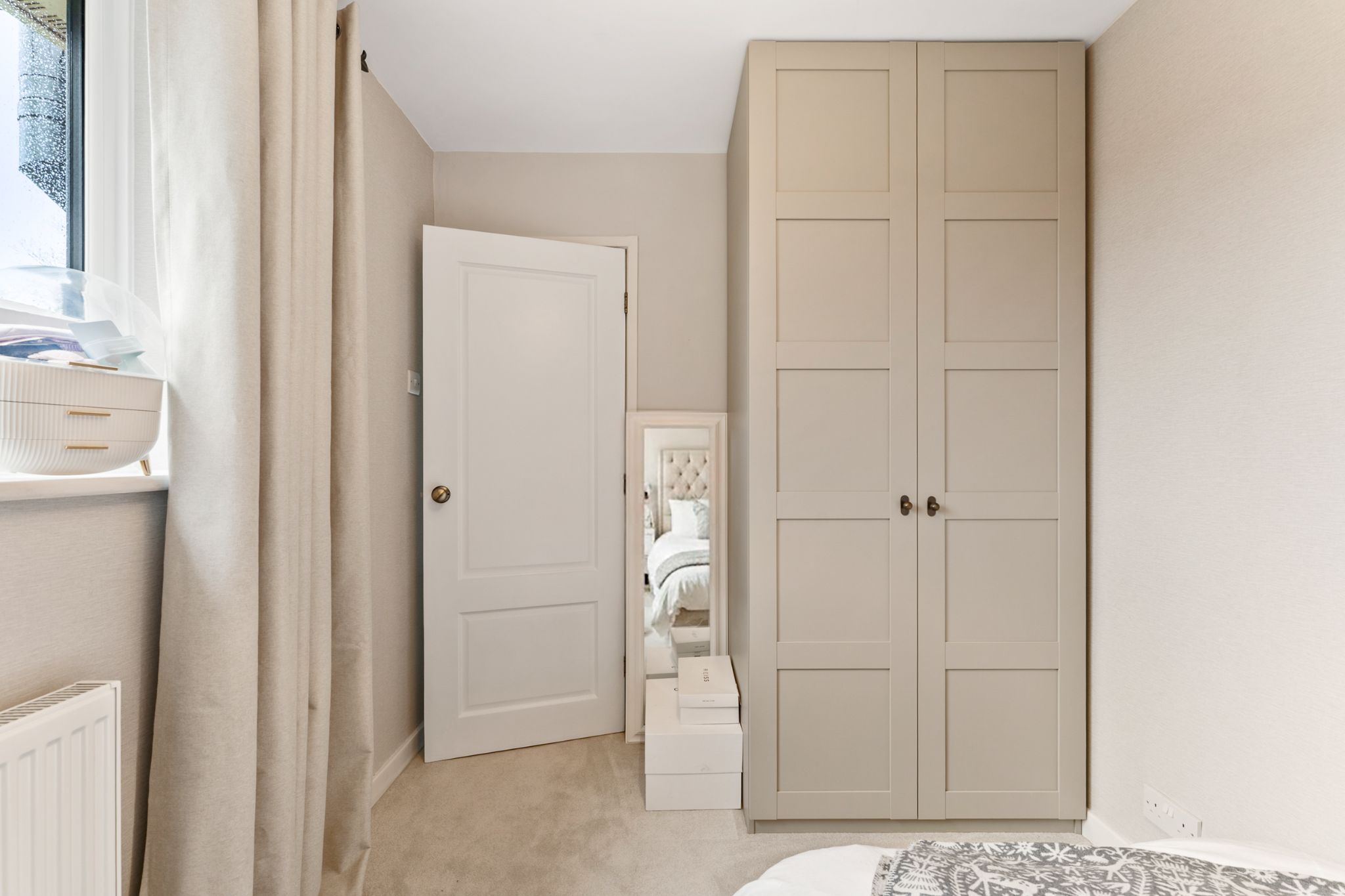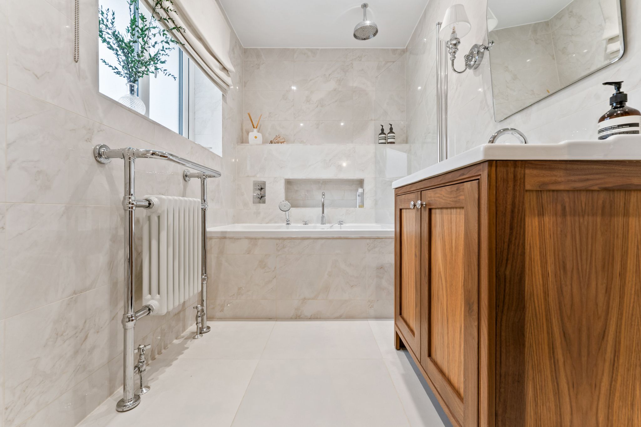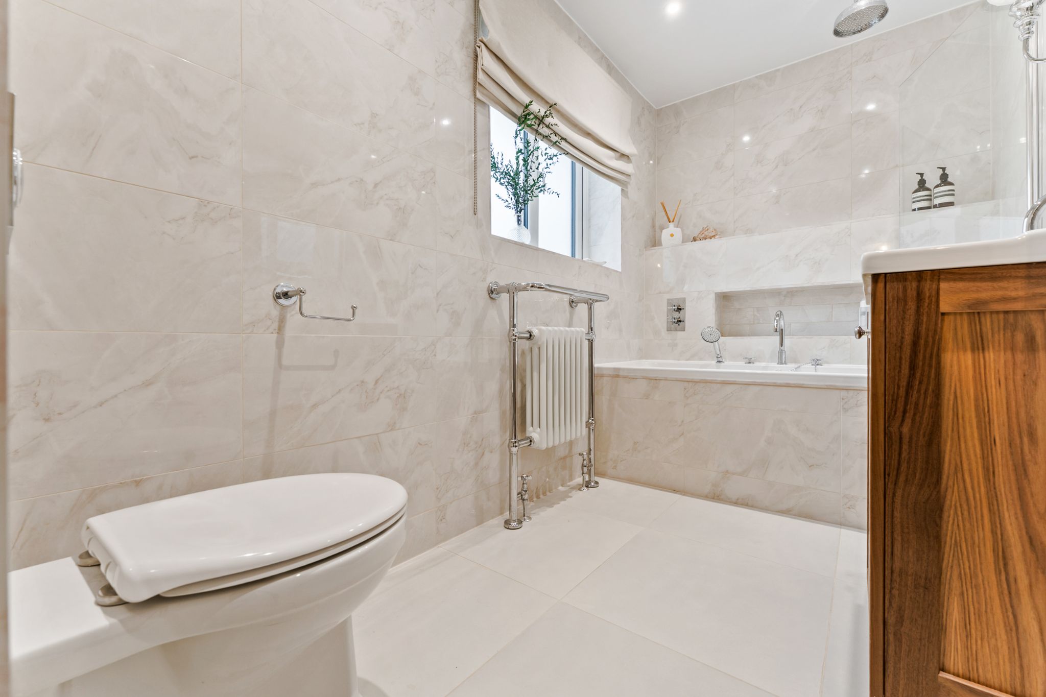 The landing provides access to three well-proportioned bedrooms and the family bathroom. The master bedroom is positioned to the front of the property and benefits from fitted wardrobes, along with a built-in storage cupboard finished with elegant gold hardware. Bedroom two also enjoys built-in storage, while bedroom three is a generous single room offering views over the rear garden and adjoining woodland. The stylish three-piece family bathroom has been thoughtfully designed and fully tiled in neutral tones. It features a contrasting wood vanity unit with basin, WC, built-in tiled wall shelving, and a bath complete with both overhead and handheld shower fittings, finished with classic Burlington taps.