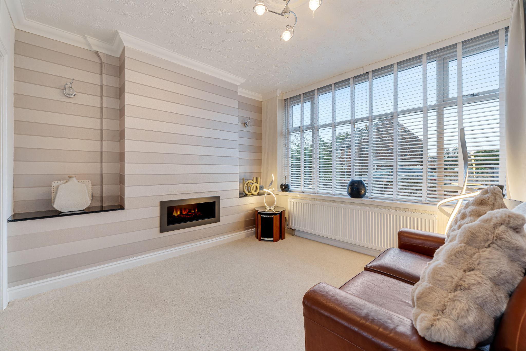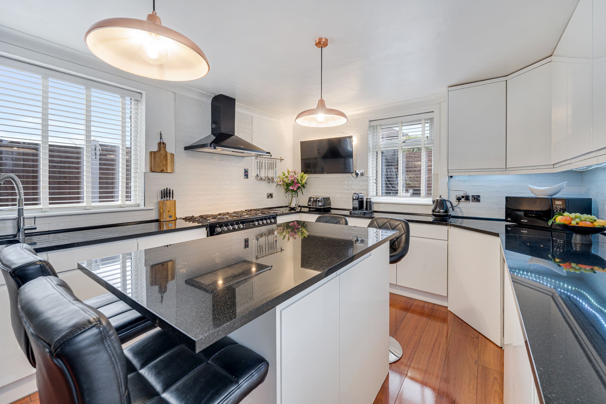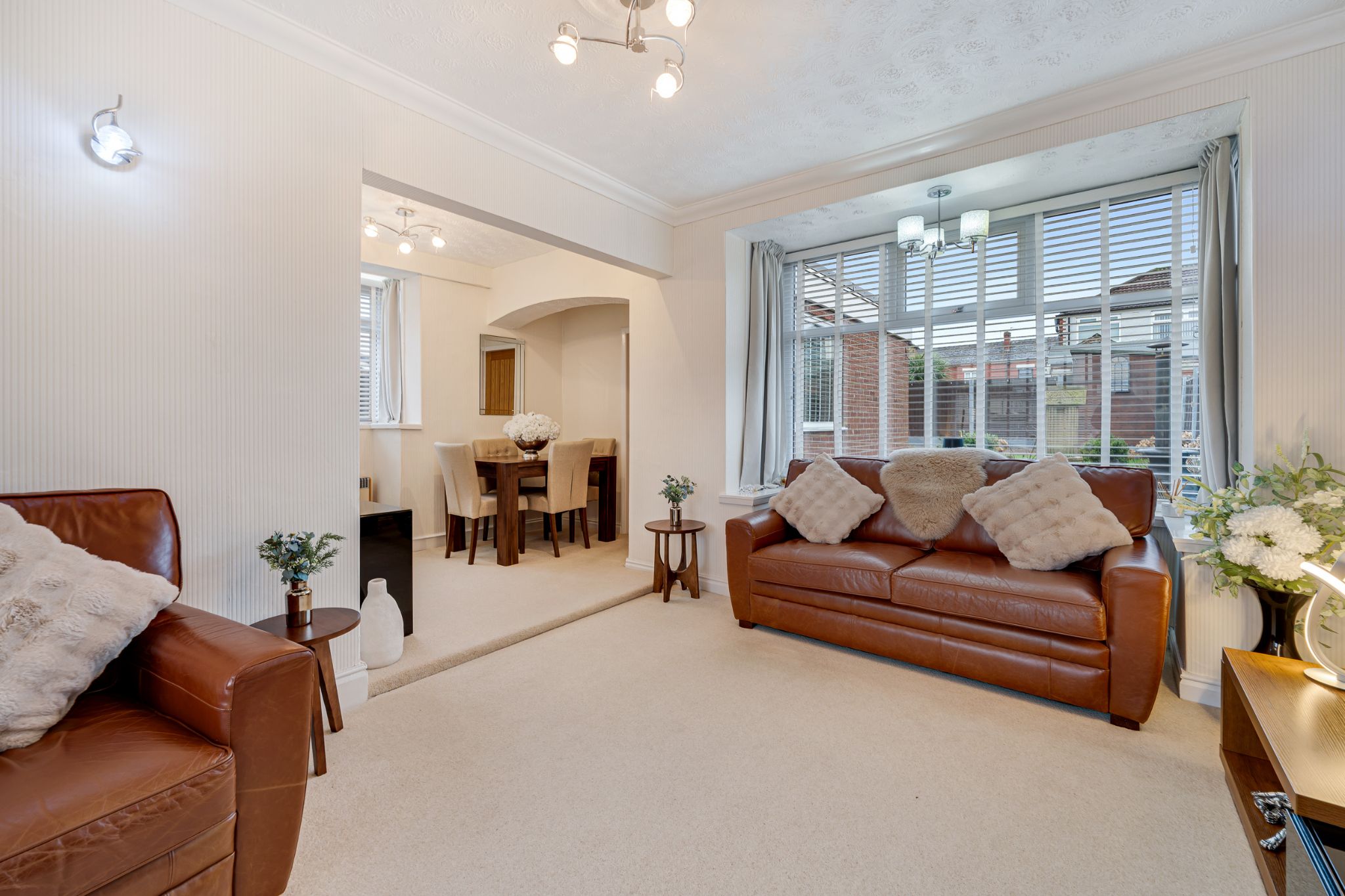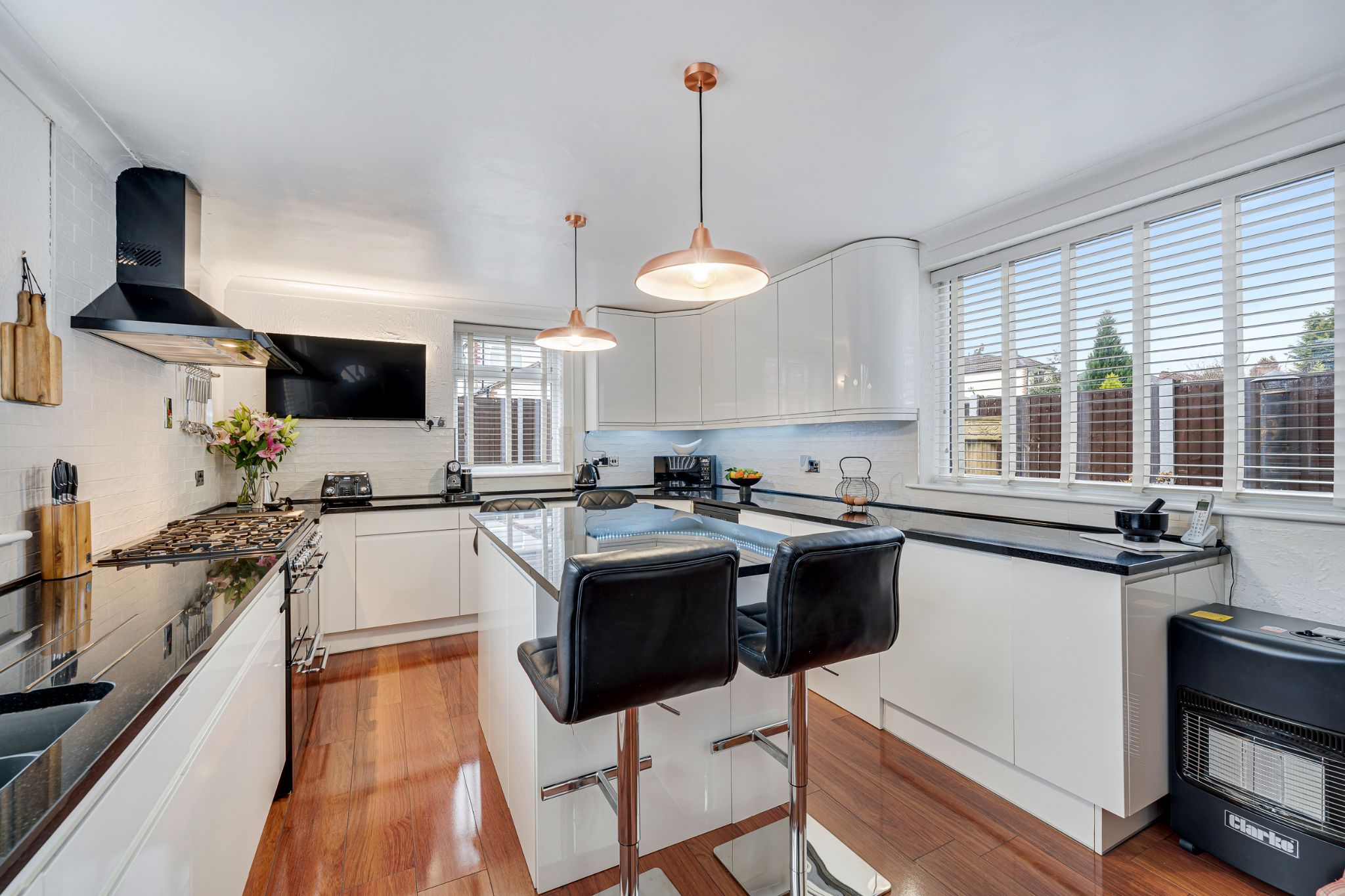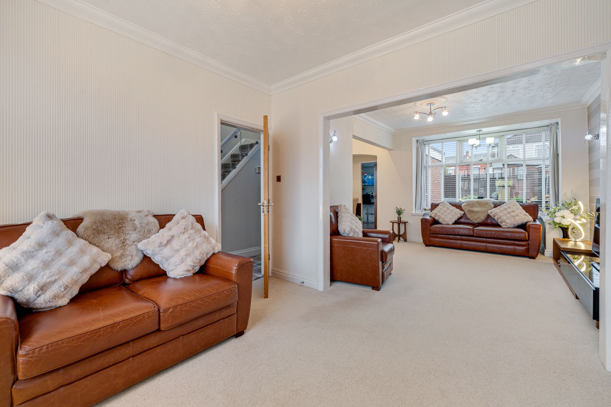 Step into the welcoming entrance vestibule, leading through to the hallway where a practical storage cupboard provides space for coats and shoes, and a newly installed boiler is neatly housed beneath the stairs. To the left, the impressive open-plan lounge-diner offers a bright and airy living space with two beautiful bay windows, and a feature fireplace — perfect for cosy evenings in. The dining area comfortably accommodates a table along with additional furnishings, creating an ideal setting for both everyday living and entertaining. To the rear of the property, the extended kitchen is fit with white gloss wall and base units. Appliances include an extractor hood and a freestanding Leisure double range oven with hob, with further space for a dishwasher, washing machine and fridge freezer. A central island provides additional workspace and casual seating — the perfect spot to enjoy your morning coffee — while a rear door offers convenient access to the garage and enclosed rear garden.