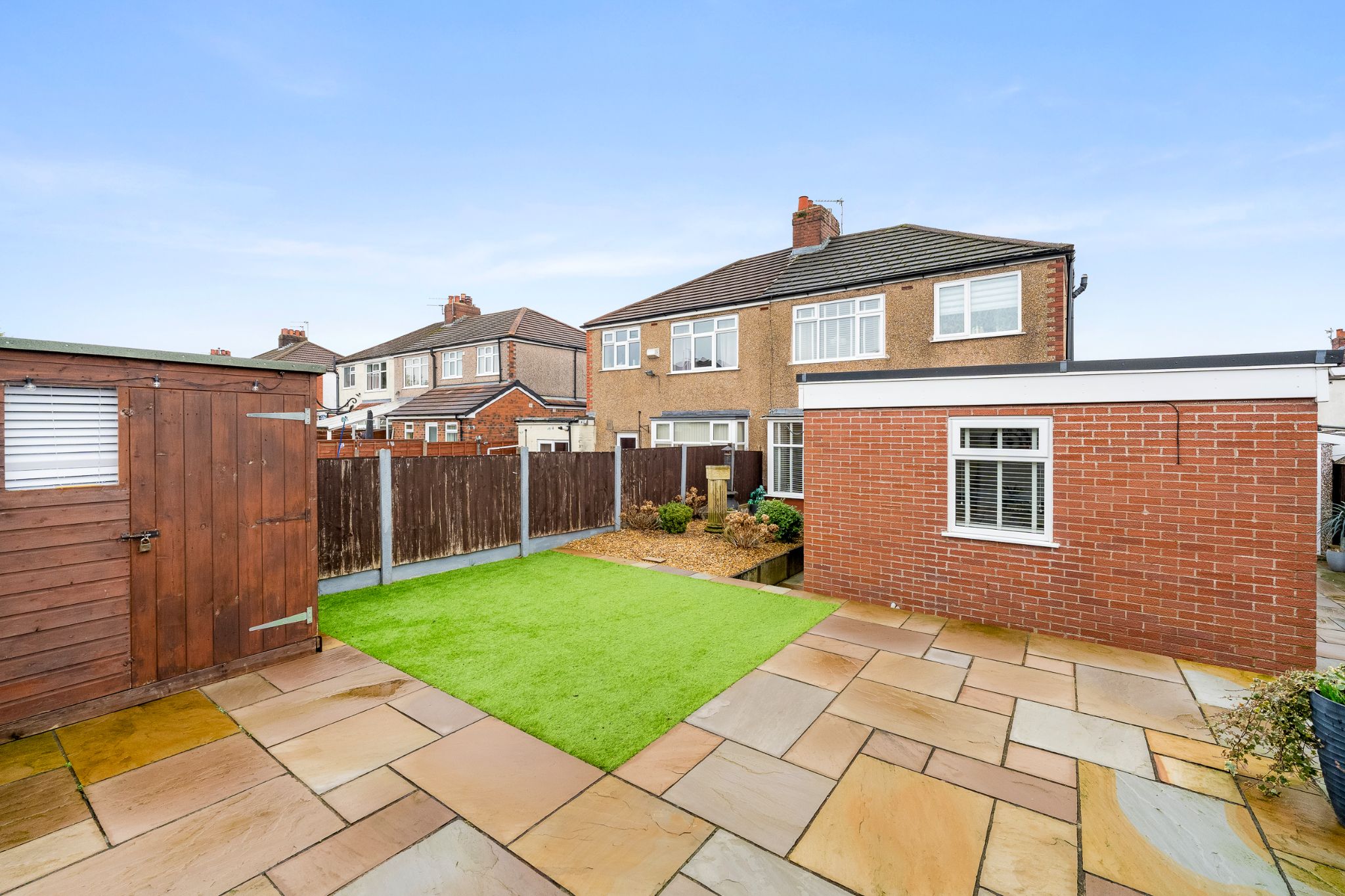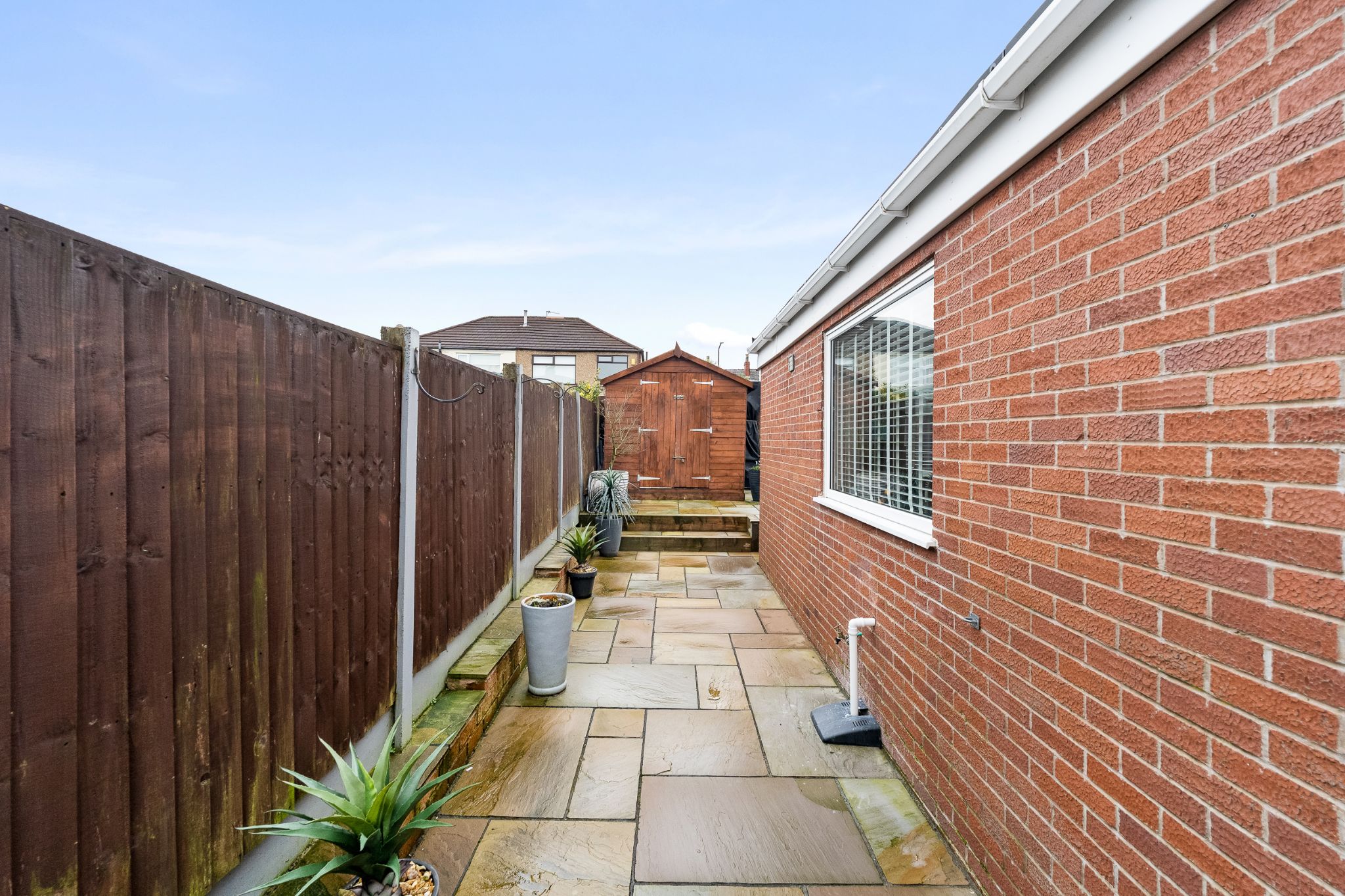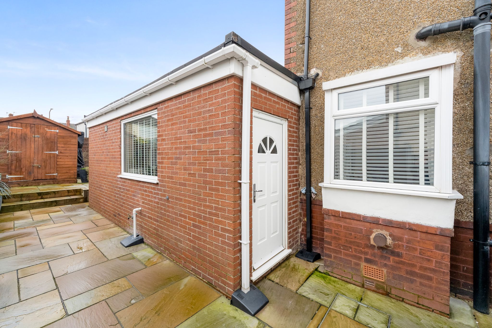 To the rear of the property, an enclosed garden provides a private and low-maintenance outdoor retreat. Indian stone flagging creates an excellent patio area for outdoor furniture and entertaining, complemented by an astro turf lawn and plenty of space for planting and gardening. Two useful storage sheds are positioned either side of the garden, one of which benefits from an electrical supply. The property also benefits from a newly constructed garage, offering secure parking with additional storage space, a driveway for off-road parking and a low-maintenance front garden.