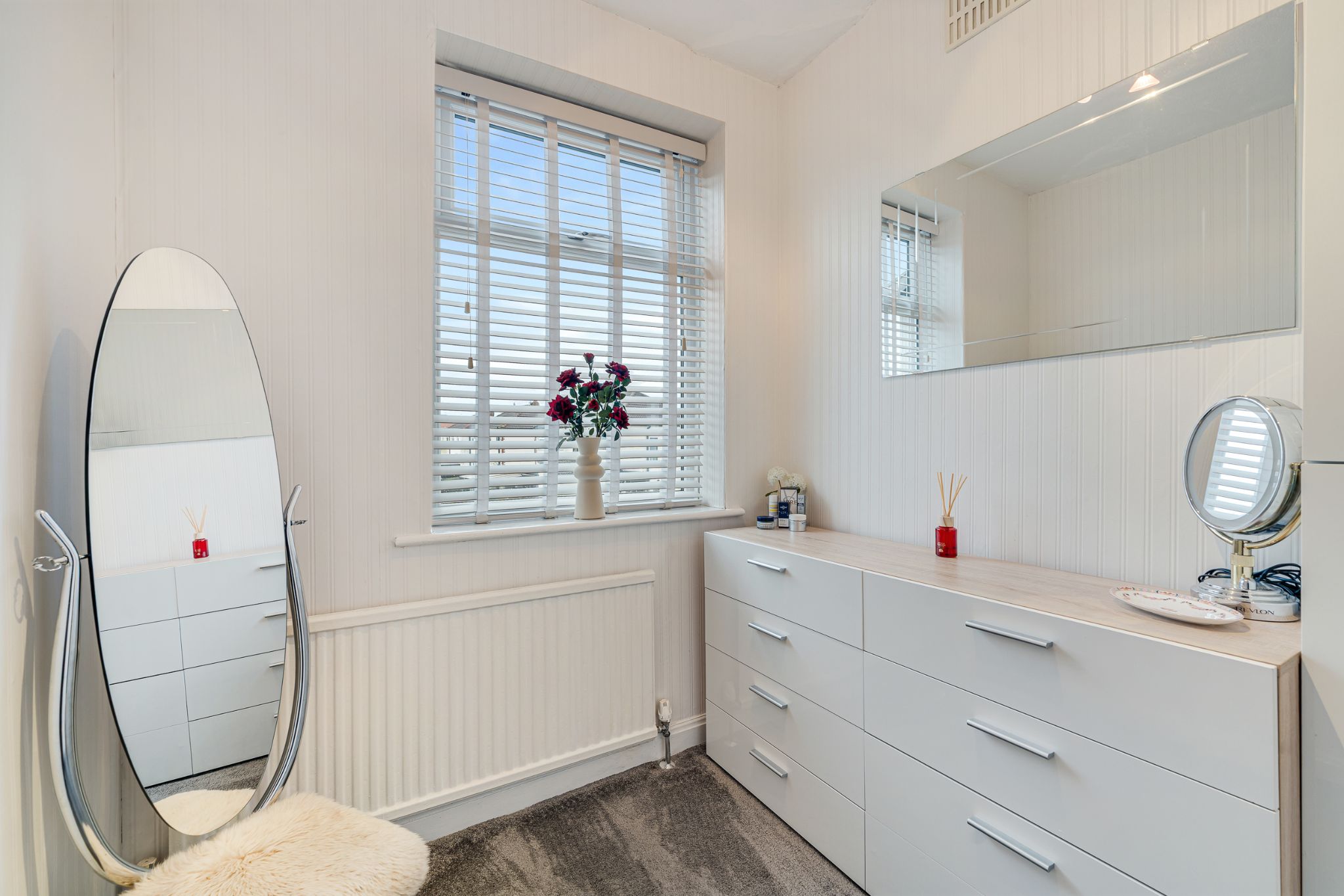 The master bedroom is positioned to the front of the property and features a bay window and fitted furniture providing excellent storage. Bedroom two is another well-proportioned double, also benefitting from fitted furniture. The third bedroom, currently used as a dressing room and offers versatile accommodation as a child’s bedroom or home office. The family bathroom is fully tiled in neutral tones and fit with an L-shaped bath with overhead shower, a contemporary elevated vanity basin, low-level W.C., and a chrome heated towel rail.