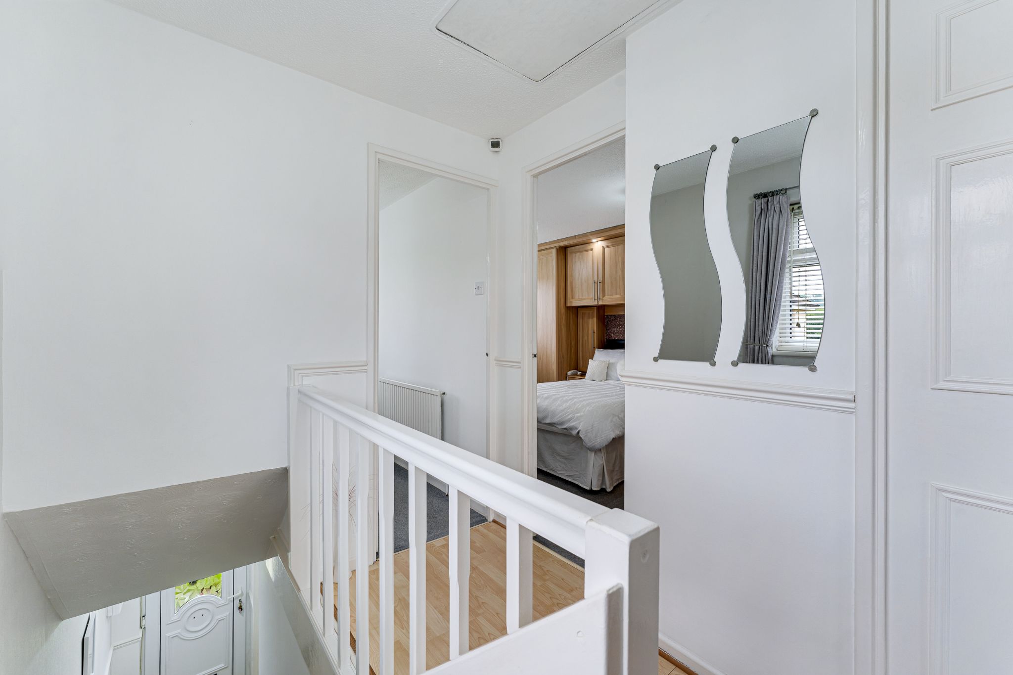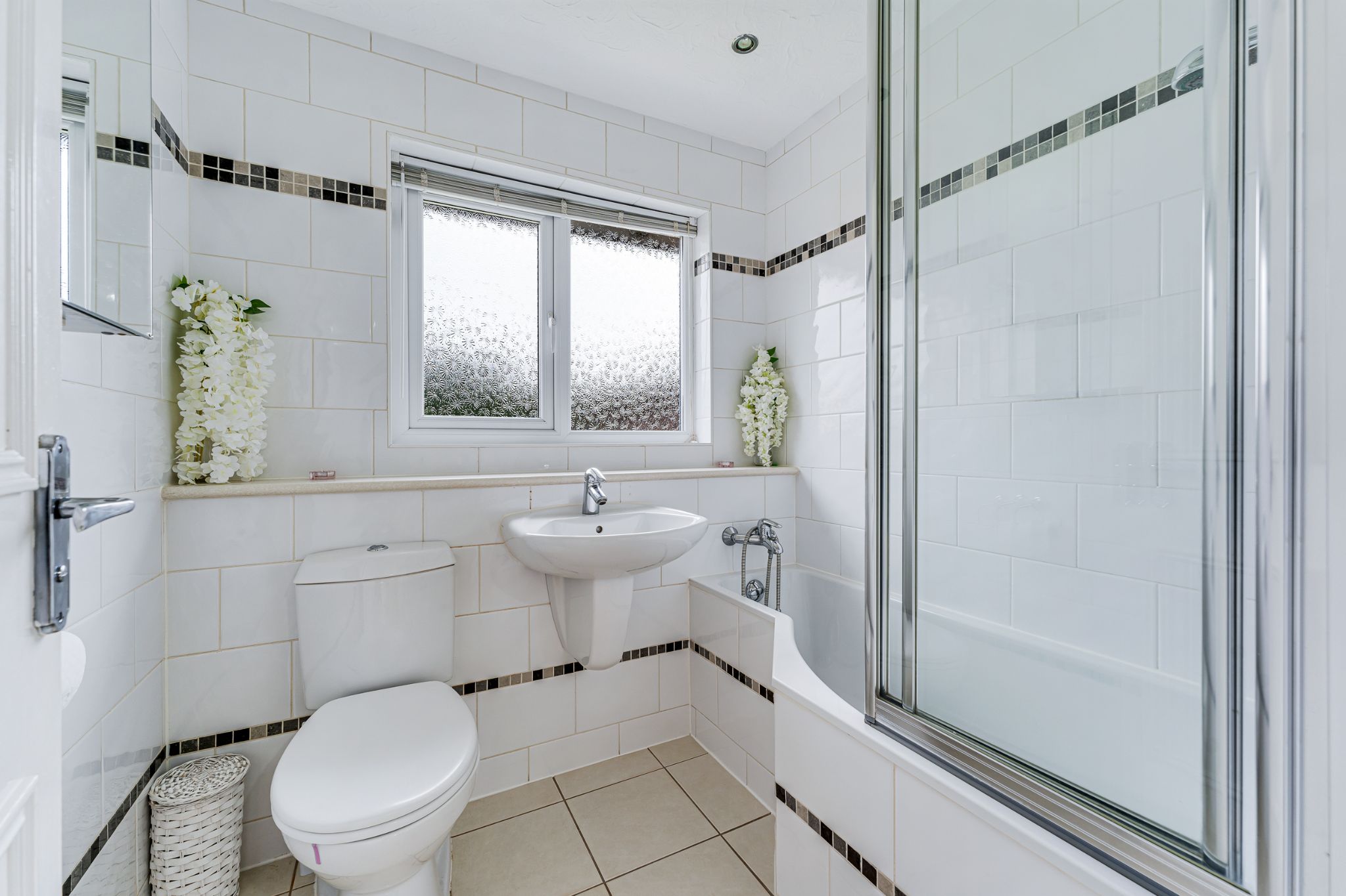Upstairs, three bedrooms and the family bathroom offer comfortable and well-organised living space for all the family, with access to the loft above providing valuable additional storage. The master bedroom sits to the front of the home and enjoys peaceful leafy views across to Eagley Nature Reserve. Bespoke fitted wardrobes ensure everything has its place, and one cleverly conceals a hidden dressing table - an elegant and practical touch. Bedroom two is another generous double, also benefiting from fitted white furniture, while the third bedroom is a comfortable single with a built-in wardrobe, making it ideal as a nursery, child’s bedroom or home office. Completing the first floor, the family bathroom is fully tiled in a sleek white finish and features a high-quality Villeroy & Boch suite including a wall-hung basin, W.C., shower over the bath and a stylish vertical radiator.