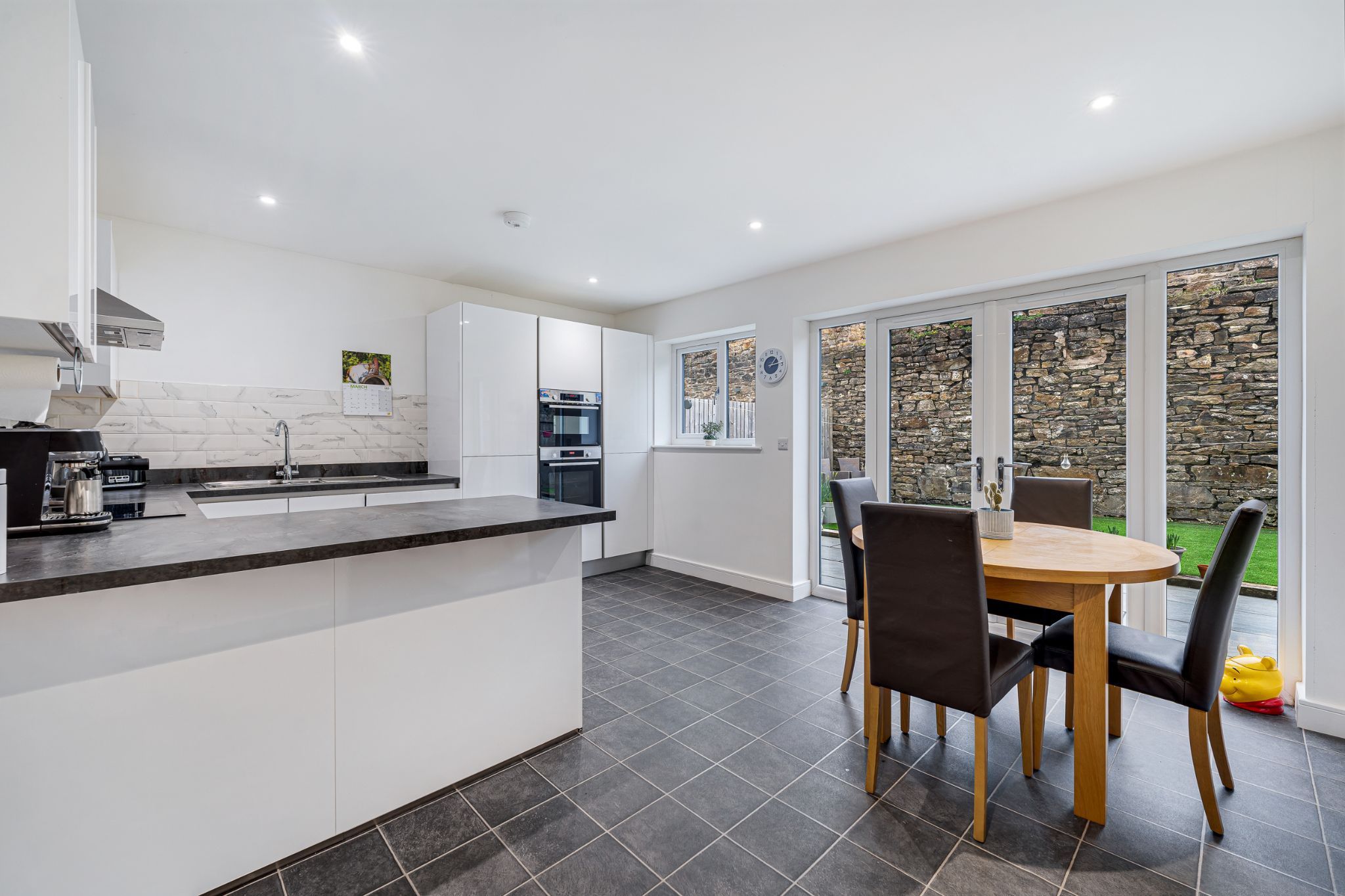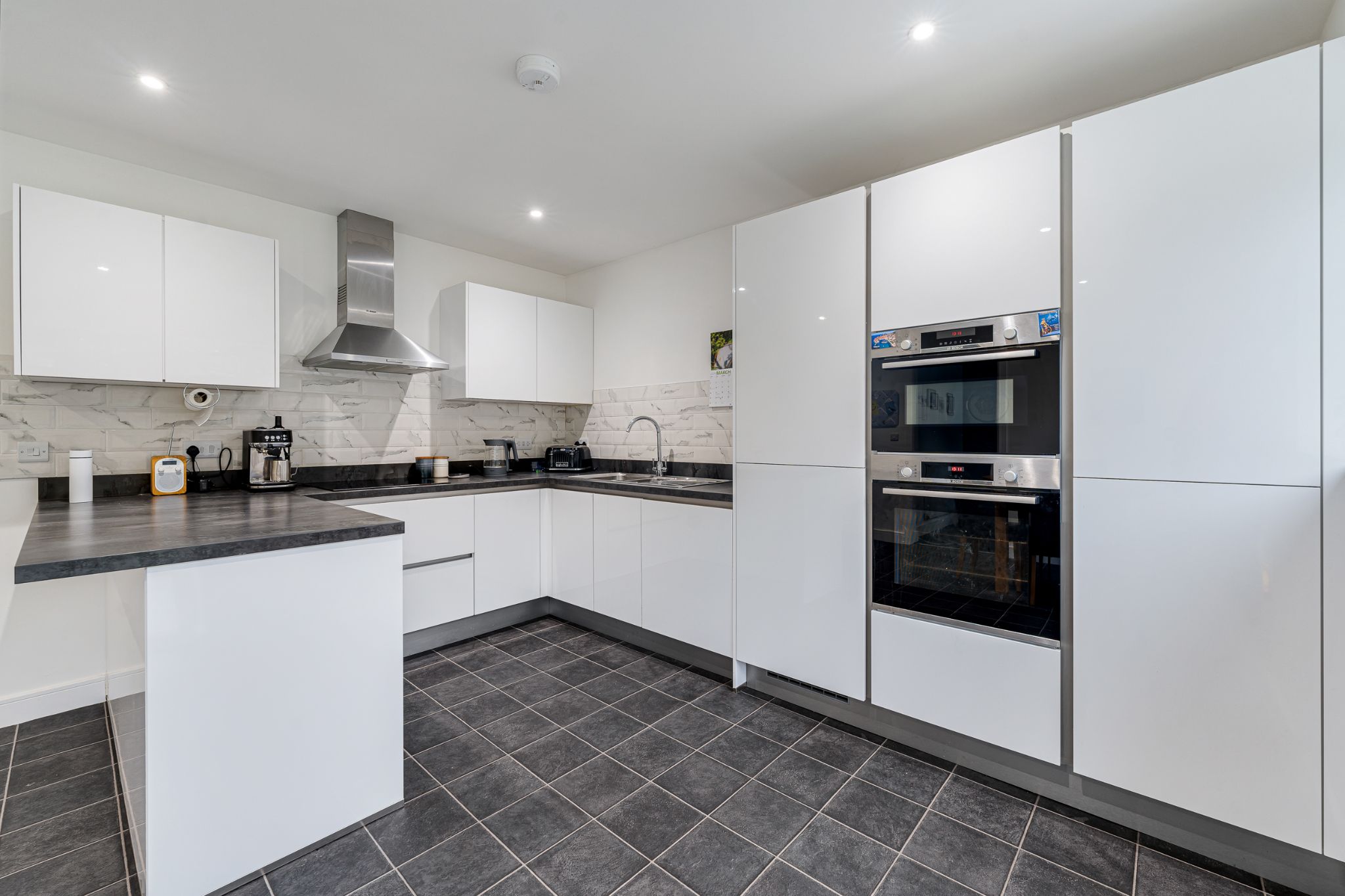 A sleek black composite door opens into the welcoming entrance hall, to your left you will discover the spacious lounge, a beautifully presented room featuring a front-facing window that overlooks the lawn and fills the space with natural light. To the rear of the property, you’ll find an impressive open-plan kitchen-diner, fitted with contemporary white high-gloss wall and base units and a superb range of integrated Bosch appliances, including an oven, microwave, induction hob, fridge, freezer and dishwasher – perfectly designed for modern family living. A breakfast bar provides the ideal spot to enjoy your morning coffee or casual dining and double doors open to the stunning patio area. A door from the kitchen leads to a well-appointed utility room, complete with matching units, a stainless steel sink, and space for both a washing machine and dryer. From here, there is access to a convenient downstairs WC, an internal door leading to the garage and composite door that open to the rear garden.