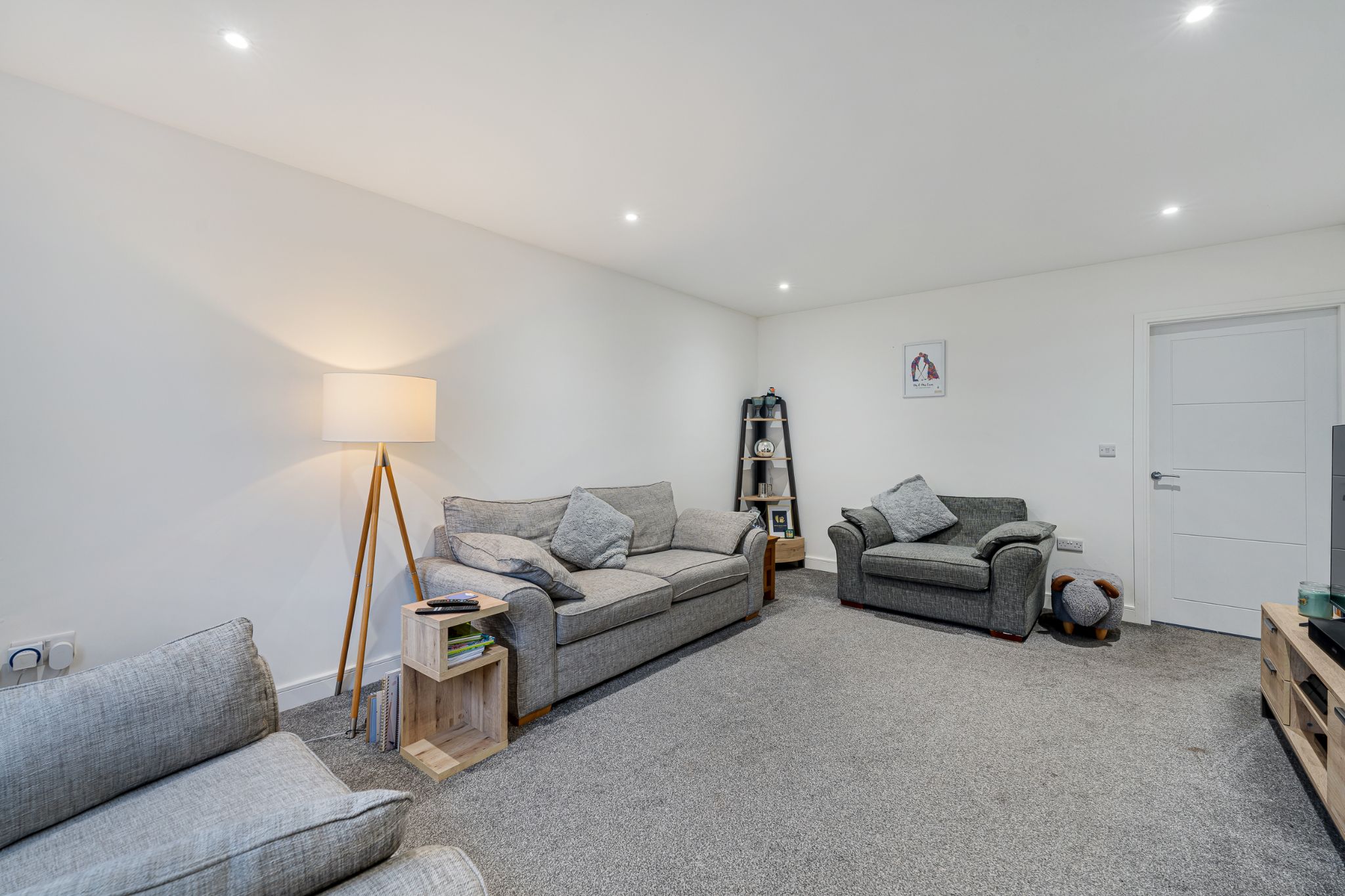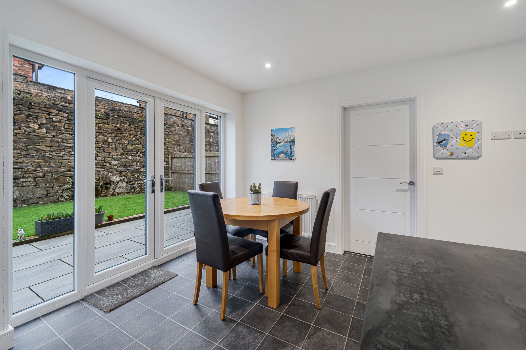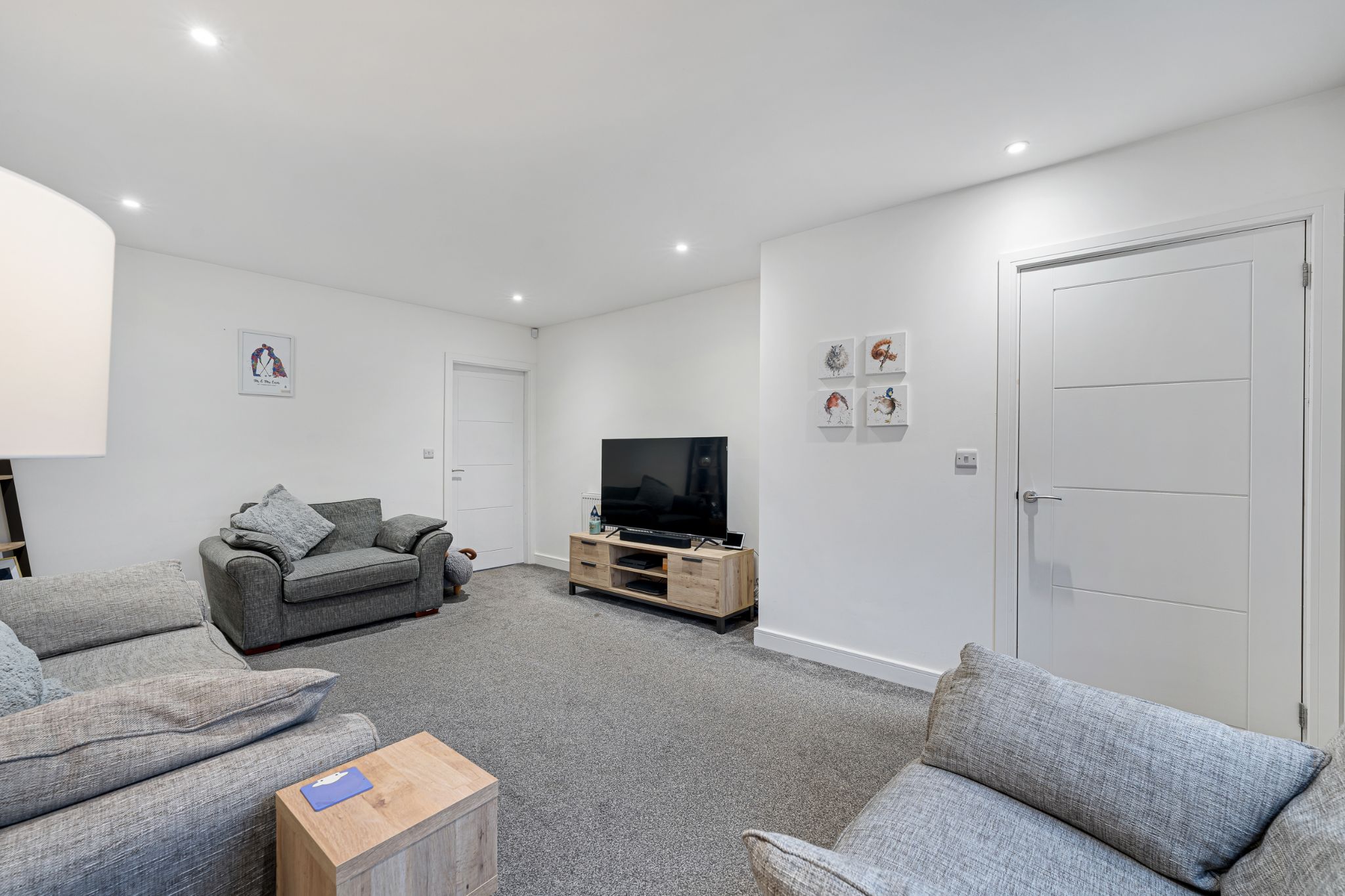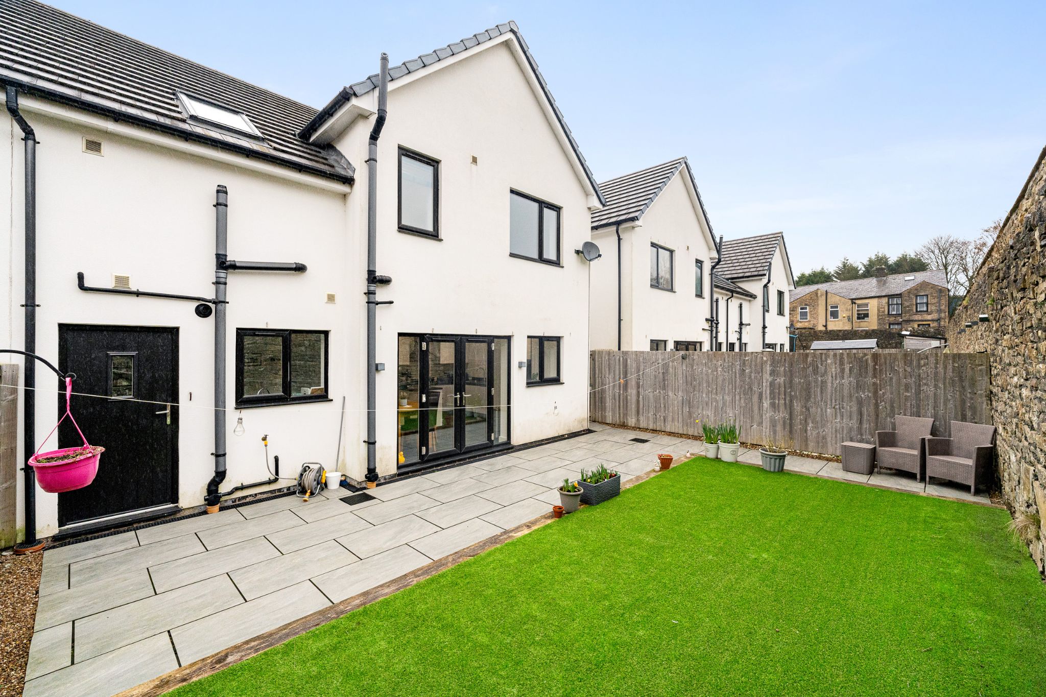 Stepping out through the kitchen’s double doors, you are welcomed onto a generous flagged patio — the perfect setting for outdoor dining and entertaining. Beyond this, an AstroTurf lawn provides a low-maintenance and family-friendly space, ideal for children to play. A side gate offers convenient access to the front lawn and driveway, which leads to the spacious garage, complete with an up-and-over door.