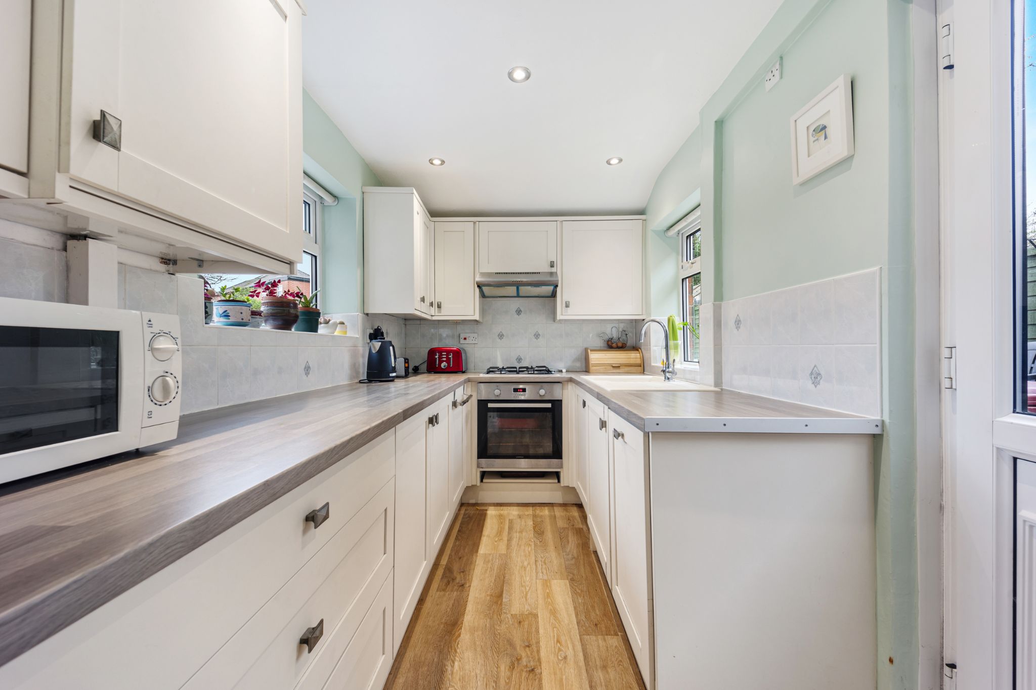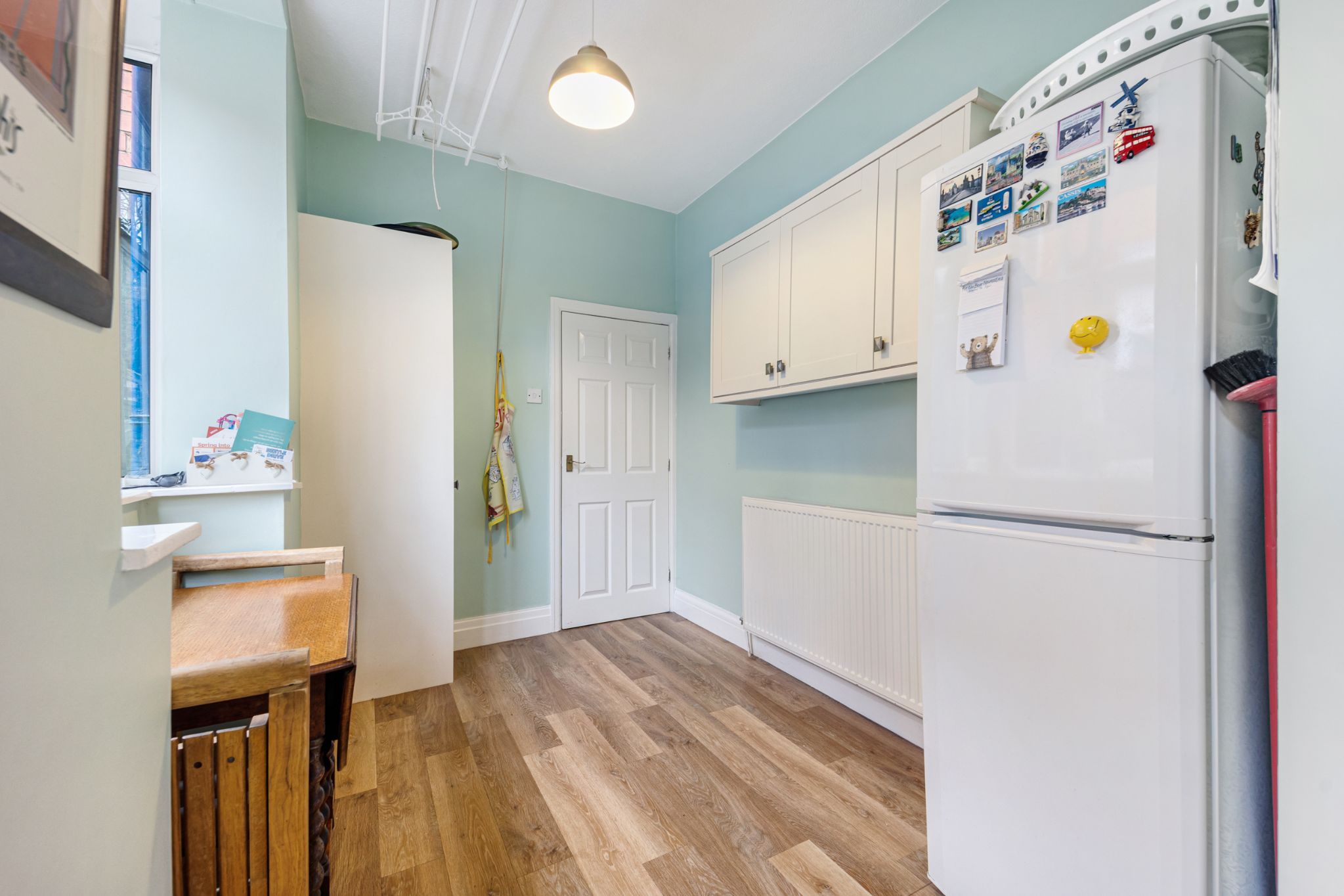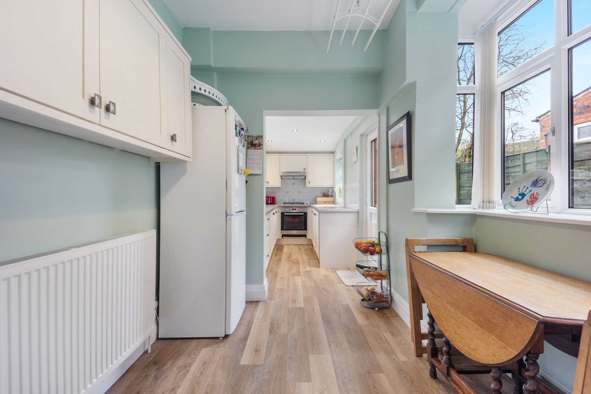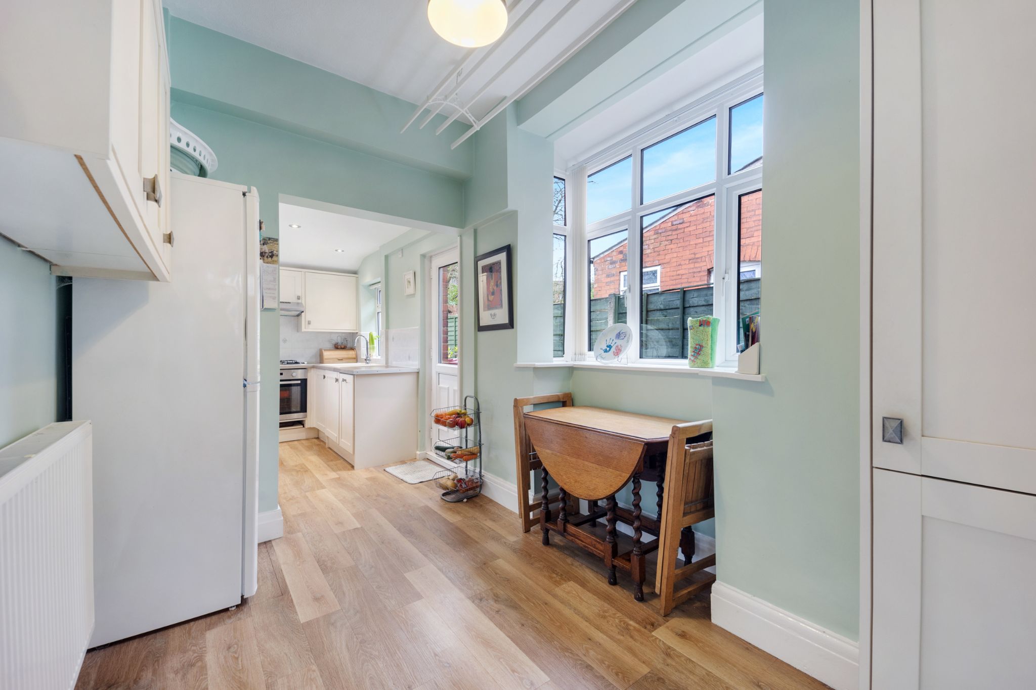After parking on the drive, step through the front door into the entrance hallway, benefitting from two understairs storage cupboards, ideal for your everyday household items. To your immediate left you will discover the dining room / second reception room, featuring a large front bay window and a feature fireplace. This room is currently used as a dining room but could also be well suited as a second lounge if desired. The main lounge is positioned to the rear of the home and features a fireplace, creating a cosy atmosphere, along with patio doors leading out to the rear garden. Continue through to the kitchen, fitted with cream wall and base units, space for dining, and a useful original hanging ceiling maiden. Integrated appliances include an oven, electric hob, dishwasher, extractor hood and sink, as well as plumbing for a washing machine and space for a fridge freezer. A side door provides access to the rear garden and garage. The ground floor is completed by a handy downstairs WC, convenient for guests.