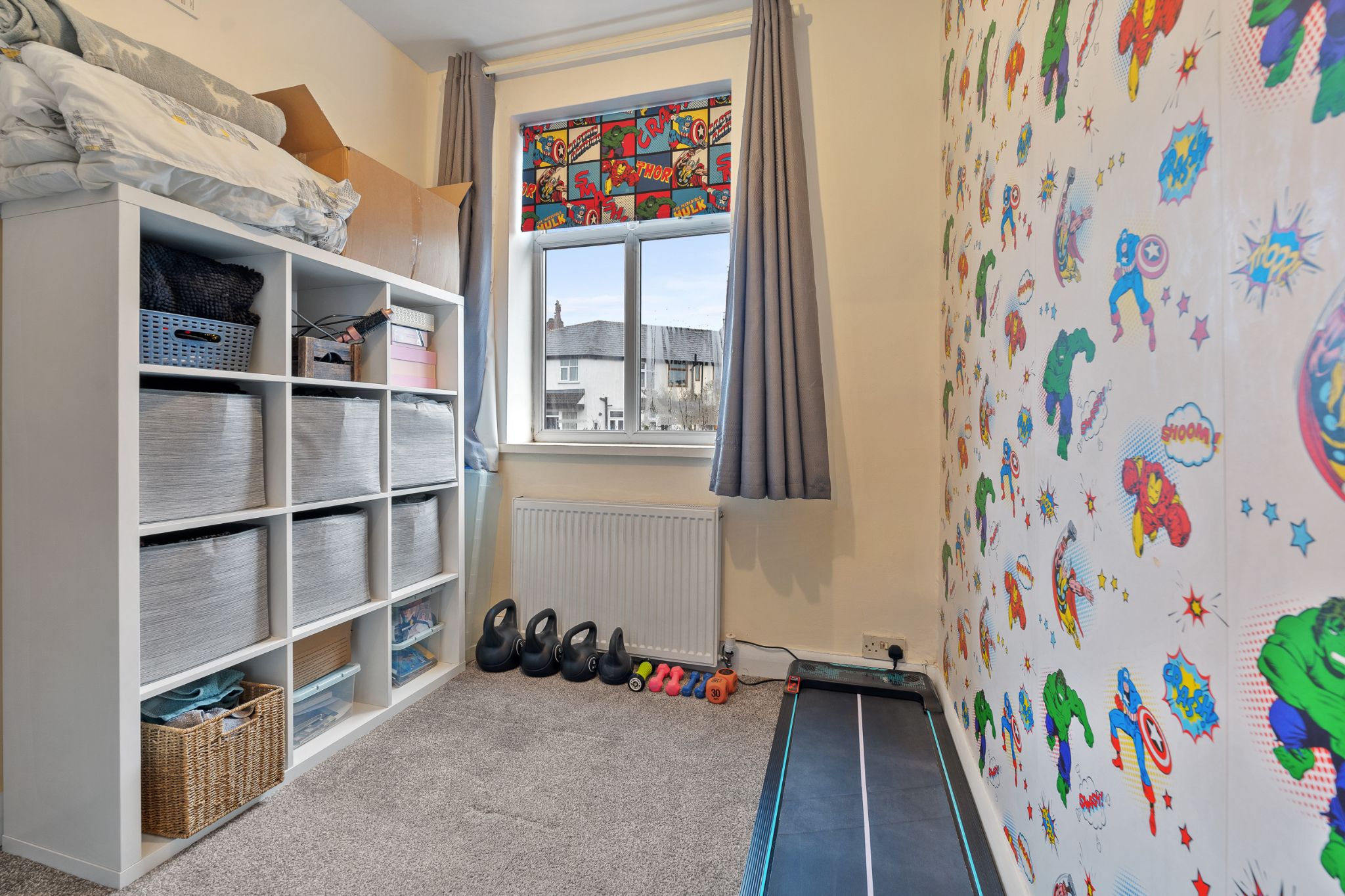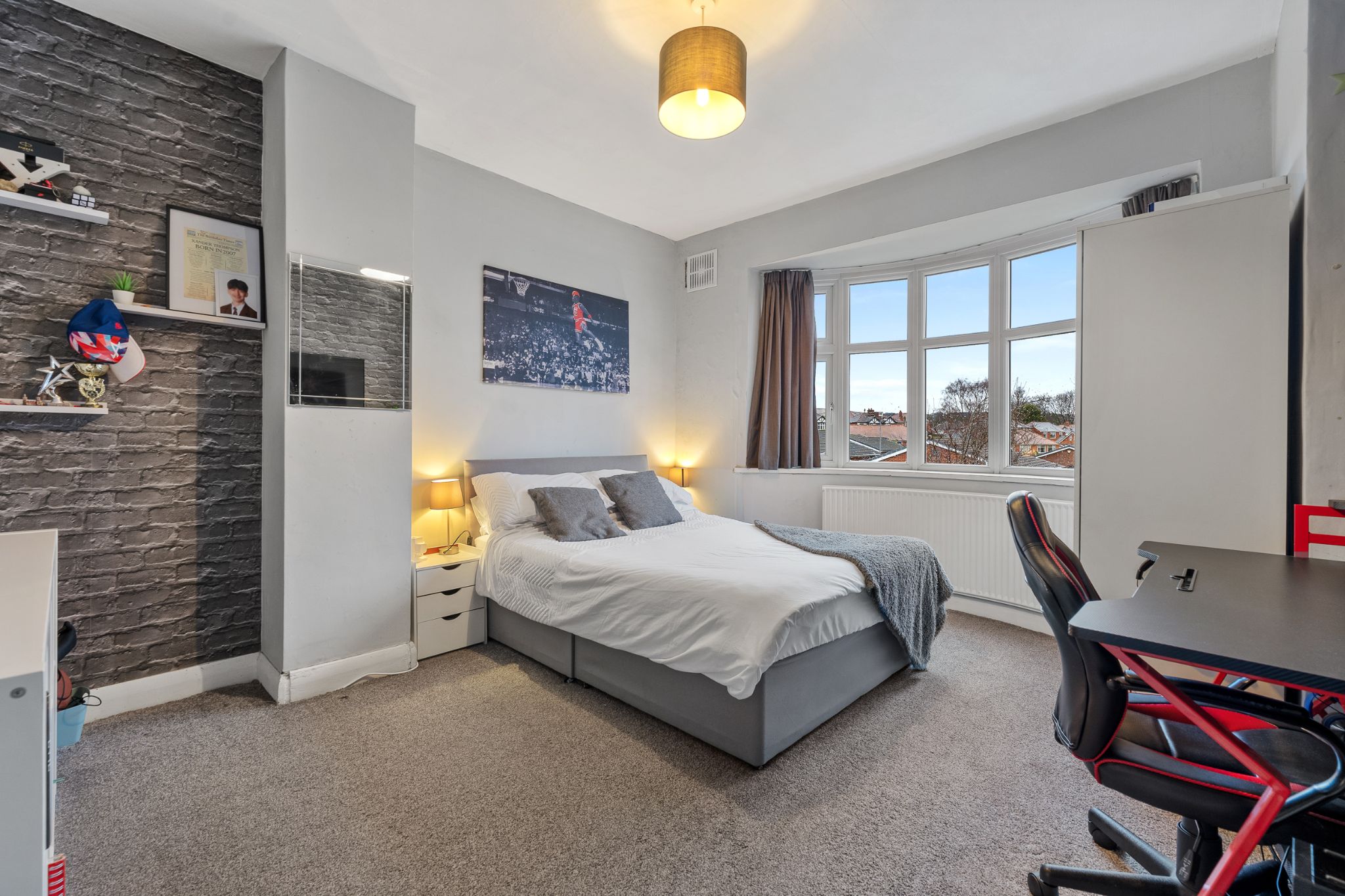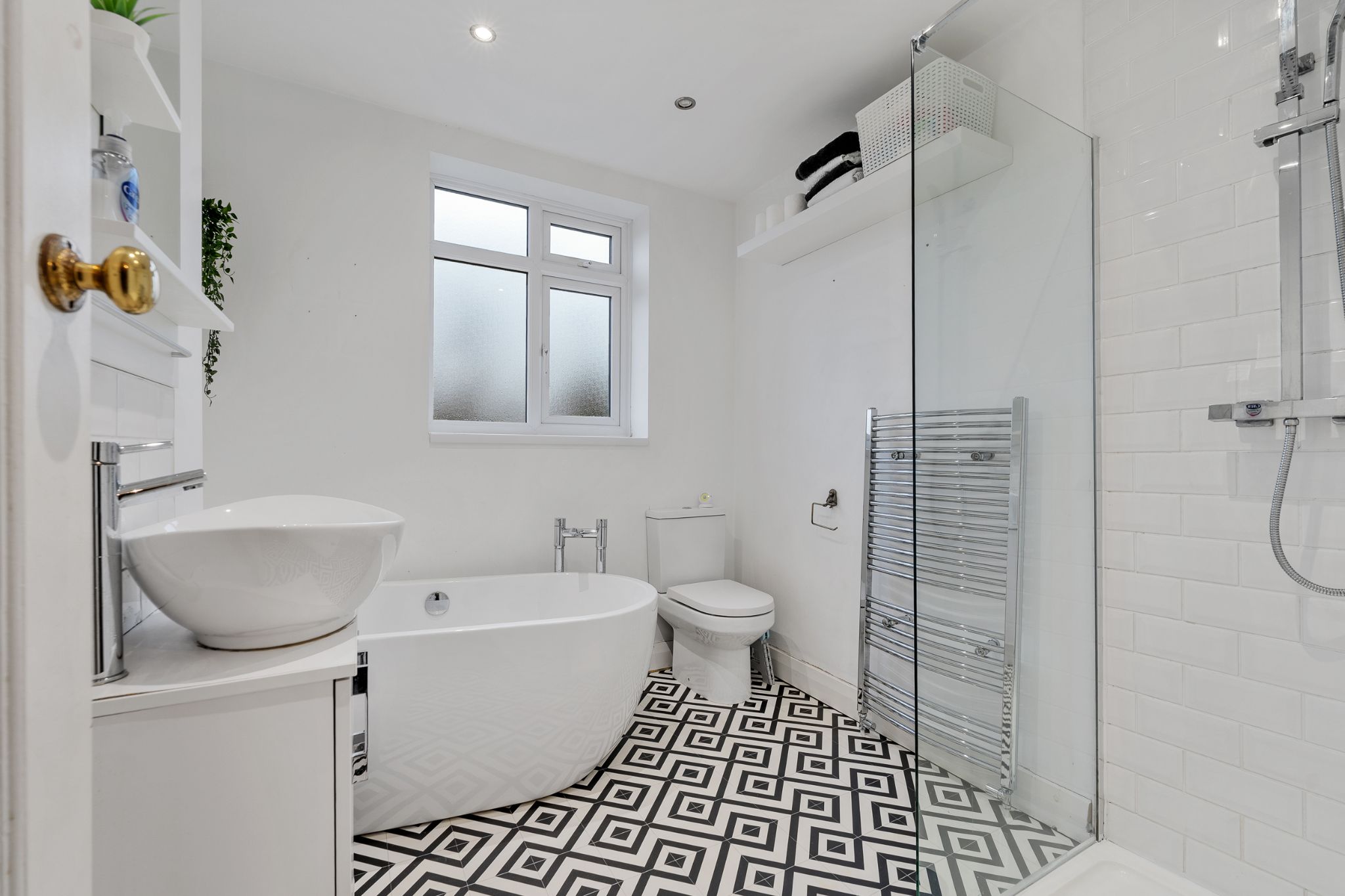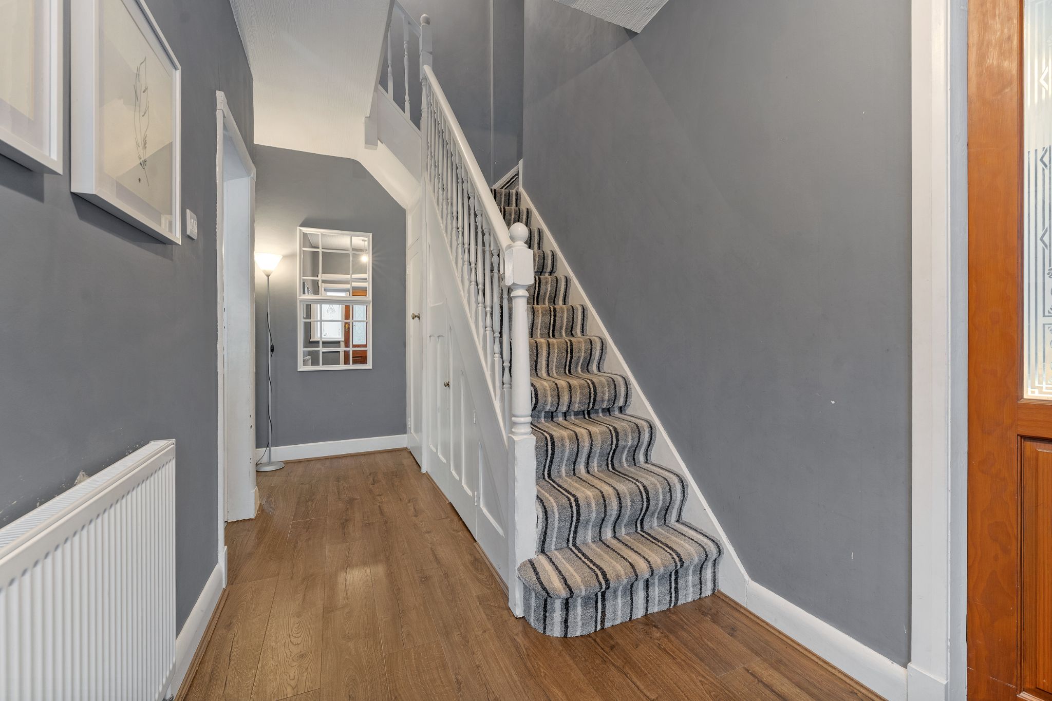 To the first floor are four well-proportioned bedrooms and a stylish four-piece family bathroom. The master bedroom is a generous double and benefits from a large dressing room that could easily be converted into a fifth bedroom or a spacious ensuite if desired, as plumbing provisions are already in place. Bedrooms two and three are also spacious doubles, both featuring attractive bay windows, while bedroom four is a well-sized single room, currently used as a storage space/home gym. The family bathroom is part-tiled and fitted with a bath, large walk-in shower, vanity unit, WC and chrome heated towel rail.