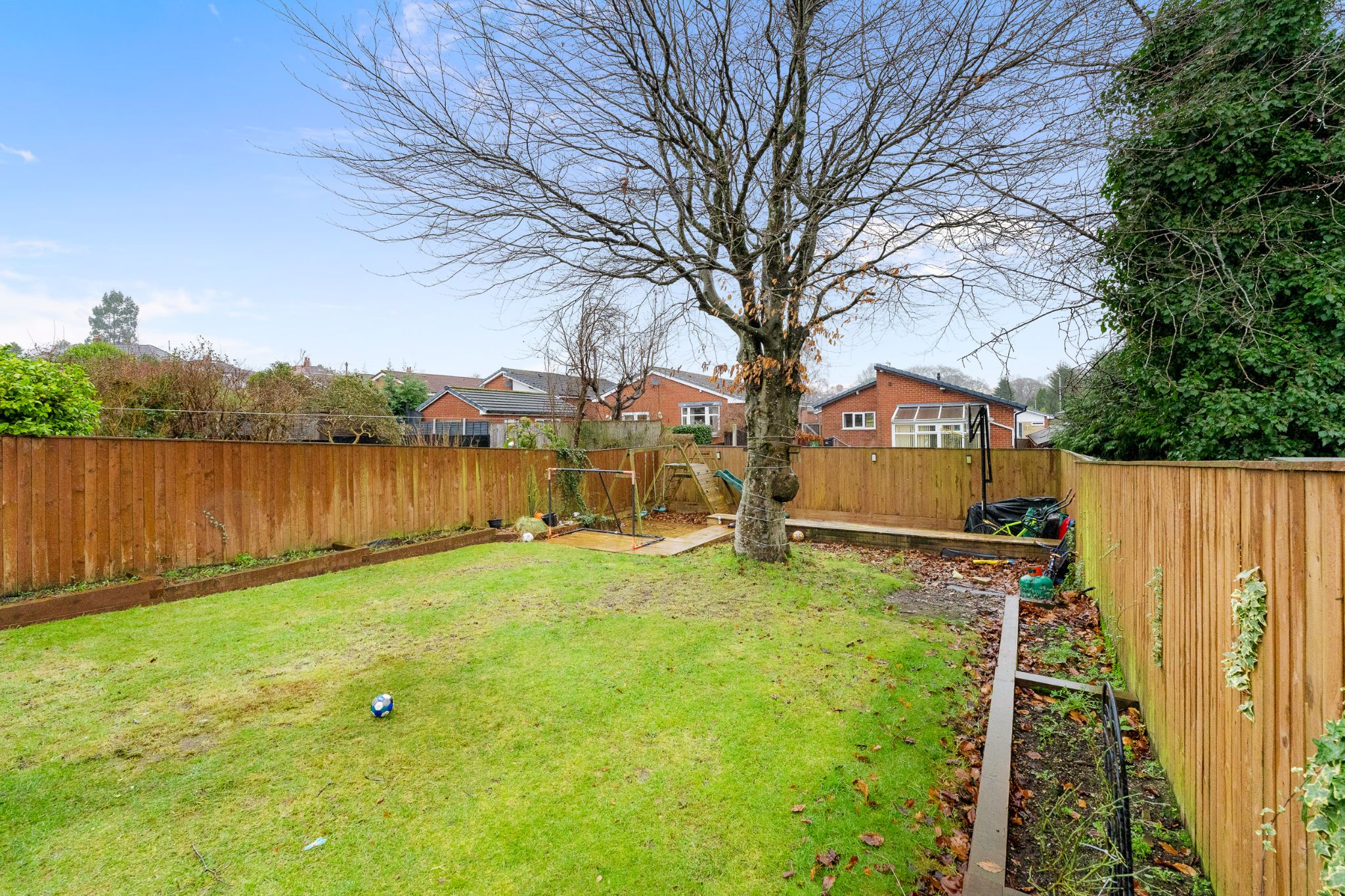 To the rear of the property is a family-friendly garden featuring a decked patio area, ideal for outdoor furniture and your BBQ. Steps lead down to a generous lawn, with a further decked/play area providing an excellent space for children. To the front, the property benefits from a driveway offering off-road parking and a low-maintenance stone garden.