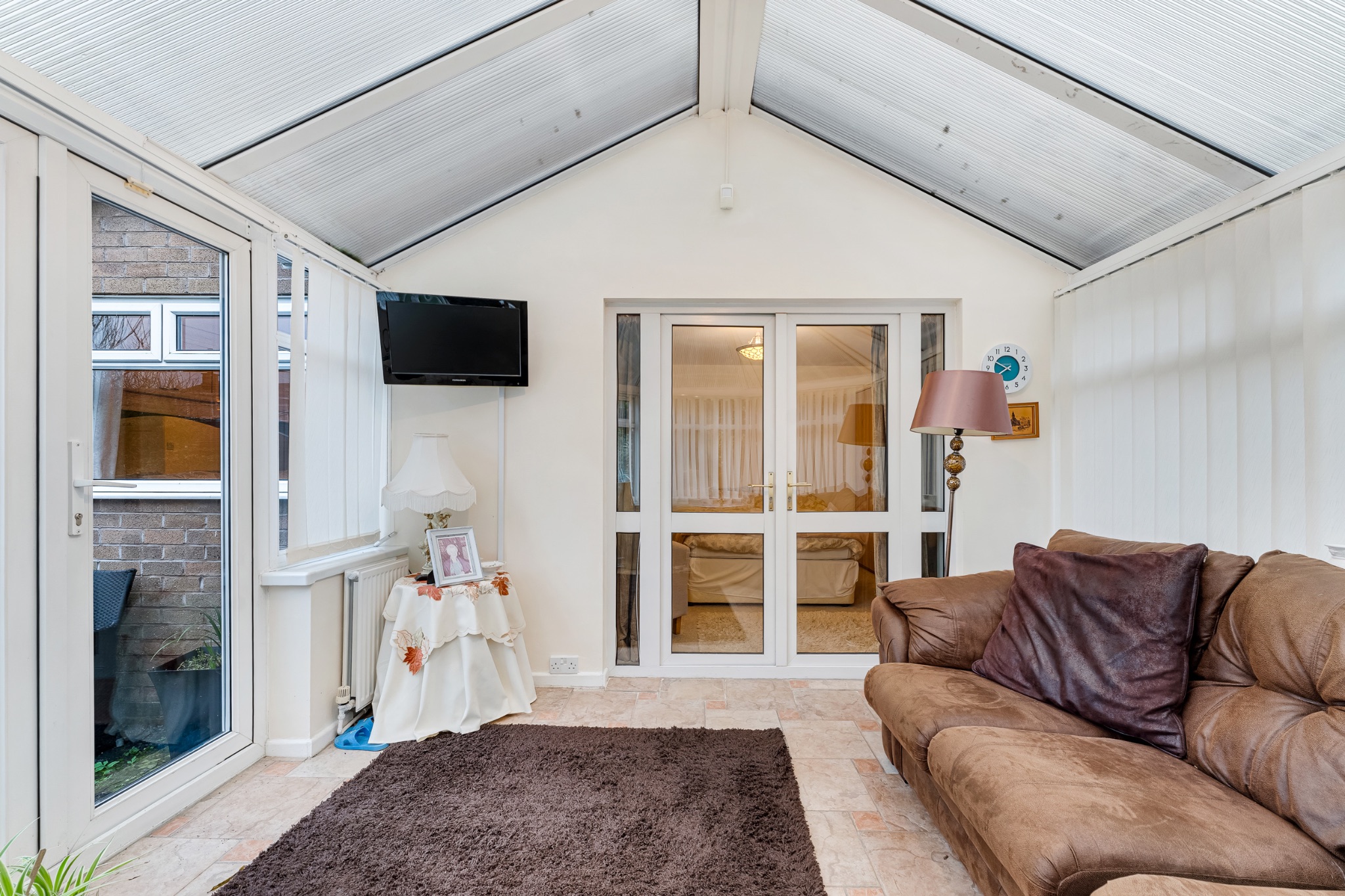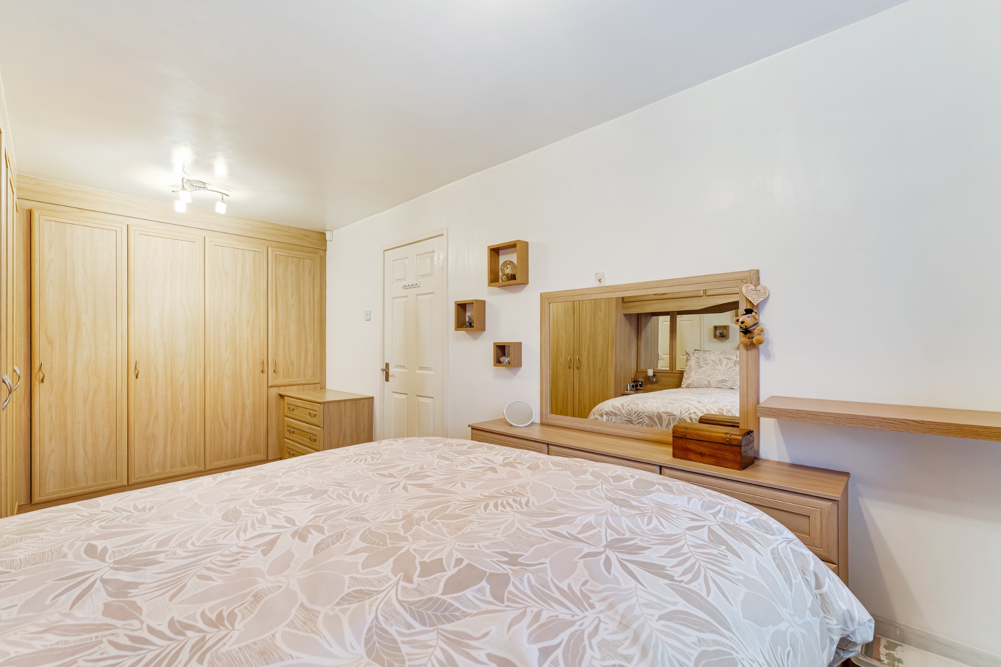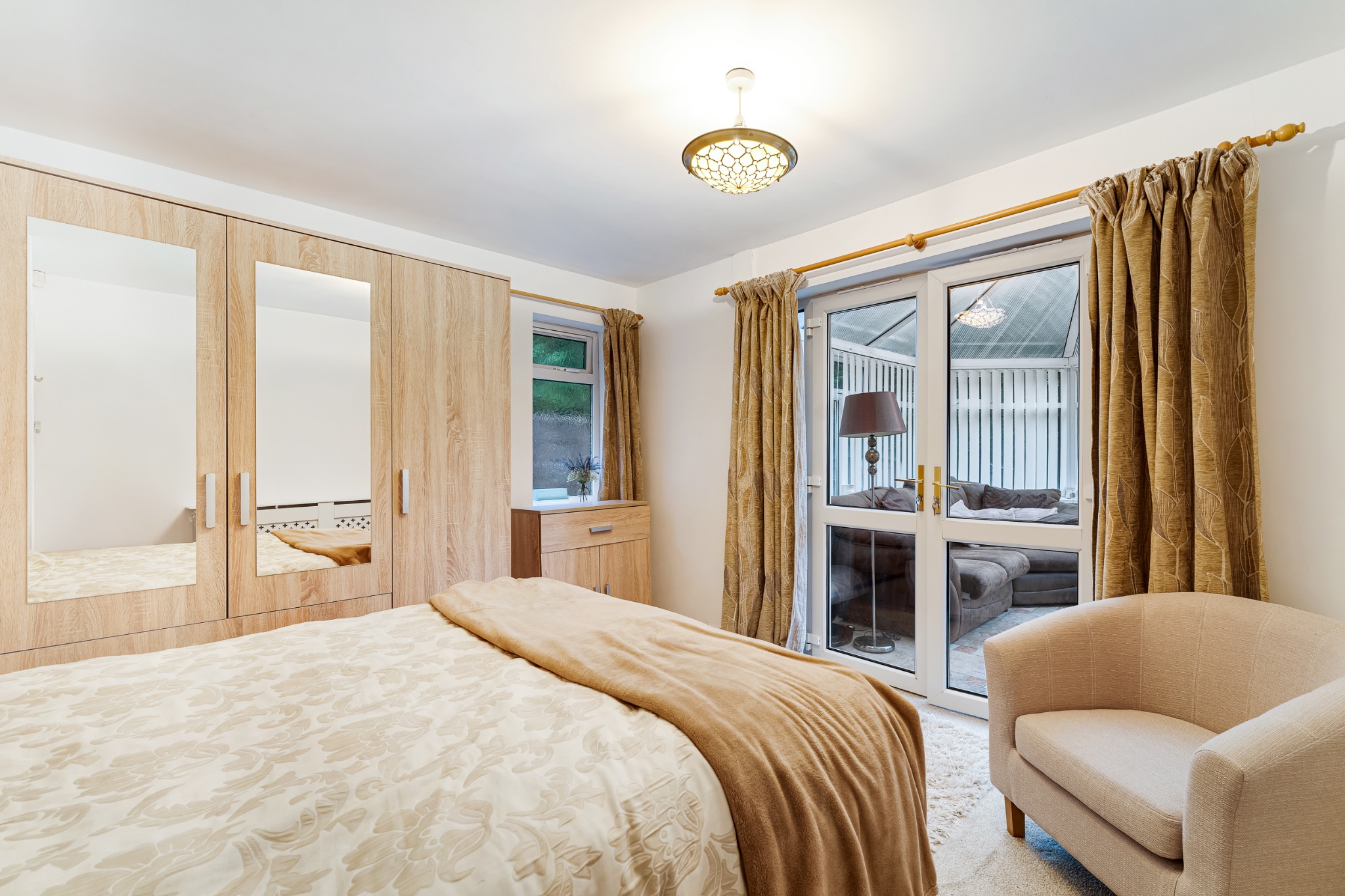 Down the hallway, the master bedroom boasts a range of fitted furniture and a large window looks over the impressive rear garden. Bedroom two is another good sized double with French doors leading to the spacious conservatory. A additional set of French doors give access to the garden patio, perfect during those warmer summer months. Fully tiled elevations in grey tones and a fitted storage cupboard. The modern family shower room features a tiled/glazed shower enclosure with a rain fall shower head and an additional shower head and flexible hose at a lower level. Vanity wash basin with storage below, low level Wc with a concealed cistern, chrome heated towel rail. Grey tiled elevations in contrasting tones.