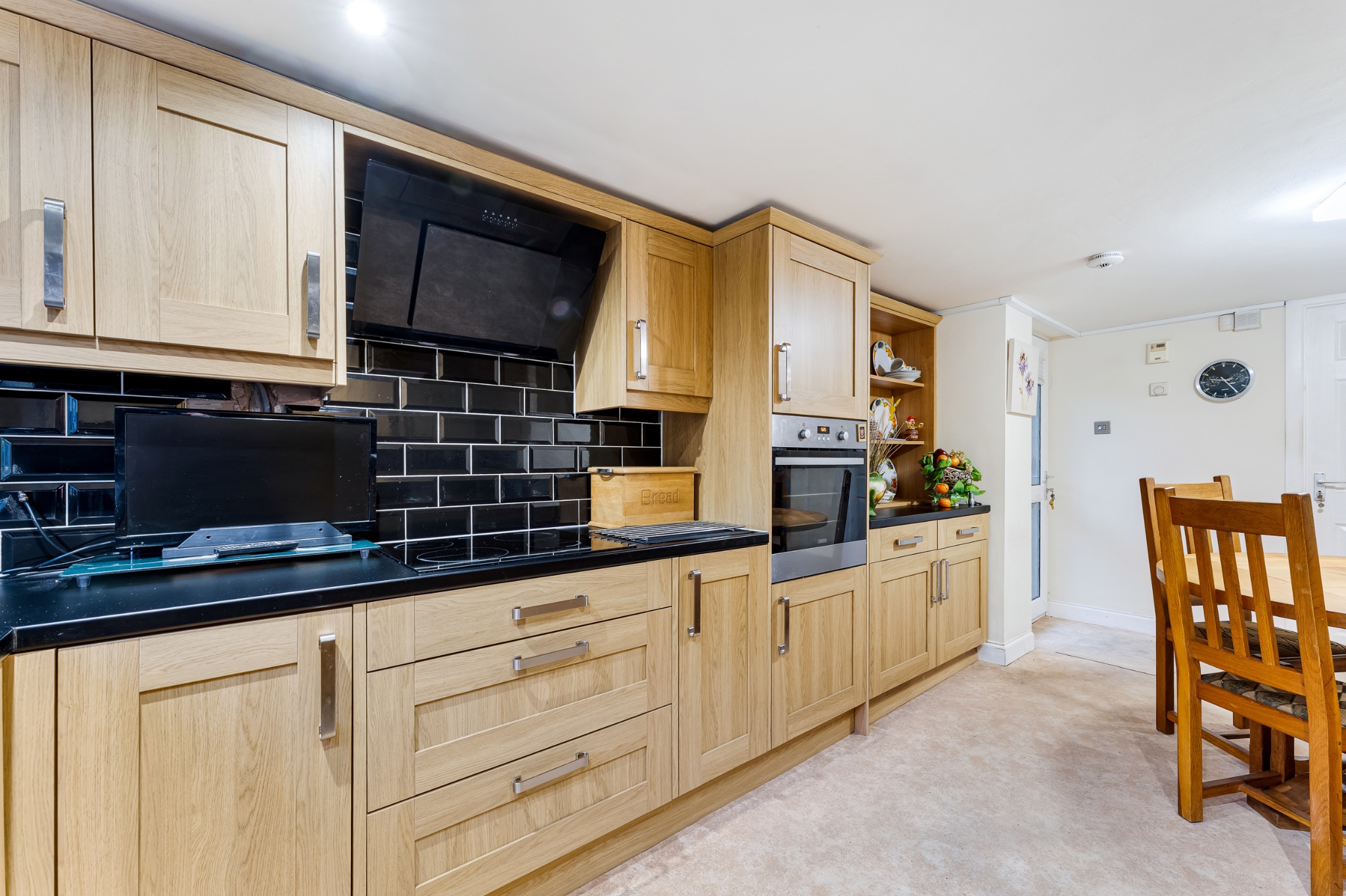 The kitchen-diner has features base and wall units with sleek black worktops, integrated fridge, freezer, built in oven and electric hob with a contemporary style extractor hood above. A door for convenience gives access to the garage.