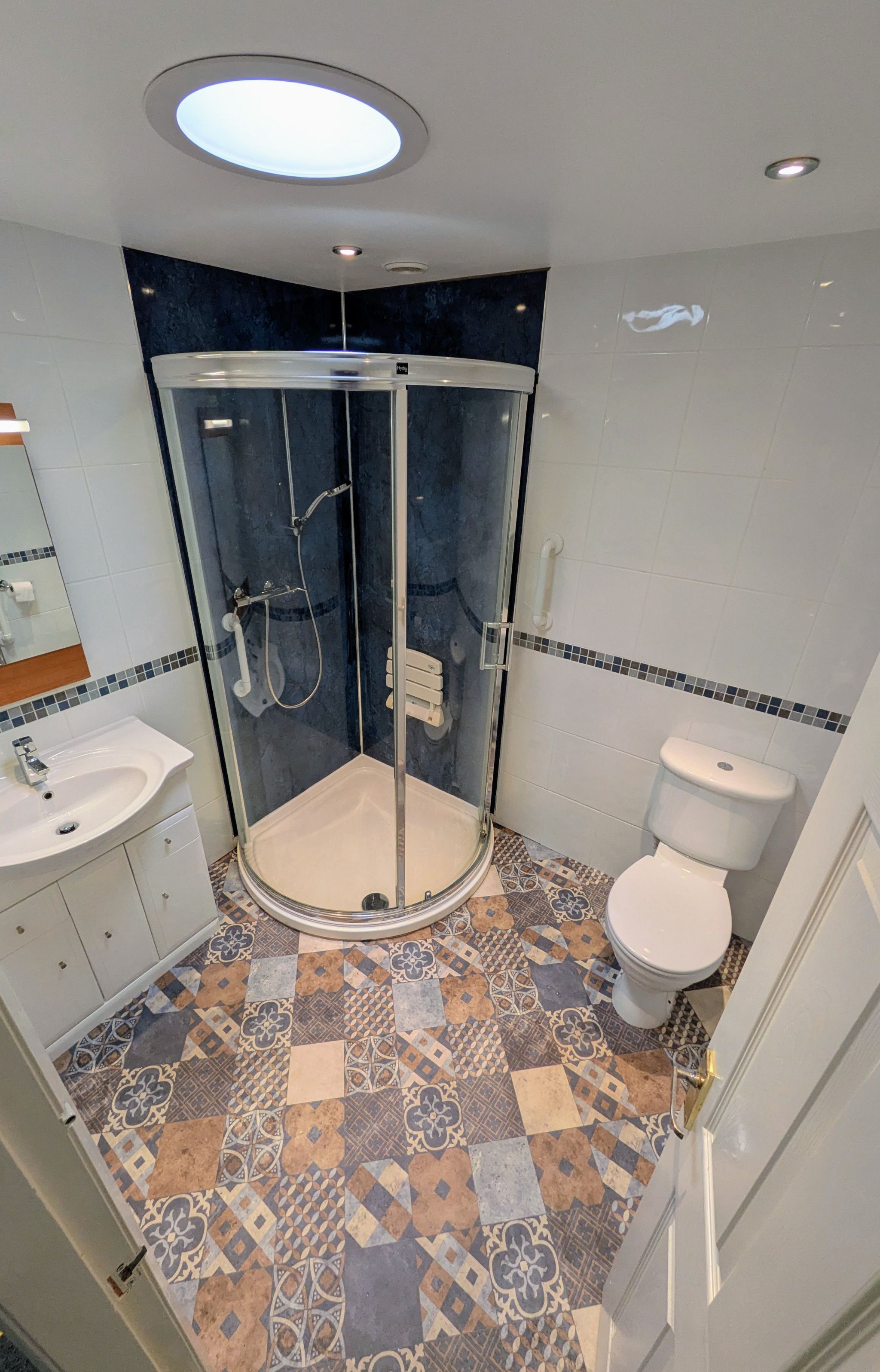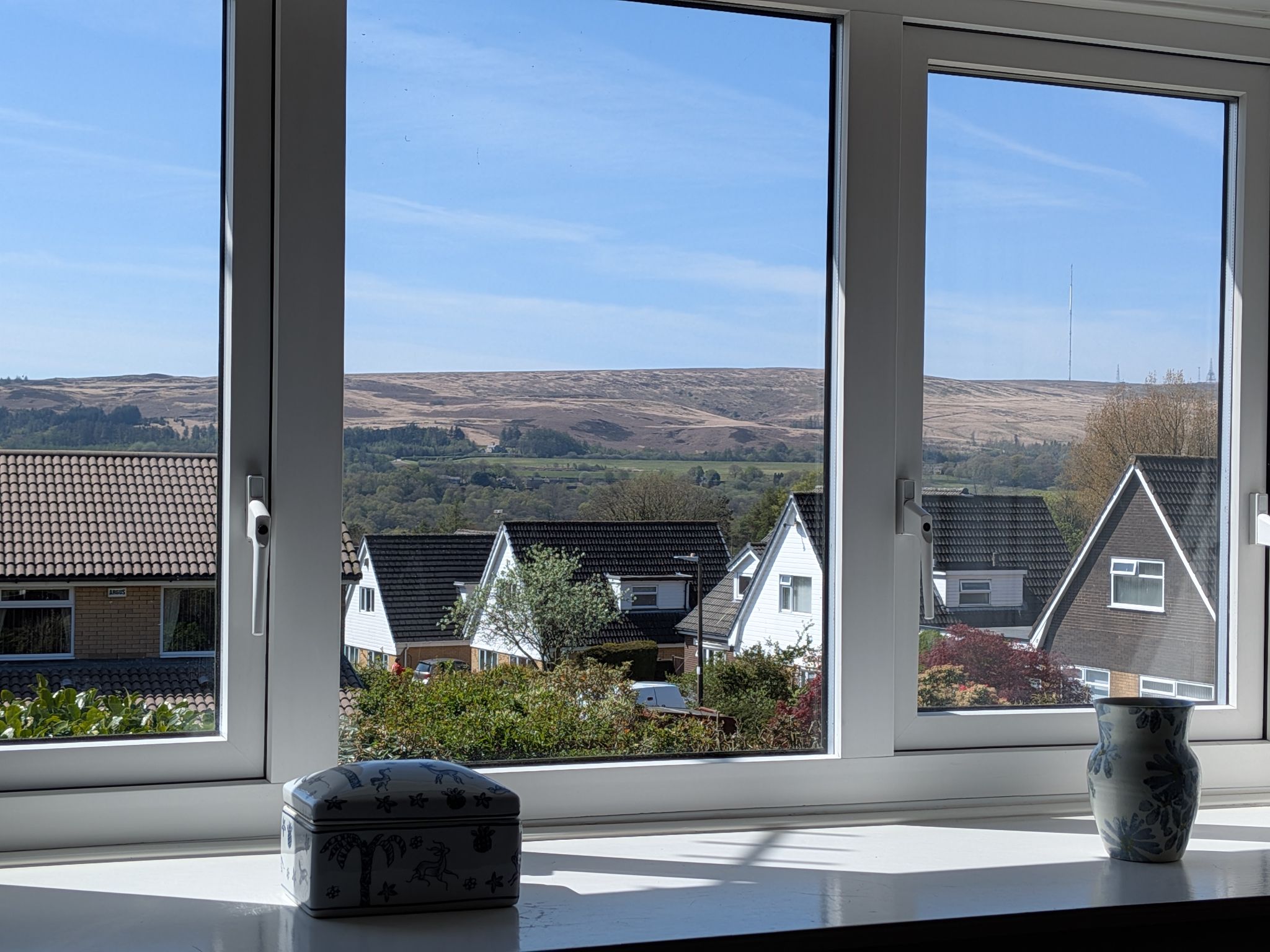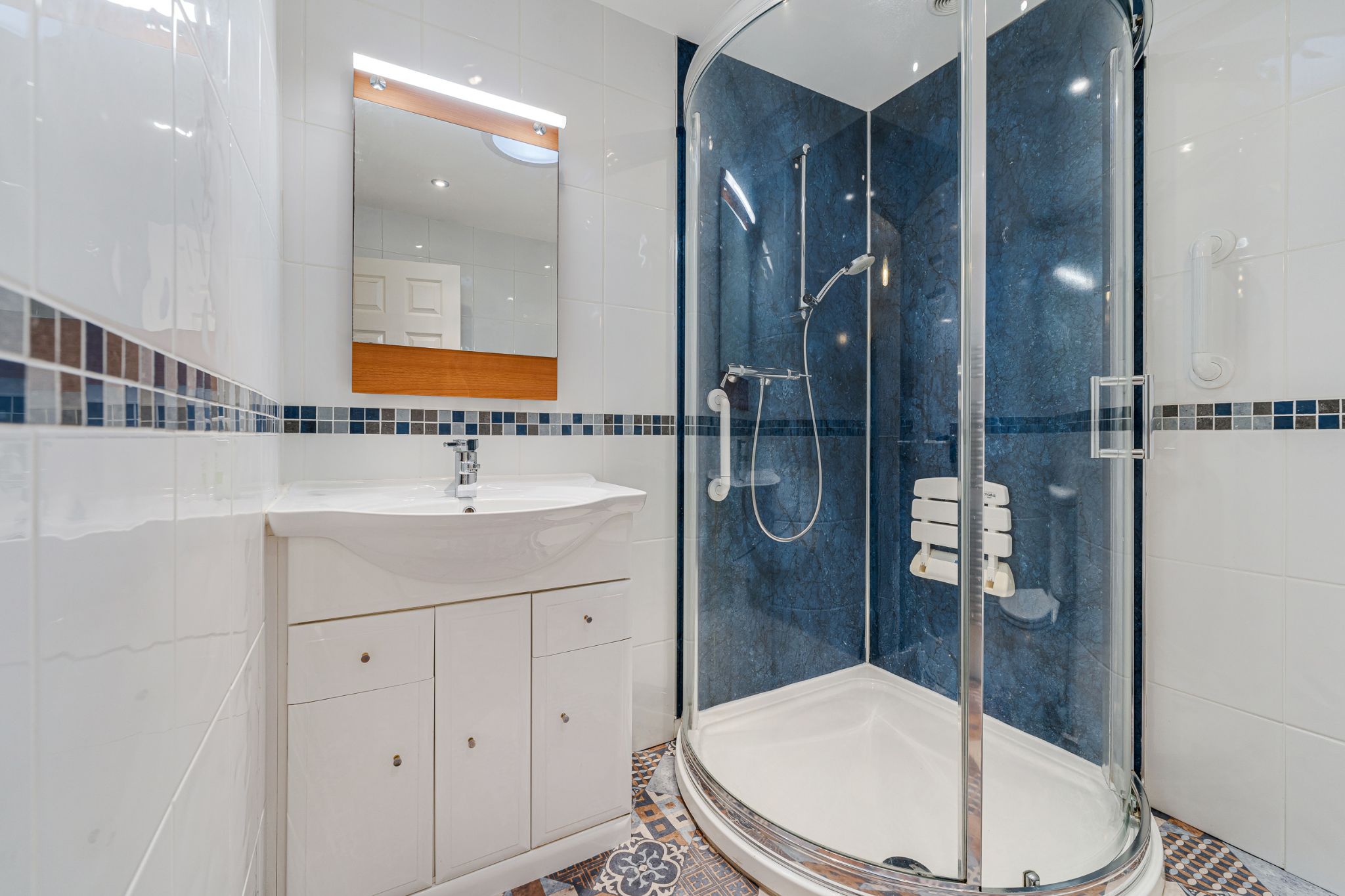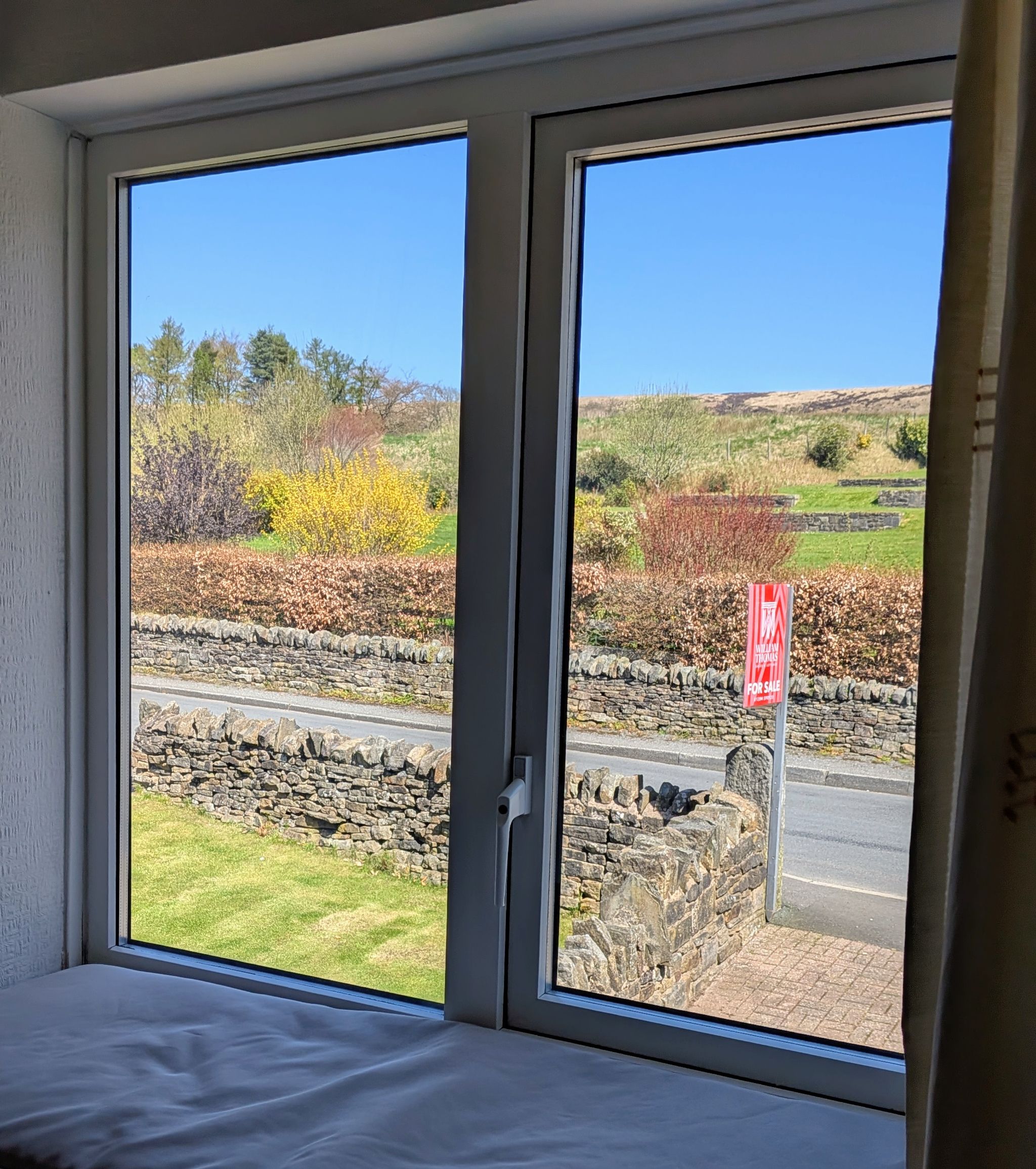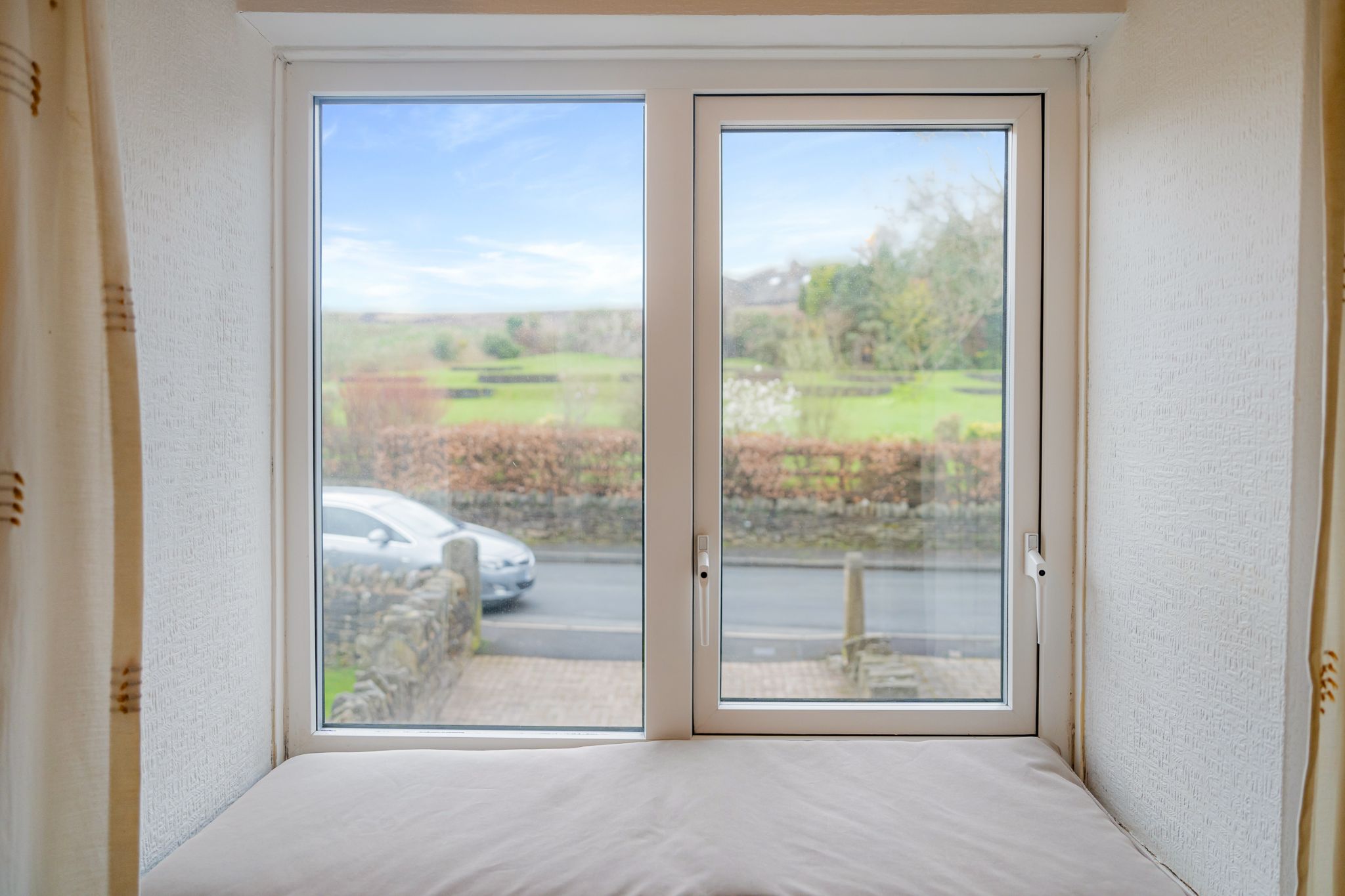 To the first floor, there is a three-piece shower room and two well-proportioned bedrooms. Both bedrooms feature a charming window seat, perfect for admiring the far reaching countryside views. The master bedroom is positioned to the rear and benefits from fitted wardrobes, a handy storage cupboard and an original low-level window. Bedroom two is also a double, featuring fitted wardrobes and the same attractive window seat, with views towards the West Pennine Moors. From the landing, a loft hatch provides access to a boarded loft, offering additional storage space. The three-piece shower room benefits from a Velux sun tunnel providing ample natural light. The bathroom is part-tiled and comprises a vanity basin, WC, chrome heated towel rail and an enclosed shower with convenient Mermaid boarding.