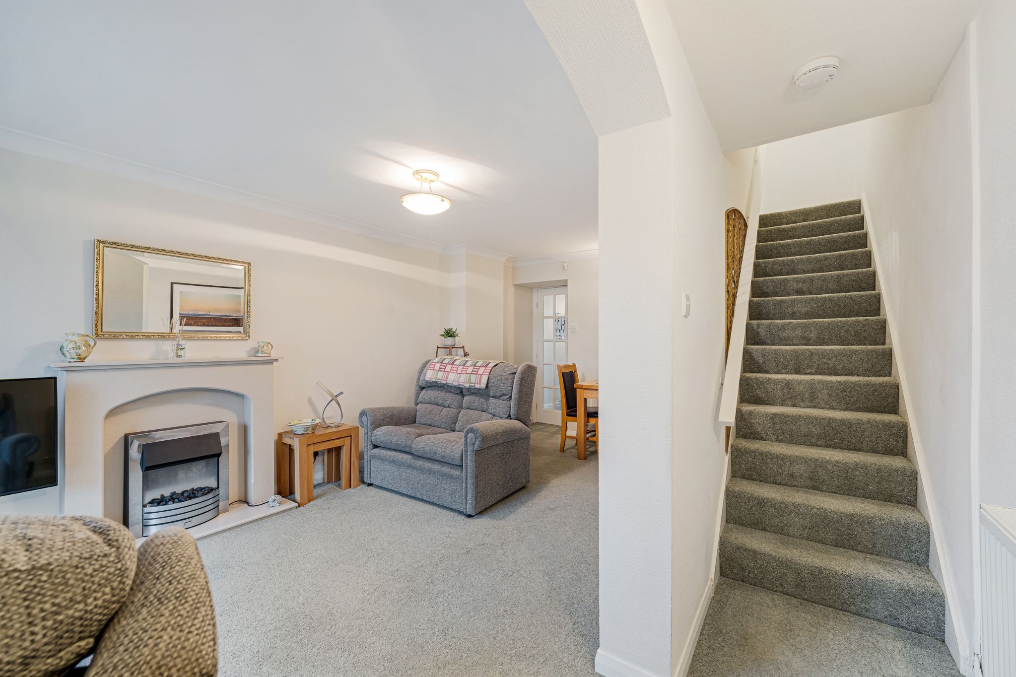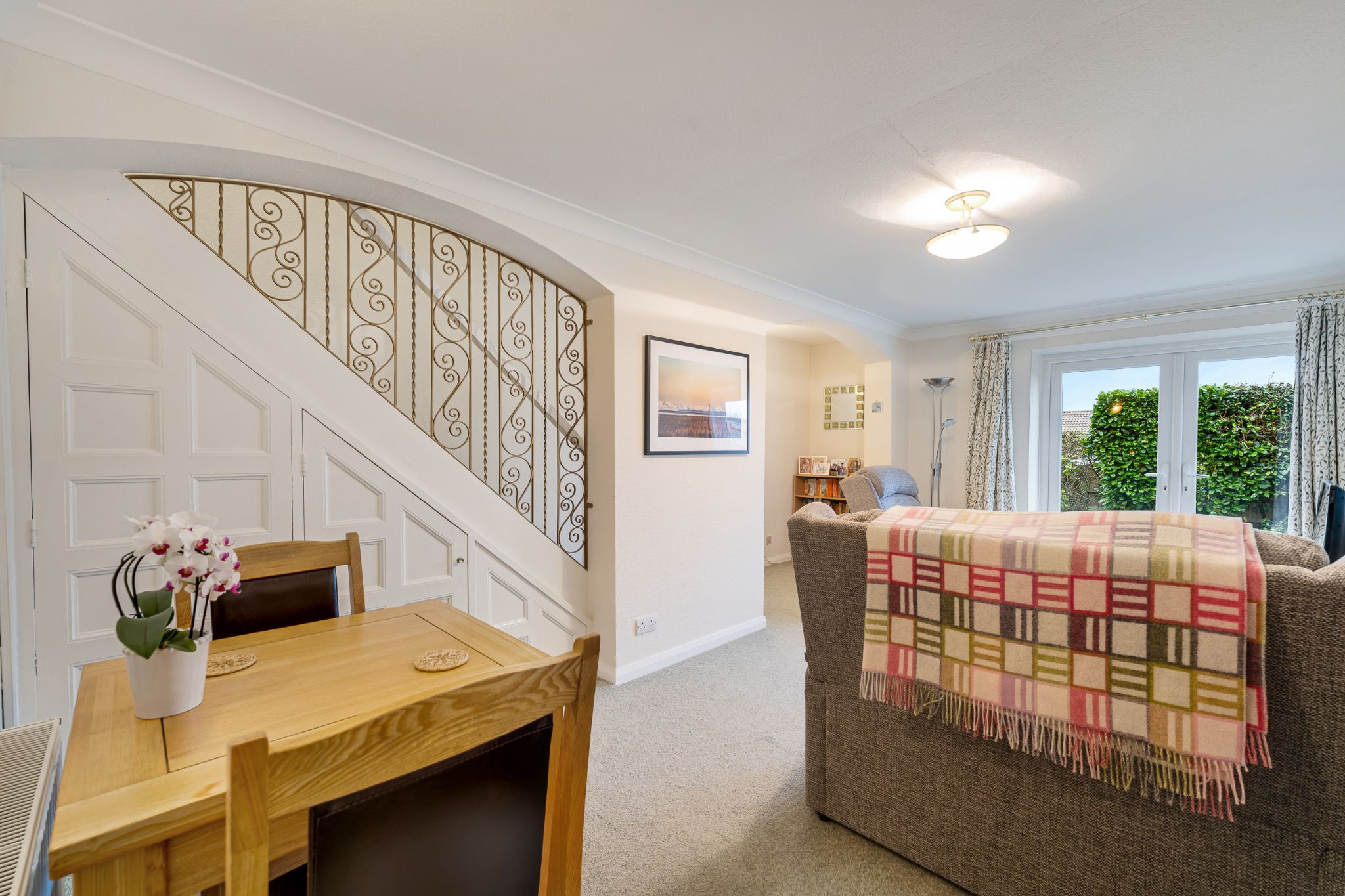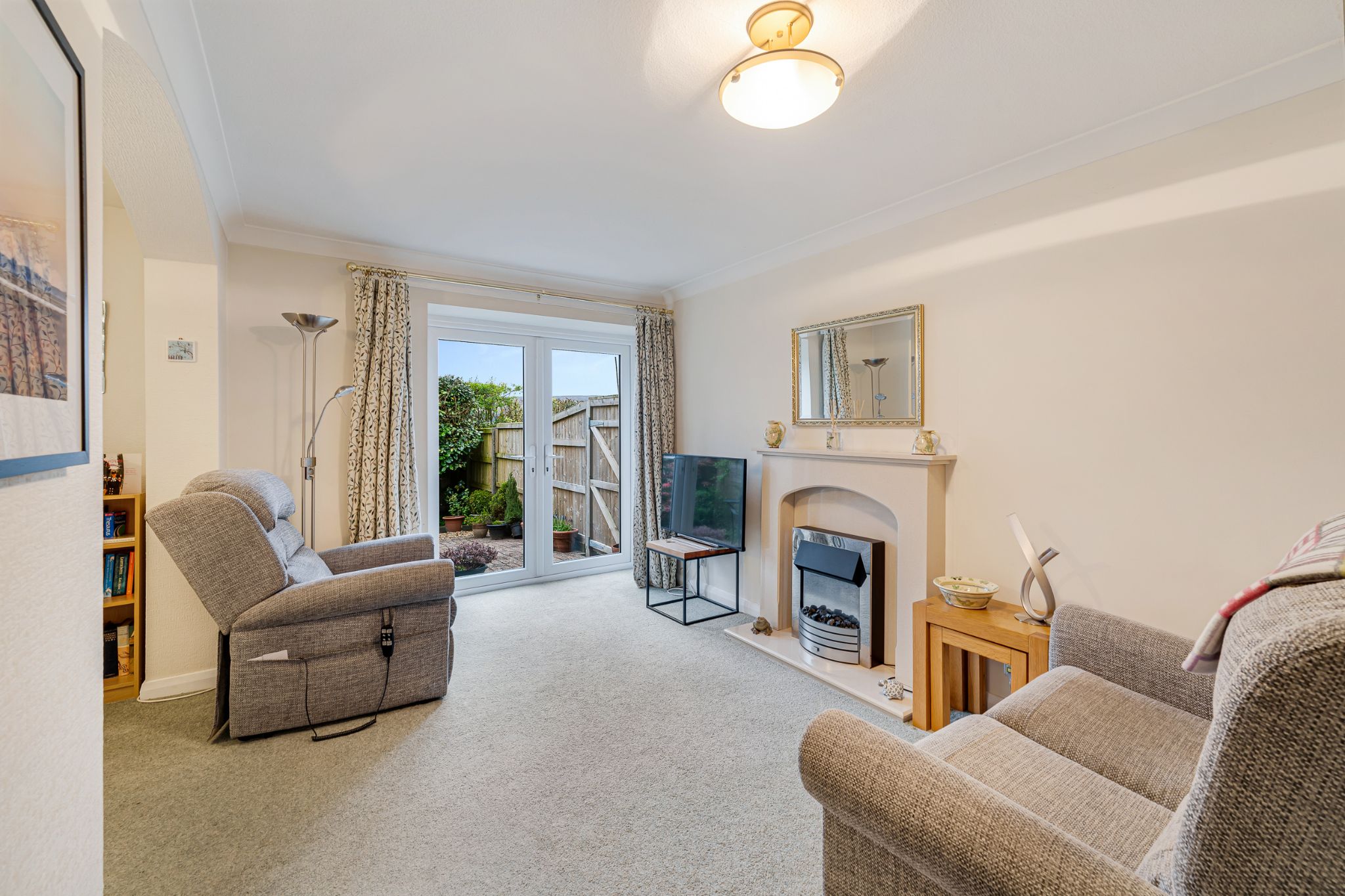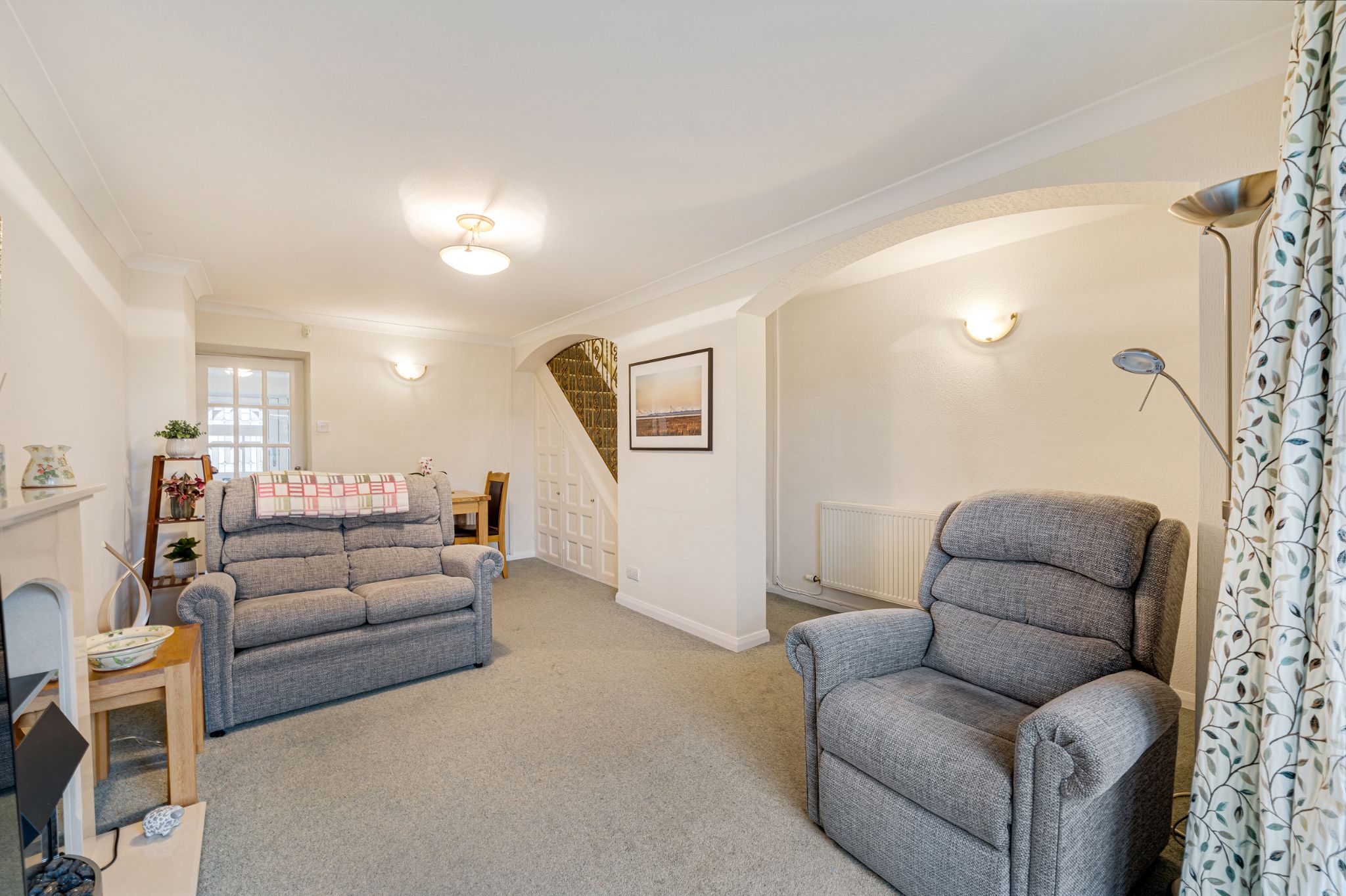 Park on the driveway and enter through the front door into a welcoming entrance hallway, complete with useful built-in storage cupboards. To the left, the kitchen overlooks the front and is fitted with stylish grey gloss wall and base units, complemented by quality worktops. Integrated appliances include a fridge freezer, dishwasher, oven, microwave, electric hob and extractor hood, with additional space for a washing machine. Continue from the entrance hallway into the spacious lounge, which offers ample under stair storage and room for both relaxing and dining. A feature fireplace with an electric fire creates a cosy cottage feel, while patio doors open out onto the rear, south-facing courtyard, providing an indoor-outdoor living space in the warmer summer months.