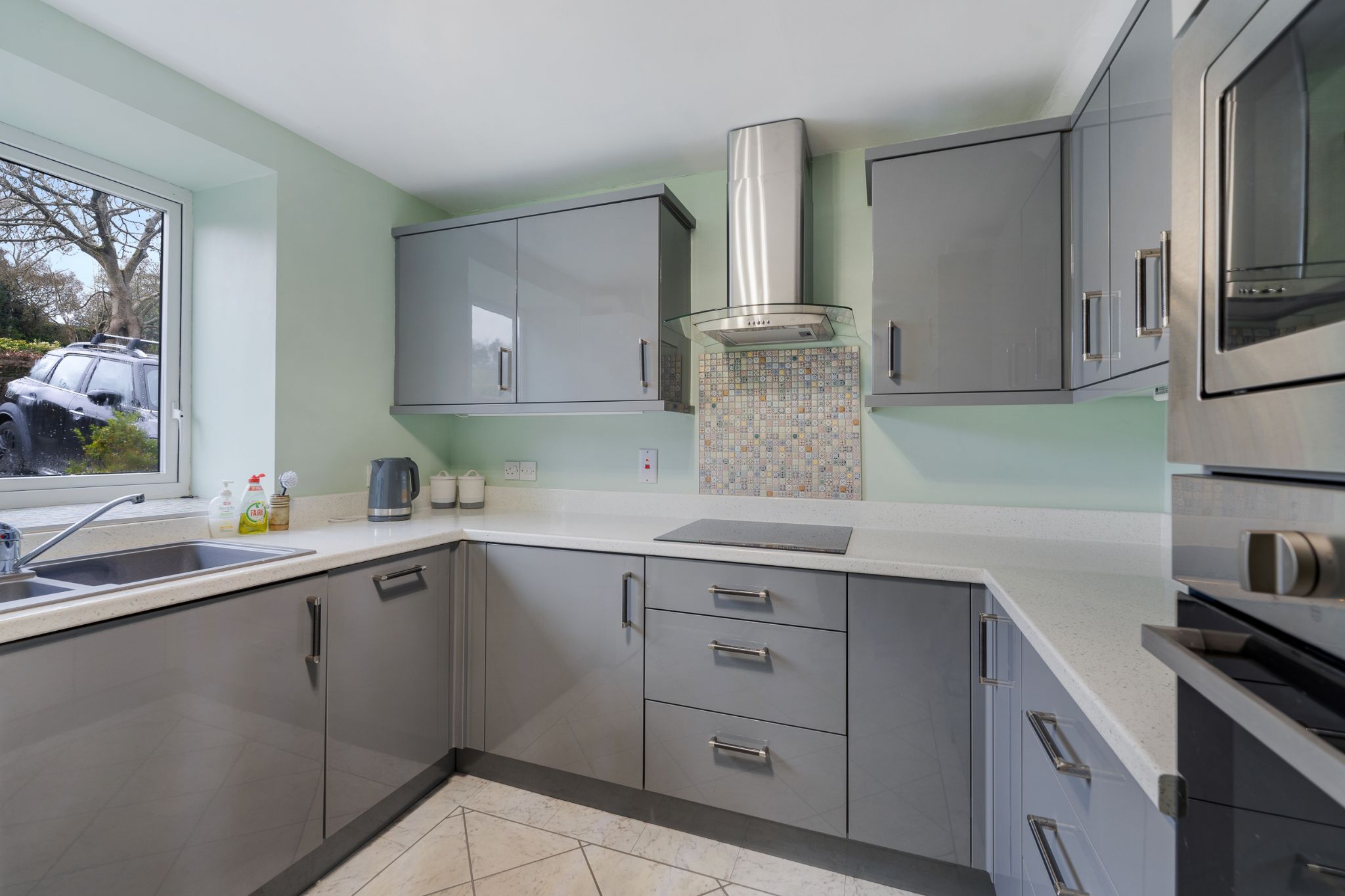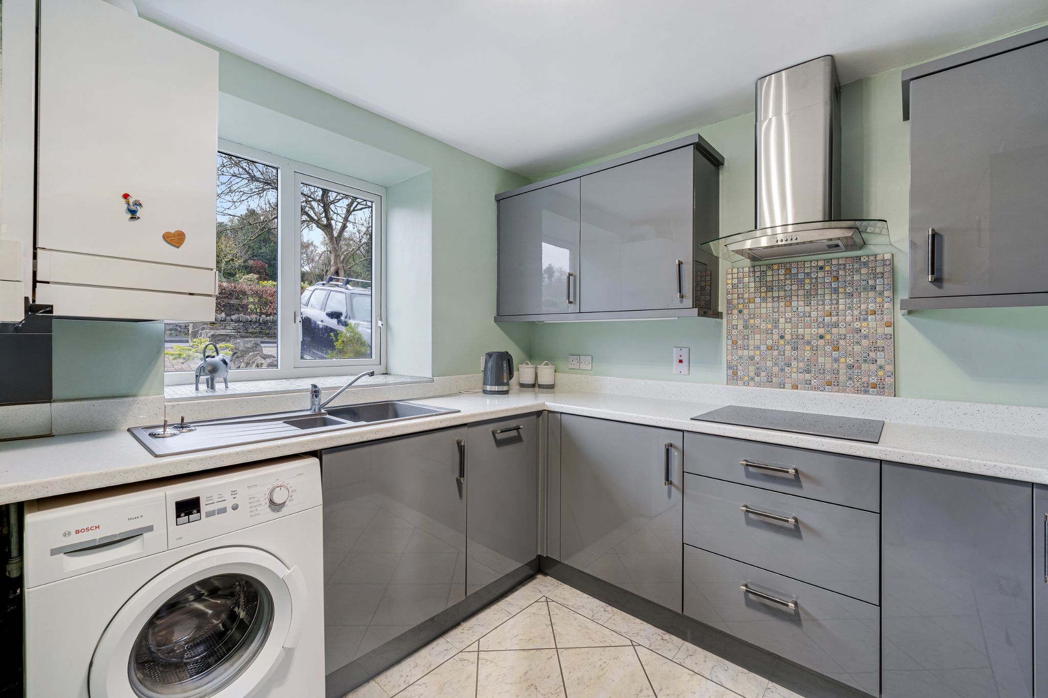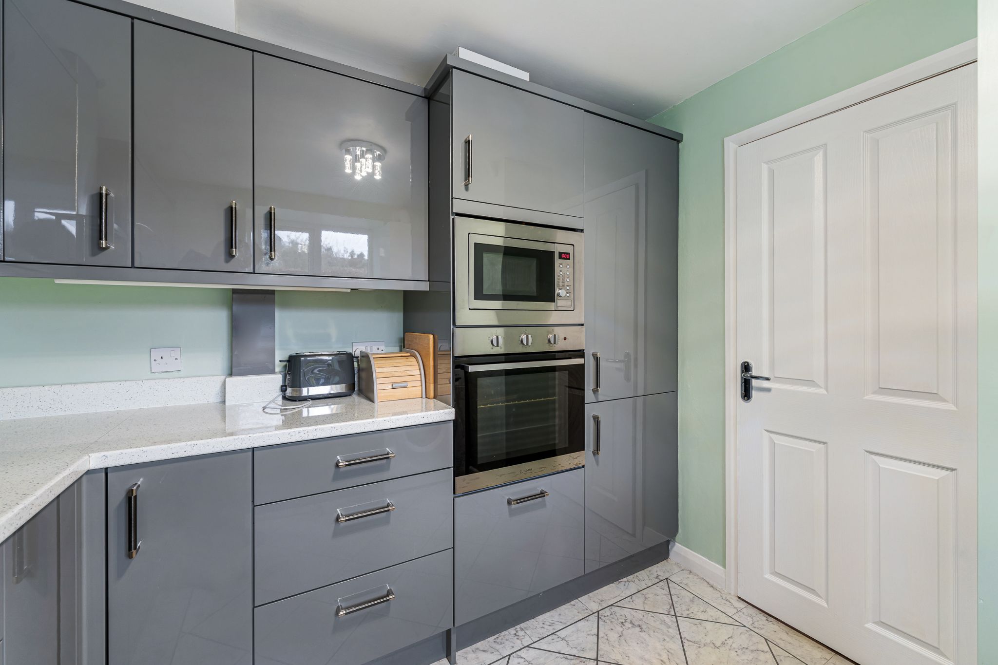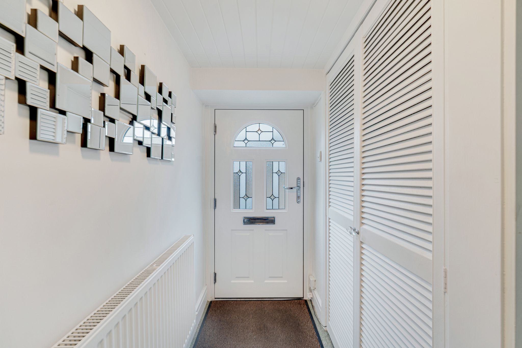 Park on the driveway and enter through the front door into a welcoming entrance hallway, complete with useful built-in storage cupboards. To the left, the kitchen overlooks the front and is fitted with stylish grey gloss wall and base units, complemented by quality worktops. Integrated appliances include a fridge freezer, dishwasher, oven, microwave, electric hob and extractor hood, with additional space for a washing machine. Continue from the entrance hallway into the spacious lounge, which offers ample under stair storage and room for both relaxing and dining. A feature fireplace with an electric fire creates a cosy cottage feel, while patio doors open out onto the rear, south-facing courtyard, providing an indoor-outdoor living space in the warmer summer months.