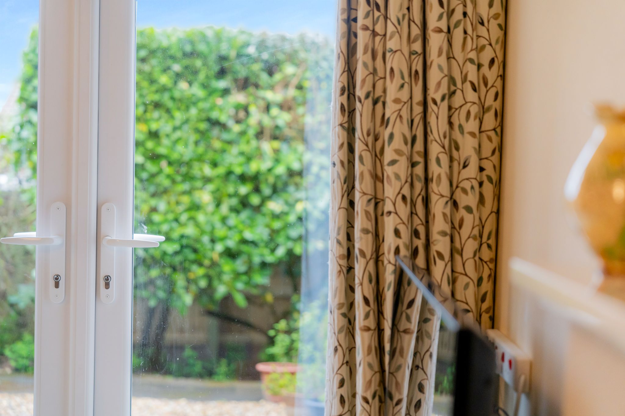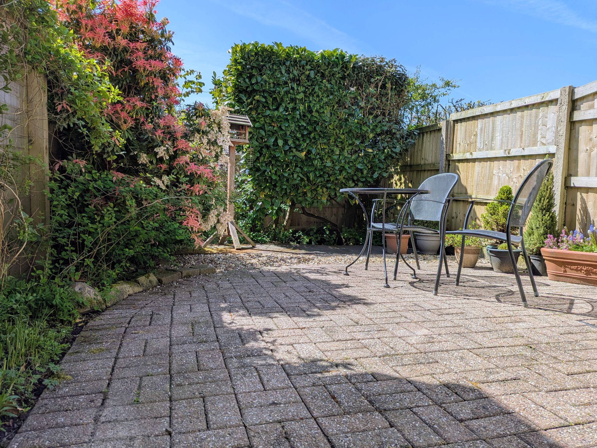 Step through the patio doors into your private, sheltered courtyard. The spacious patio provides an ideal setting for al fresco dining or relaxing in the sunshine, with surrounding shrubs and plants adding greenery and offering scope for gardeners. To the front of the property, a driveway provides convenient off-road parking, along with additional space for outdoor seating.