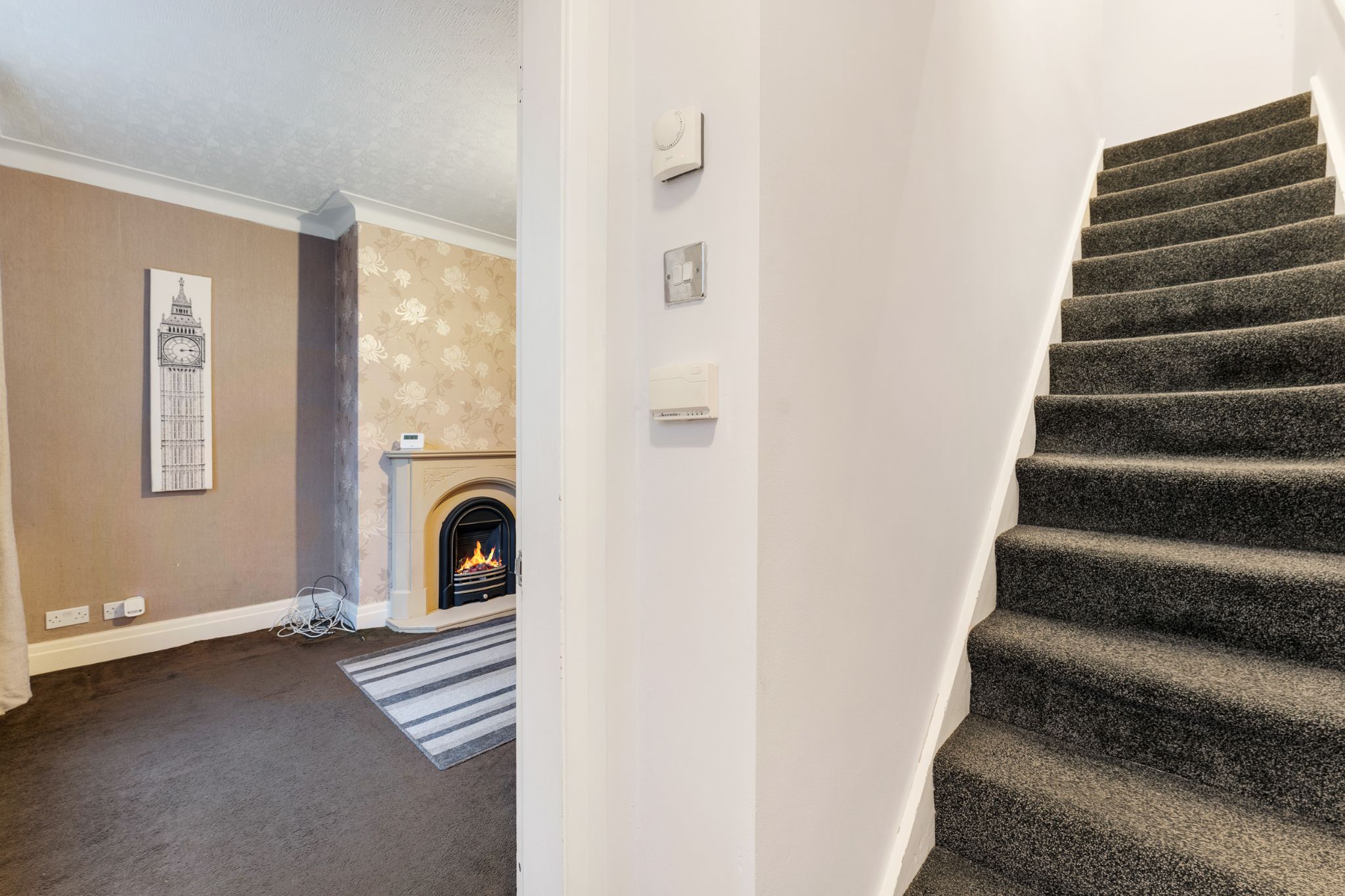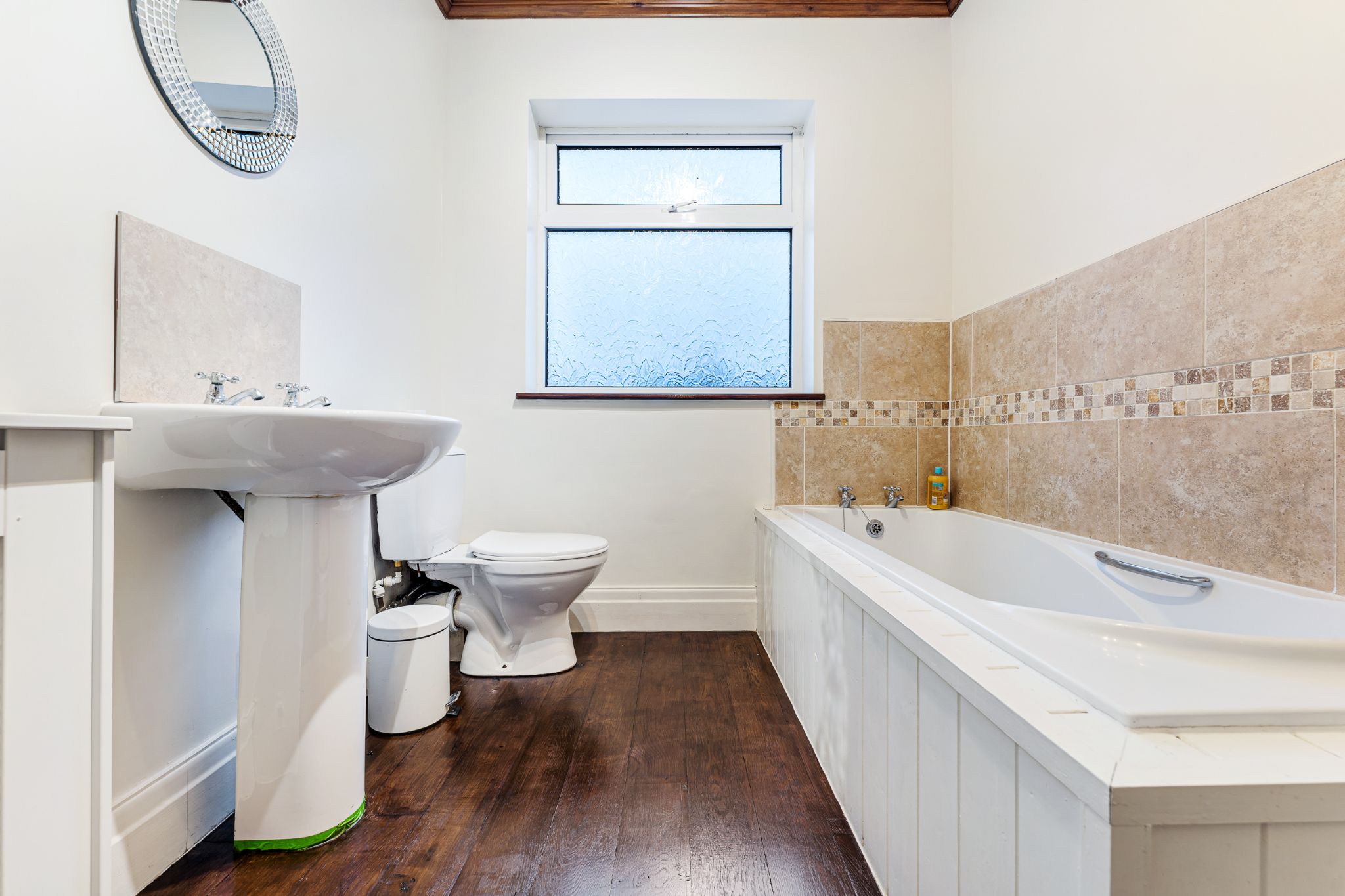 Retrace your steps back to the front door, and up the stairs you will find two double bedrooms and a 4-piece bathroom. The Master bedroom is a great size with fitted wardrobes and bedroom two is also well proportioned with views over the rear garden. The 4-piece bathroom is part tiled in neutral tones and comprises of a basin, bath, WC and enclosed shower.