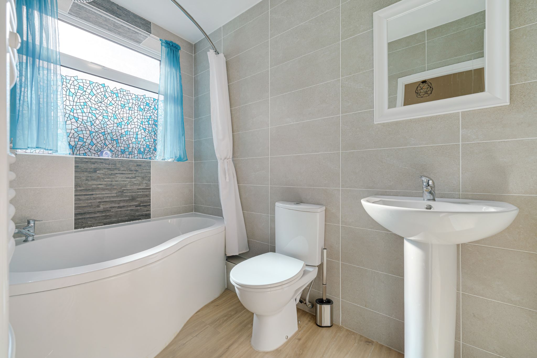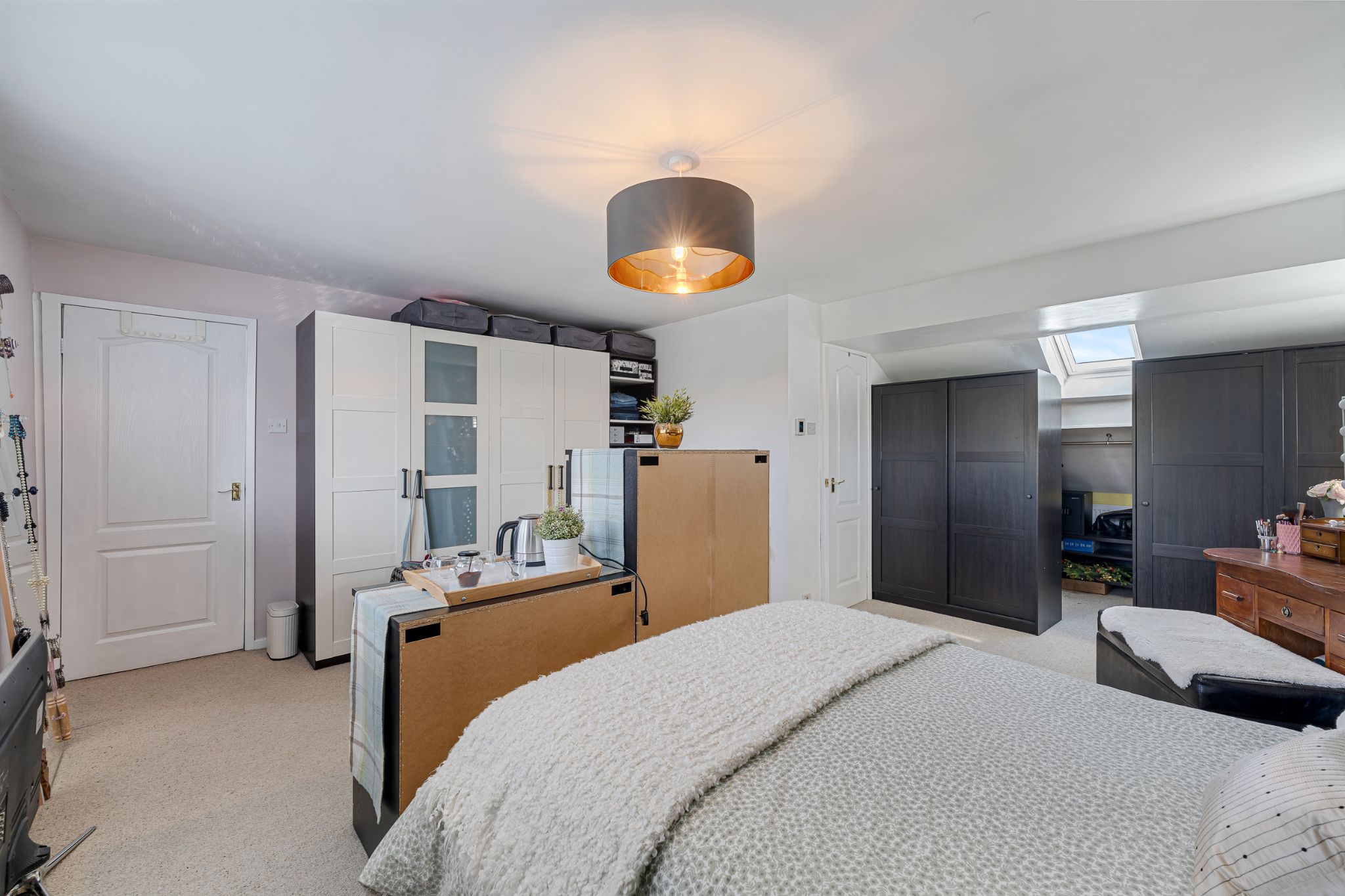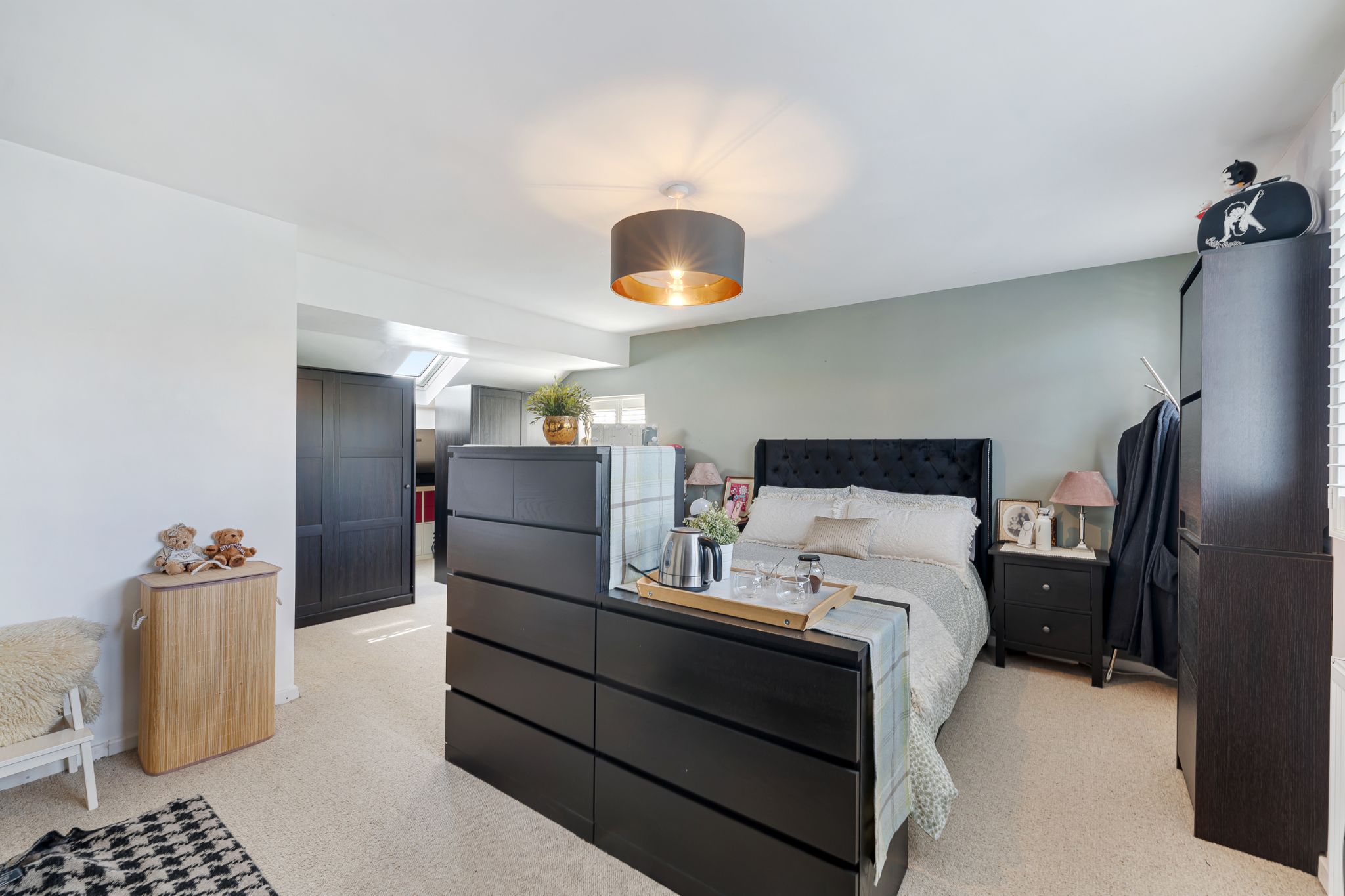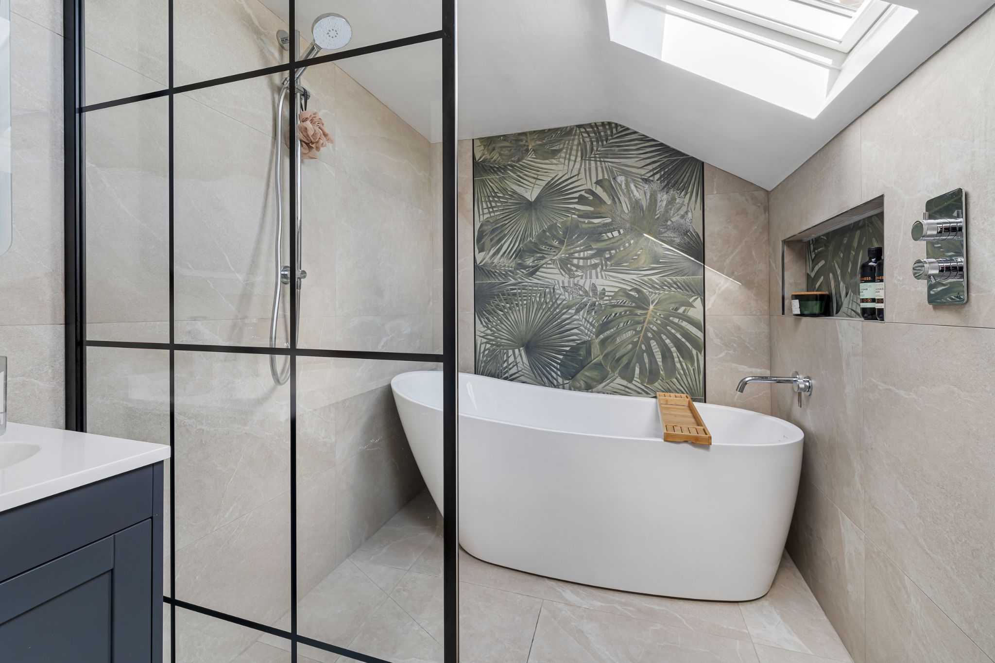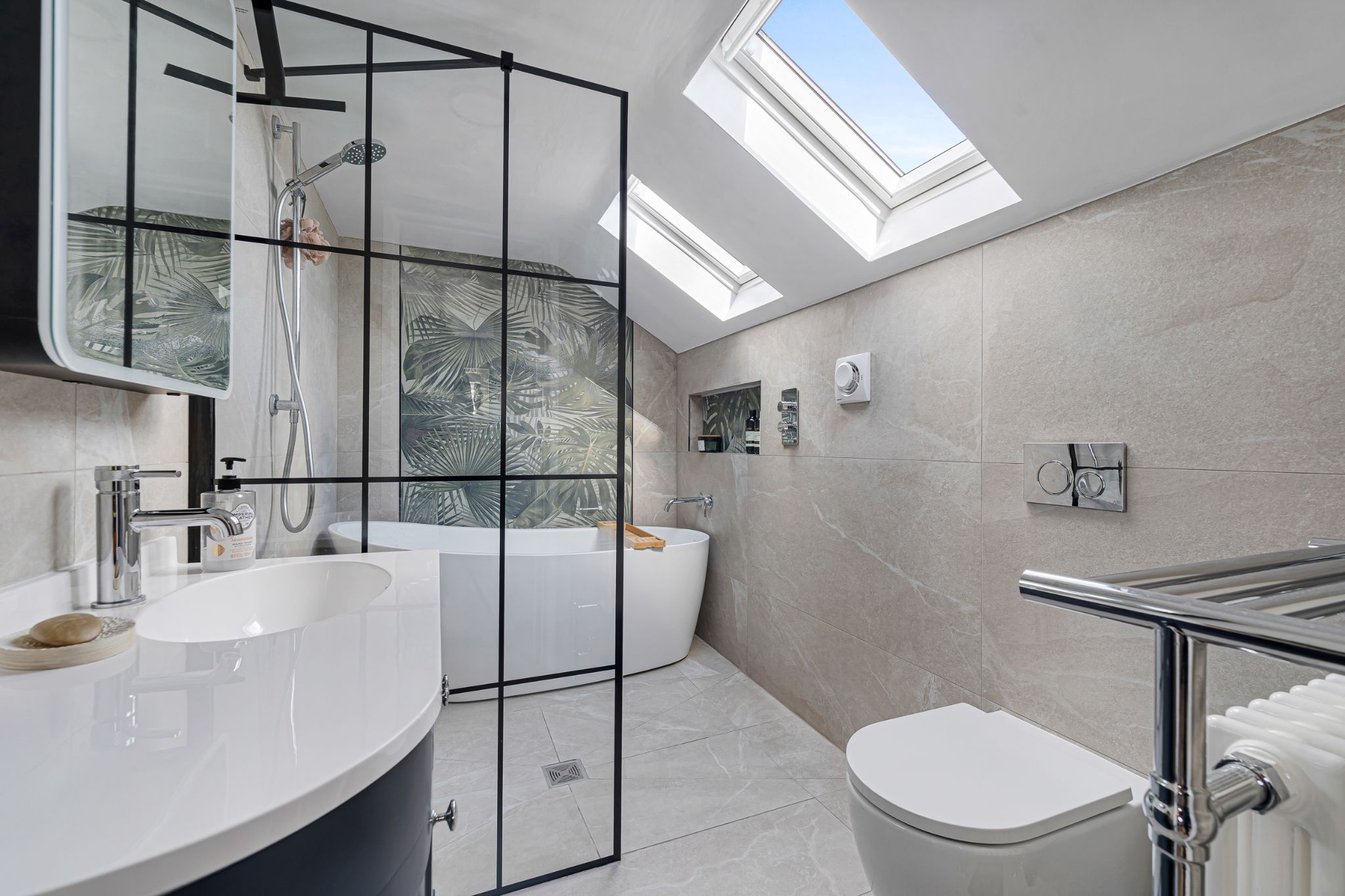 Upstairs, you will find a spacious dormer bedroom with an ensuite. The bedroom benefits from a Velux window and dual-aspect windows, allowing an abundance of natural light to fill the space, along with ample room for storage. The ensuite has been recently fitted and still benefits from several months remaining on the guarantee. It features stylish, neutral-toned tiling with a feature wall, underfloor heating and a range of lighting options, as well as two Velux windows. The suite comprises a vanity basin, WC with concealed cistern, large walk-in wet room shower and a bath.