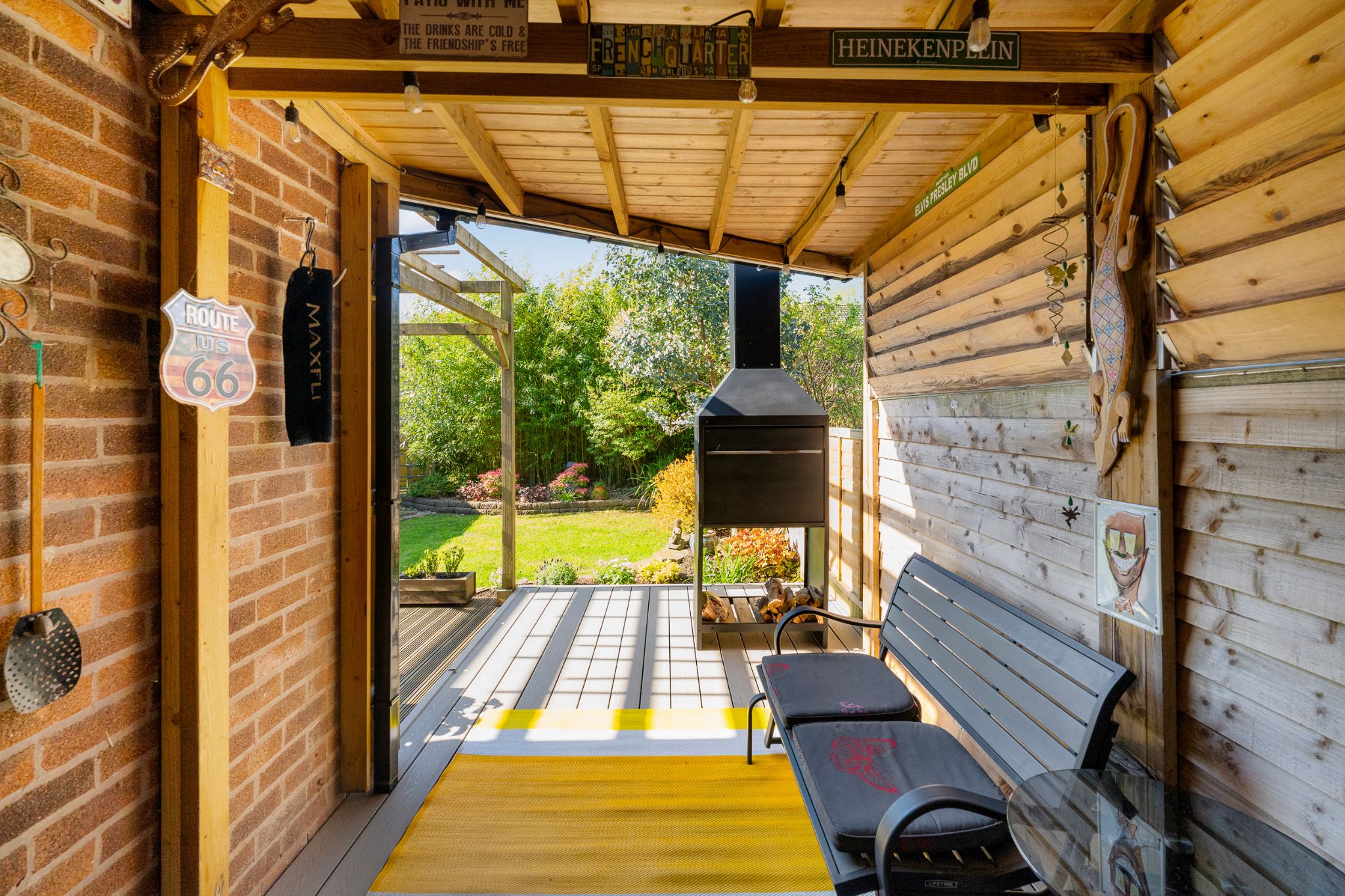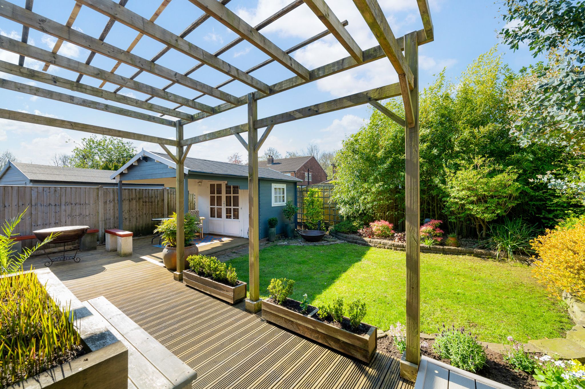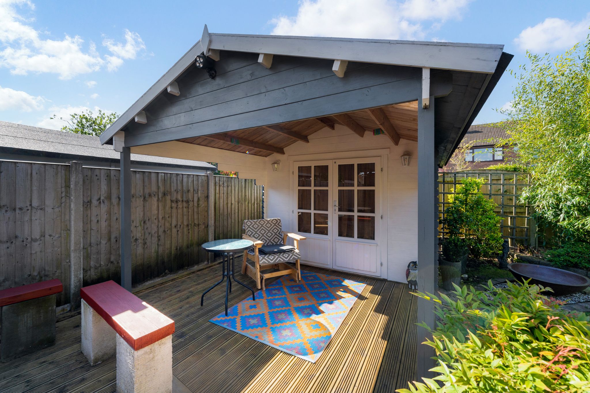 Stepping out onto the spacious decked patio, you’ll find a thoughtfully designed outdoor retreat, transformed by the current owners. With multiple areas for outdoor furniture, including a sheltered section and a charming wooden pergola, this is the perfect space to unwind and relax. There is a dedicated area for a BBQ, along with multiple outdoor power points and an external tap for added convenience. The lawn is bordered by mature shrubs and planting, offering an ideal space for gardening. An summer house / shed is also featured, complete with lighting and electricity, making it a versatile space suitable for a home gym, office, or a peaceful place to relax. To the side of the garden, a partitioned wooden wall can be opened up and give access to a bin store. A gate leads to the driveway, offering convenient parking.