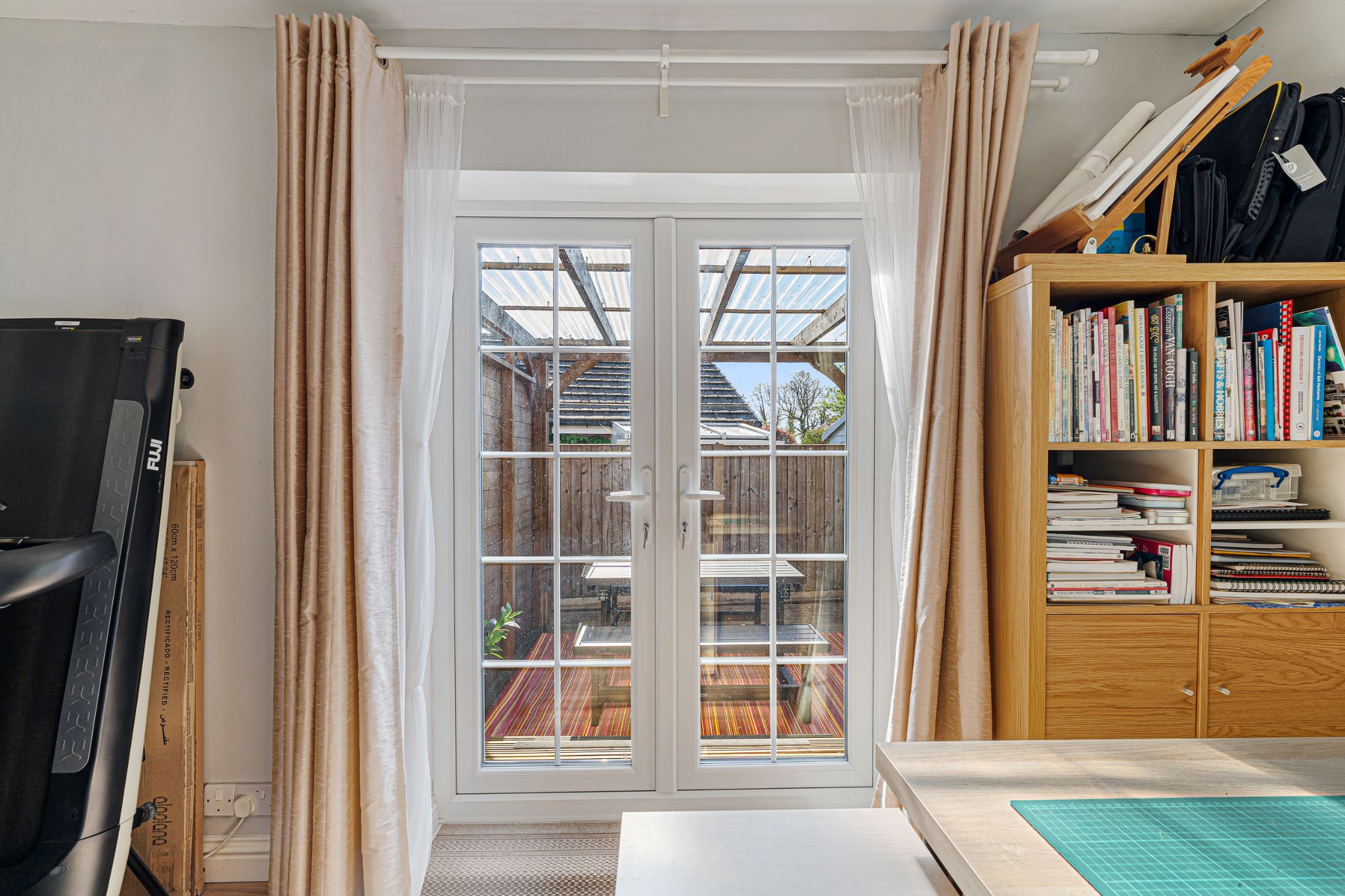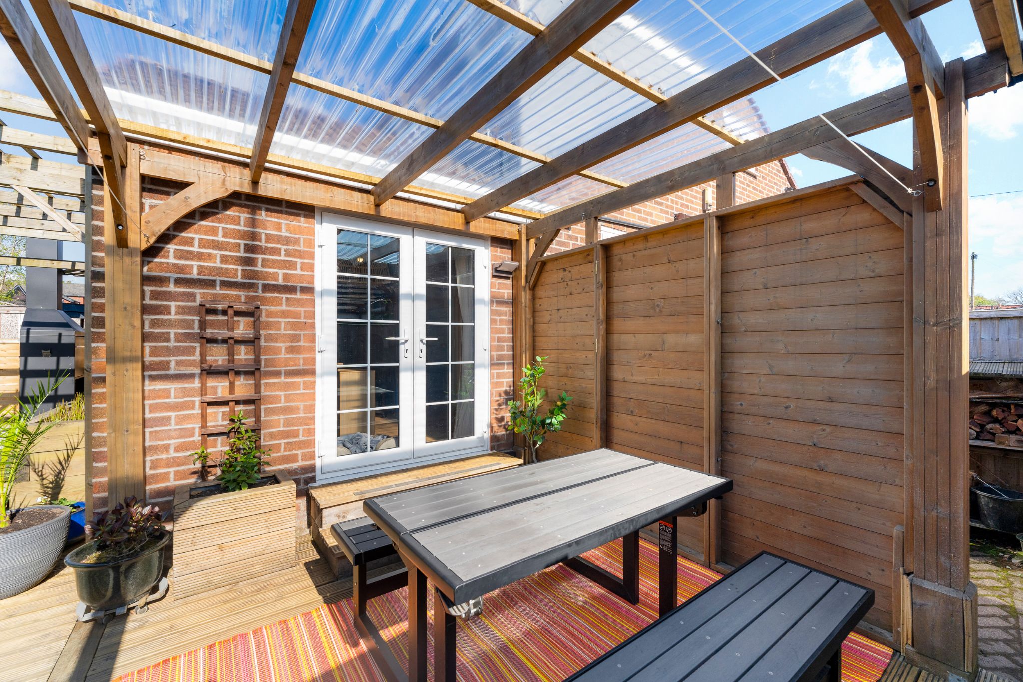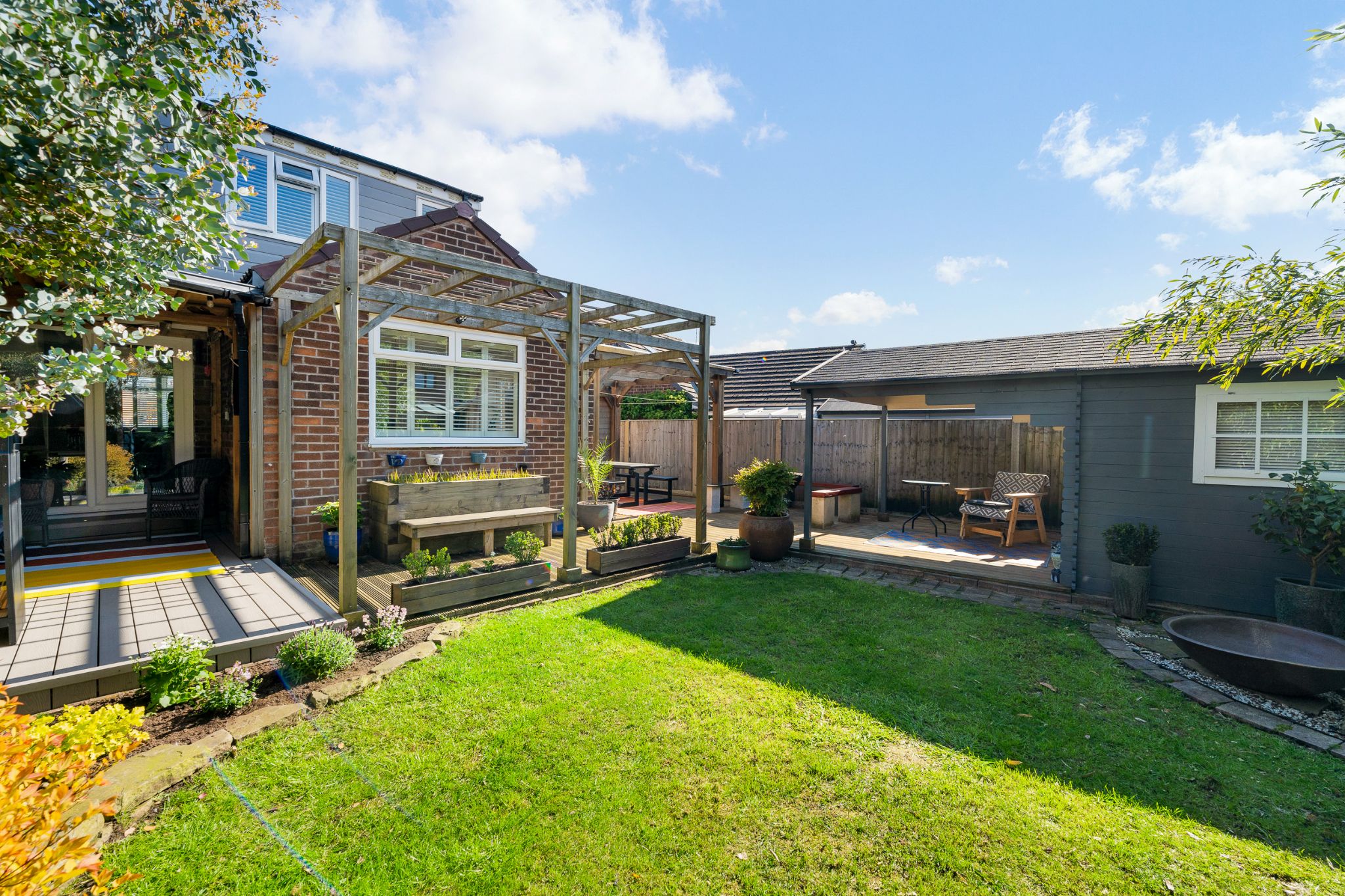 Stepping out onto the spacious decked patio, you’ll find a thoughtfully designed outdoor retreat, transformed by the current owners. With multiple areas for outdoor furniture, including a sheltered section and a charming wooden pergola, this is the perfect space to unwind and relax. There is a dedicated area for a BBQ, along with multiple outdoor power points and an external tap for added convenience. The lawn is bordered by mature shrubs and planting, offering an ideal space for gardening. An summer house / shed is also featured, complete with lighting and electricity, making it a versatile space suitable for a home gym, office, or a peaceful place to relax. To the side of the garden, a partitioned wooden wall can be opened up and give access to a bin store. A gate leads to the driveway, offering convenient parking.