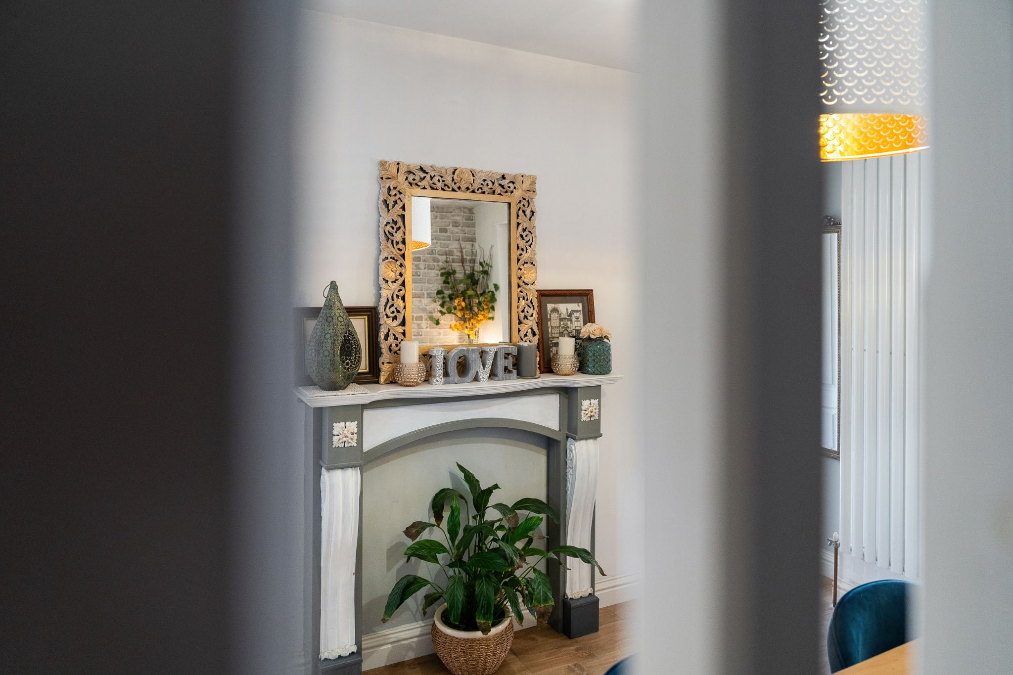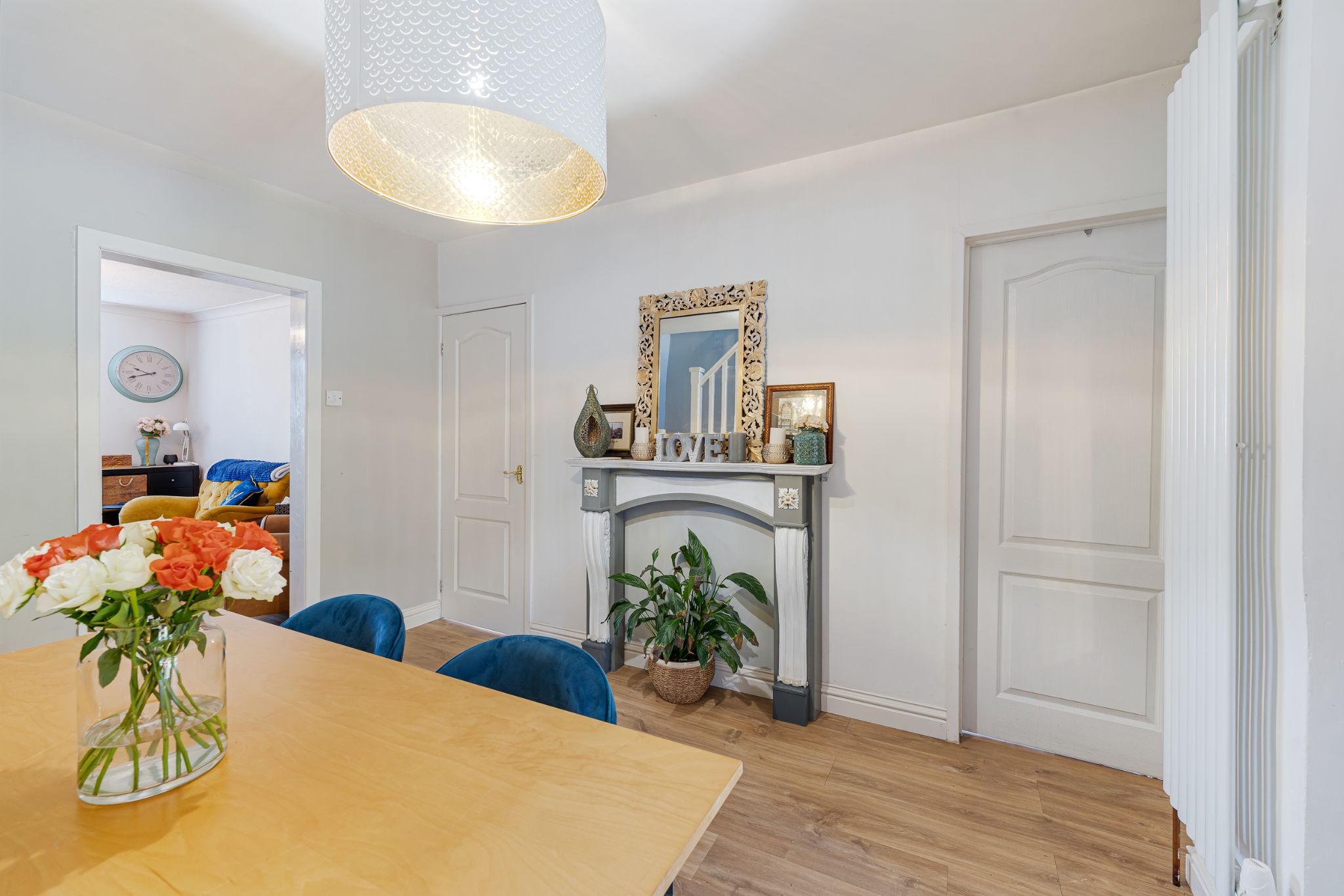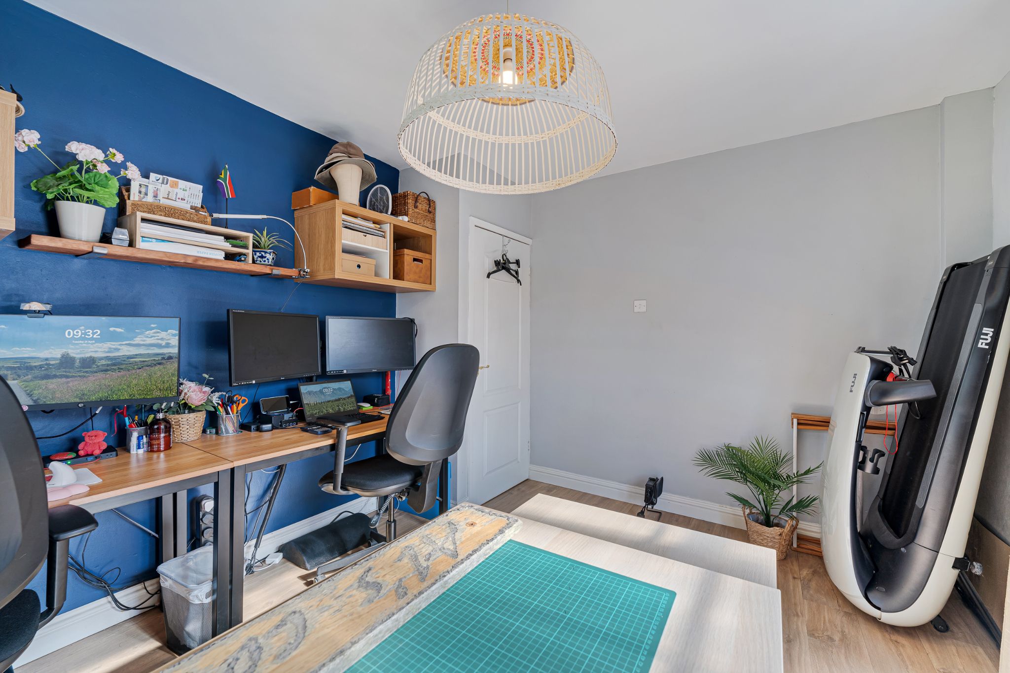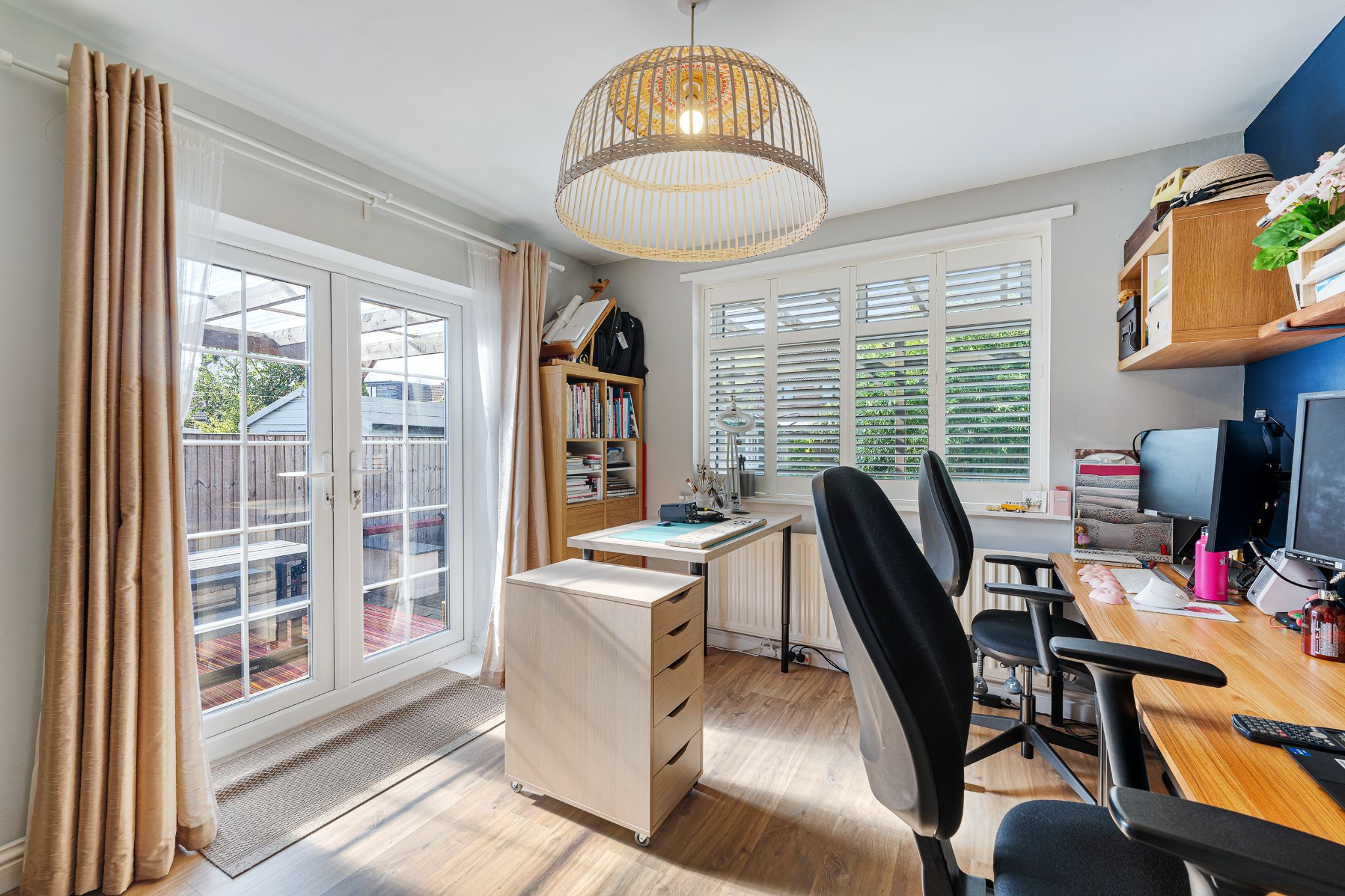 After parking on the driveway, step through the front door into a spacious entrance hallway. To your right, you’ll find the kitchen, fitted with stone coloured wall and base units, complemented by quality worktops and a tiled splashback. Integrated appliances include a stainless steel sink, electric induction hob with extractor hood, eye-level oven and grill, and a dishwasher. There is also space for a fridge freezer and washing machine. Returning to the hallway, continue through to the dining room, which offers ample space for seating and a dining table, with sliding patio doors opening onto the rear garden - bringing the outside in on those warmer summer months. Just off the dining room is the lounge, positioned at the front of the home and featuring a large window with stylish plantation shutter blinds, a feature found throughout the property. A fireplace with a gas log fire creates a cosy focal point. Also accessed from the dining room is a double bedroom currently being used as a home office, a versatile space with patio doors leading to the rear garden. This room could easily be adapted for a variety of uses, including a second bedroom, study or snug. Completing the ground floor is the three-piece bathroom, comprising of a wash basin, WC, heated towel rail and a bath with overhead rain shower.