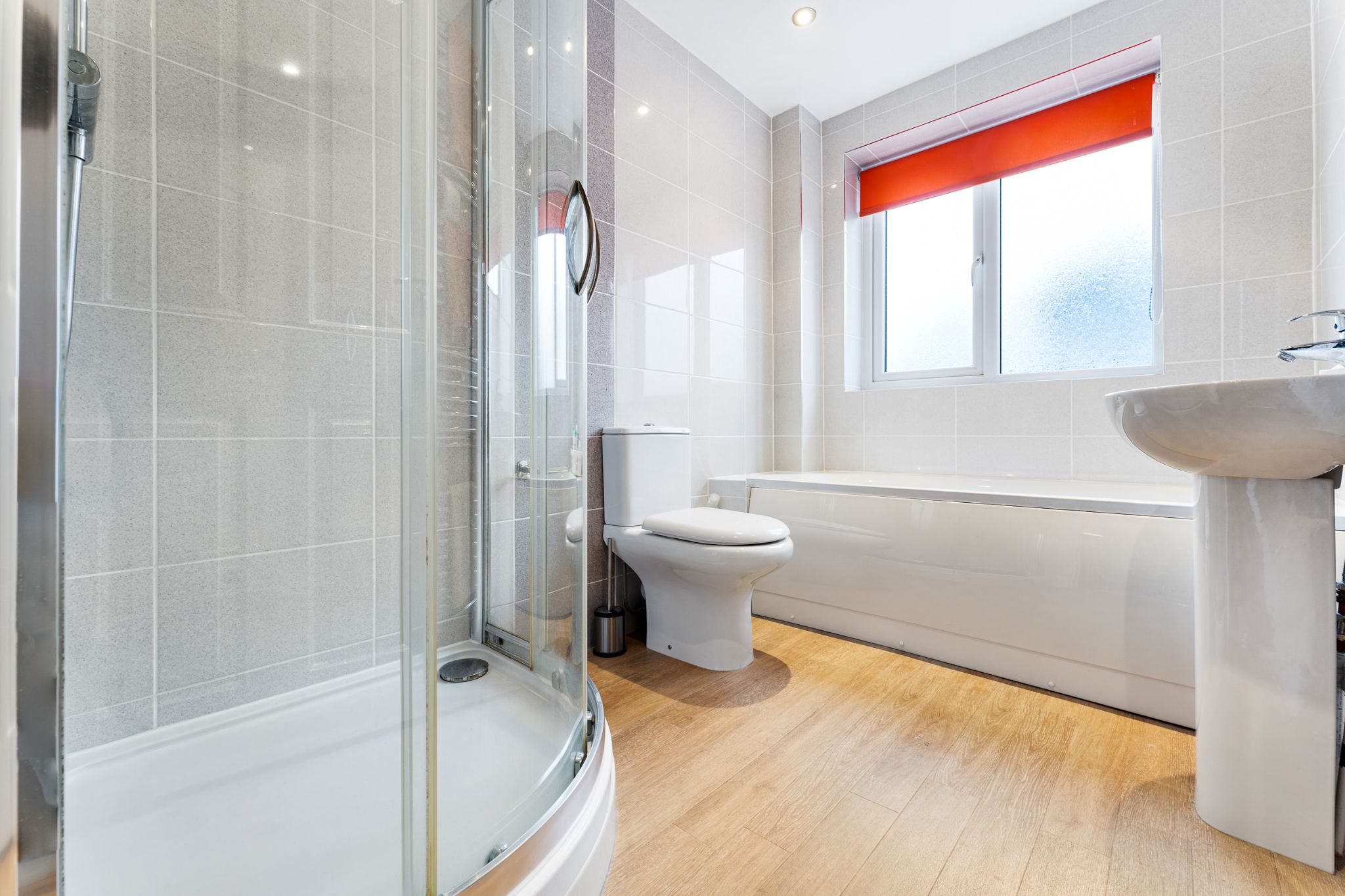 Ascending the staircase you will find three bedrooms and the four-piece family bathroom. The master is a double, viewing over the rear garden with in built storage. Bedroom two is a spacious double, also with in built storage and the third bedroom is well-sized single that is currently being used as a home office/ study. On the landing you will find a cupboard that houses the boiler. The four-piece family bathroom is full- tiled and consists of a WC, basin, enclosed shower, bath and chrome heated towel rail.