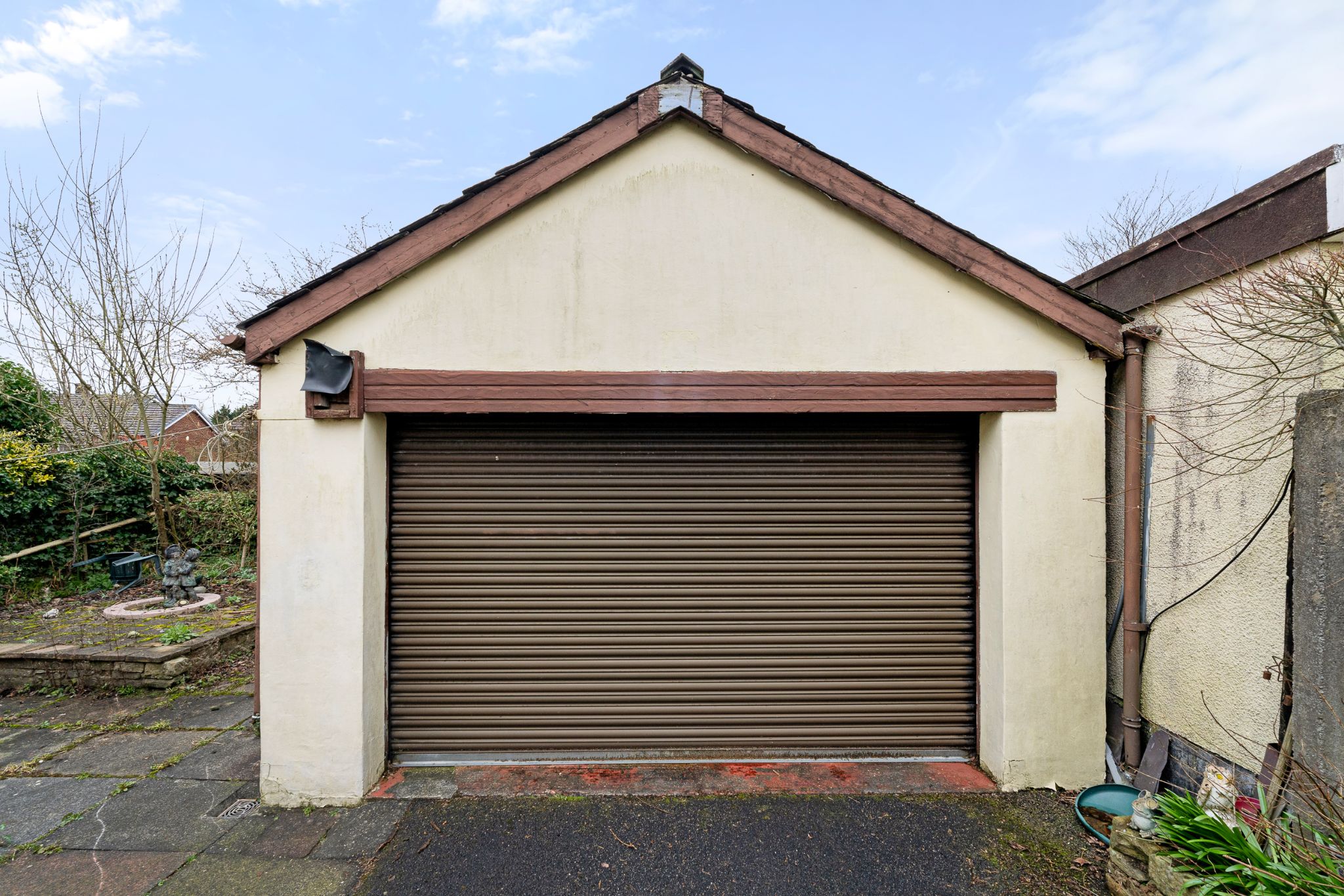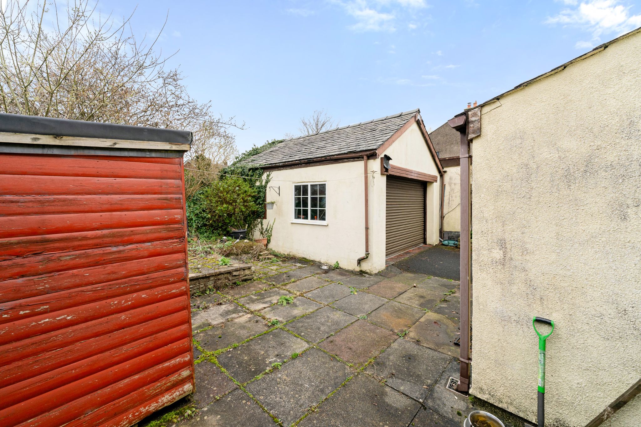 The rear courtyard offers ample space for outdoor furniture, making it an ideal spot to relax and enjoy the warmer summer months, while a shed provides excellent outdoor storage. To the front of the property, a large driveway offers convenient off-street parking, alongside a double stone garage benefitting from lighting and electricity for further storage or practical use. The driveway extends to the front of the home, where there is also a low-maintenance garden area.