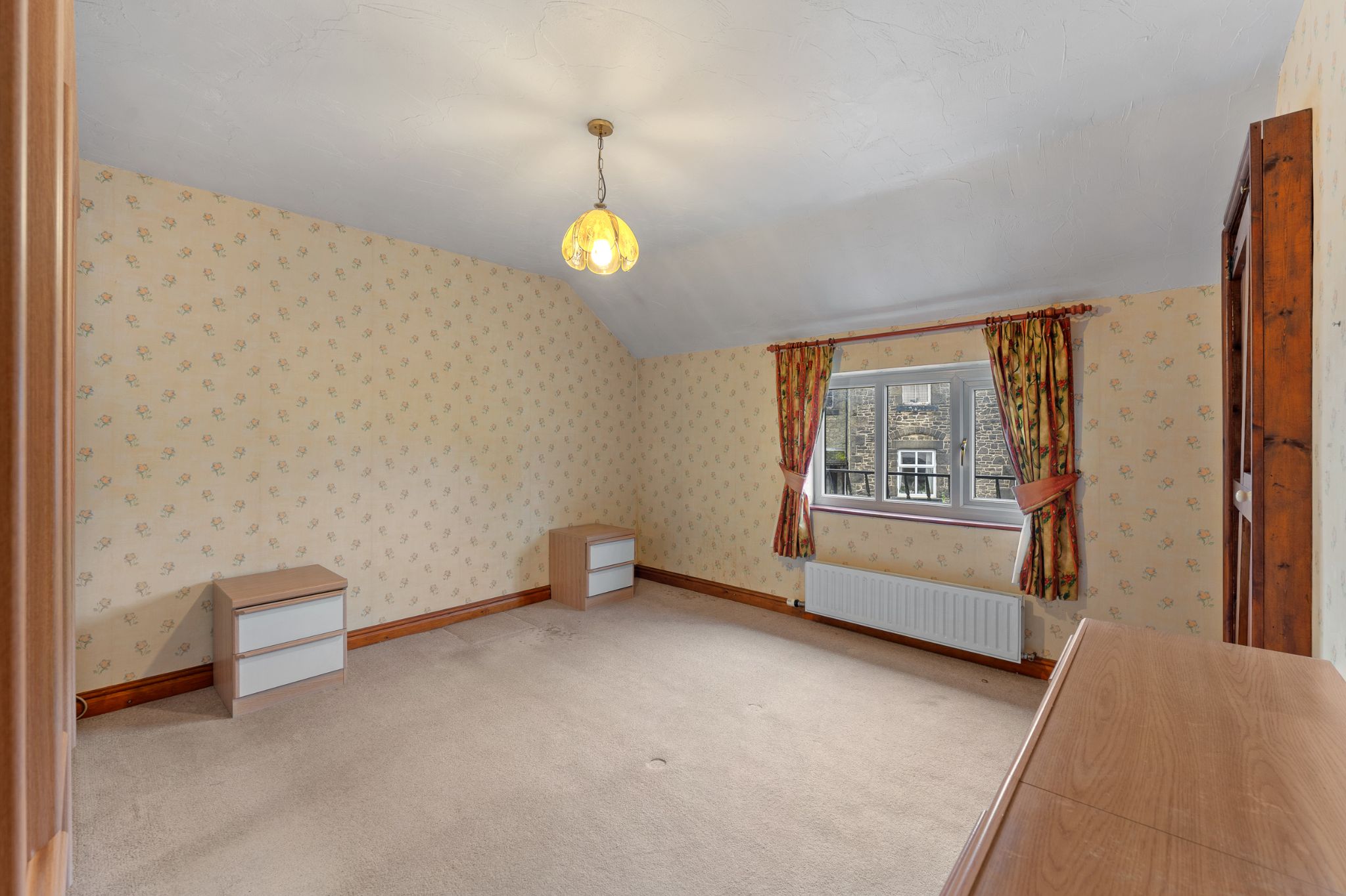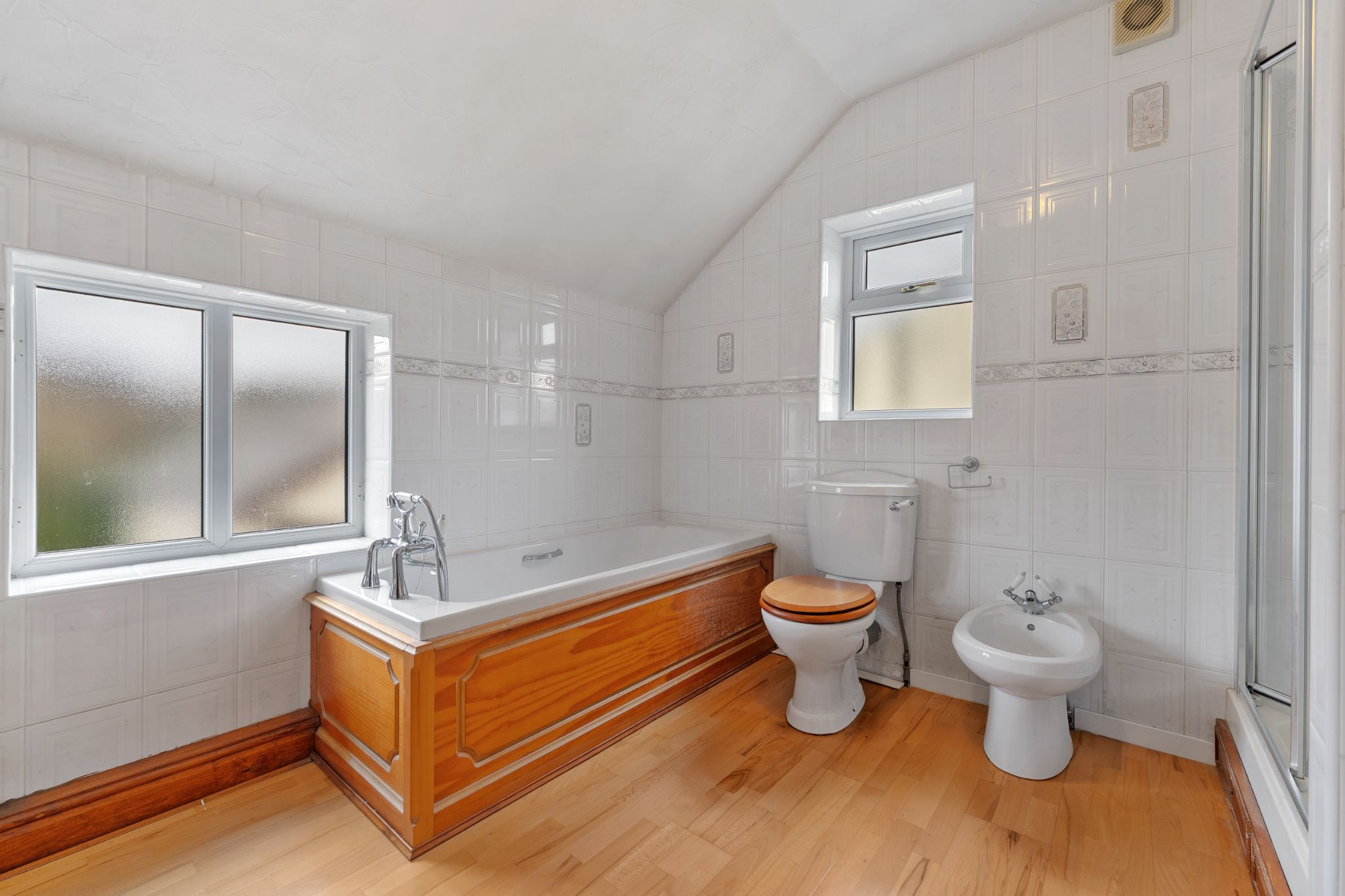 Retrace your steps to the lounge and up the stairs to the first floor, you will find three well-proportioned bedrooms and a five-piece family bathroom. The master bedroom is situated to the front of the property and benefits from fitted furniture and a useful storage cupboard. Bedroom two is a generously sized double, while bedroom three is a spacious single overlooking the rear courtyard. The family bathroom is located at the end of the landing and is fully tiled, featuring a wash basin, WC, bidet, heated towel rail, bath, and a separate enclosed shower.