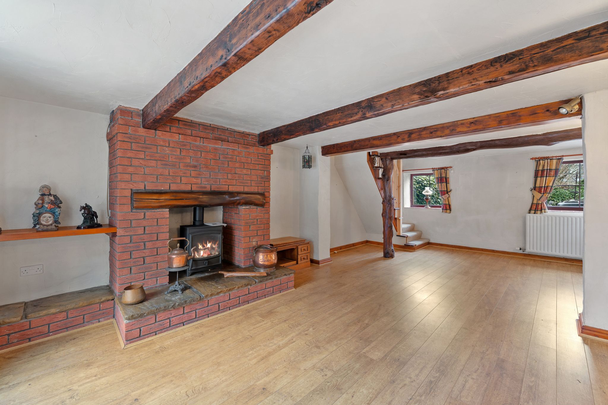 After parking on the driveway, you are welcomed into an entrance vestibule leading through to a spacious lounge. This characterful home boasts original ceiling beams and charming features throughout. The lounge extends the full length of the property, with windows to both the front and rear allowing for an abundance of natural light, and is centred around a striking brick fireplace with a gas log burner stove, creating a cosy cottage feel. Continuing through, the kitchen-diner offers ample space for a dining table and is fitted with a range of wooden wall and base units. Integrated appliances include an extractor hood, gas hob and stainless steel sink, with additional provisions for an oven and space for a fridge freezer. Just off the kitchen, there is a convenient downstairs WC and a utility room, also fitted with base units and a stainless steel sink, with space for a washing machine and a door leading out to the rear courtyard.