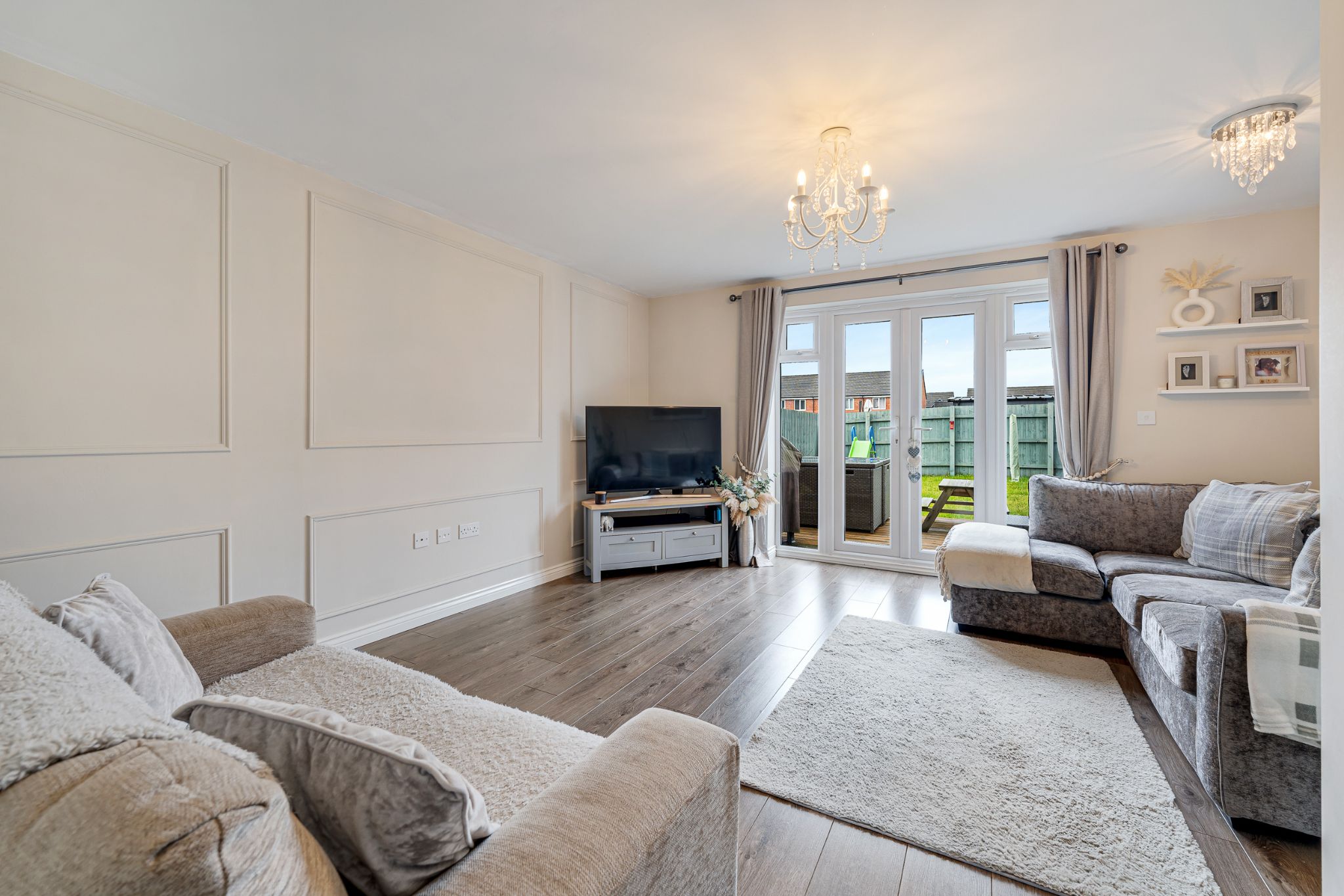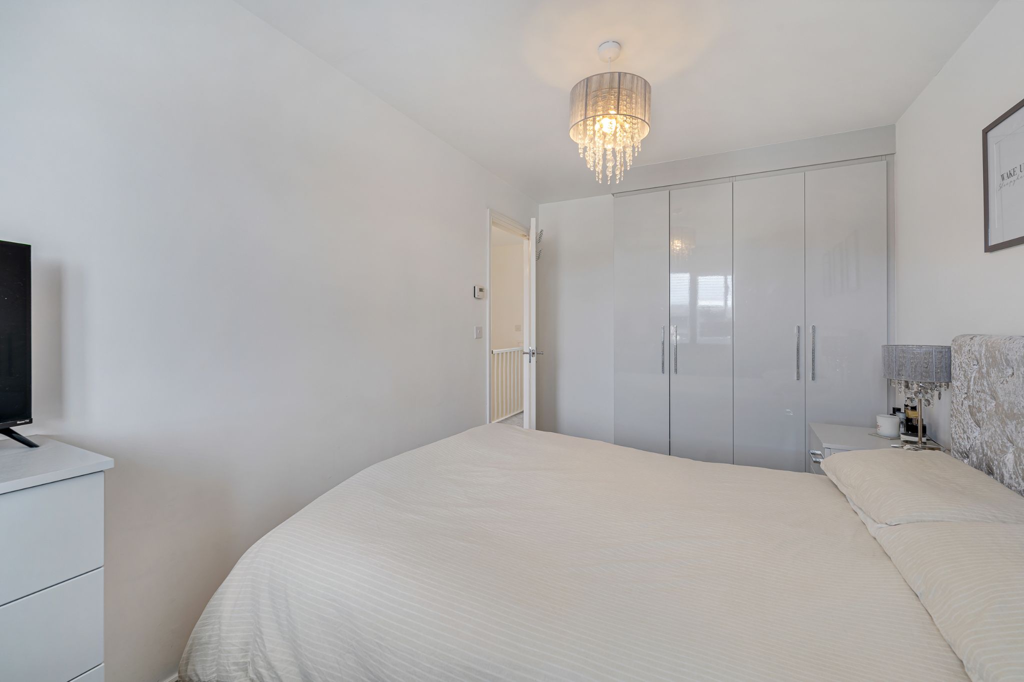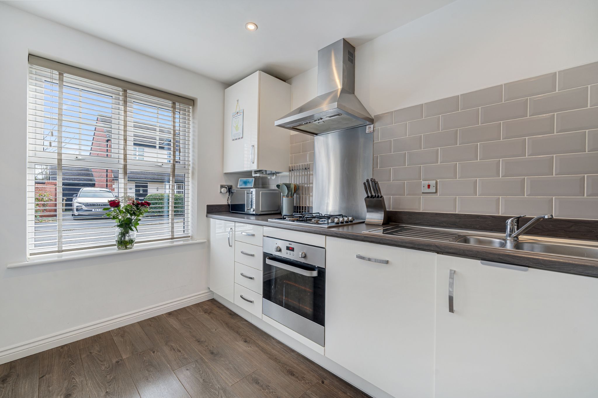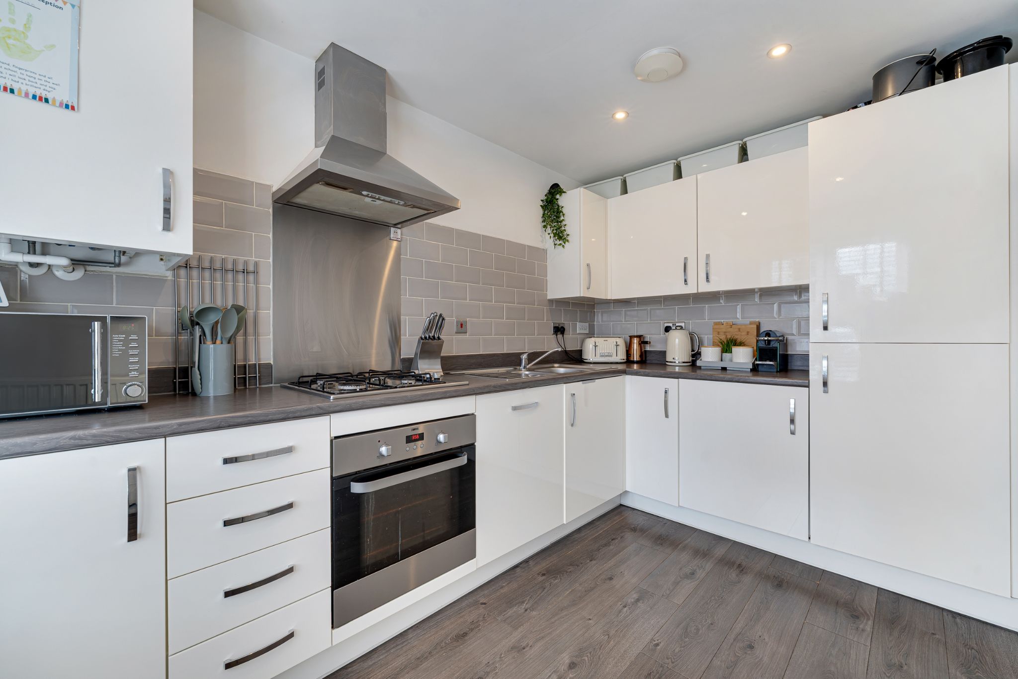 Into the welcoming entrance hall, the first room to discover is the kitchen, fit with a range of high-gloss wall and base units complemented by a stylish tiled splashback. Integrated appliances include an extractor hood, gas hob, oven, fridge freezer, dishwasher, washing machine, and a stainless steel sink. Continuing down the hallway, you are led into the spacious lounge, featuring patio doors that open out to the rear garden, allowing plenty of natural light into the room and seamless indoor-outdoor living. An under stair storage cupboard provides useful space for everyday household items. Completing the ground floor is a convenient downstairs WC, ideal for visiting guests.