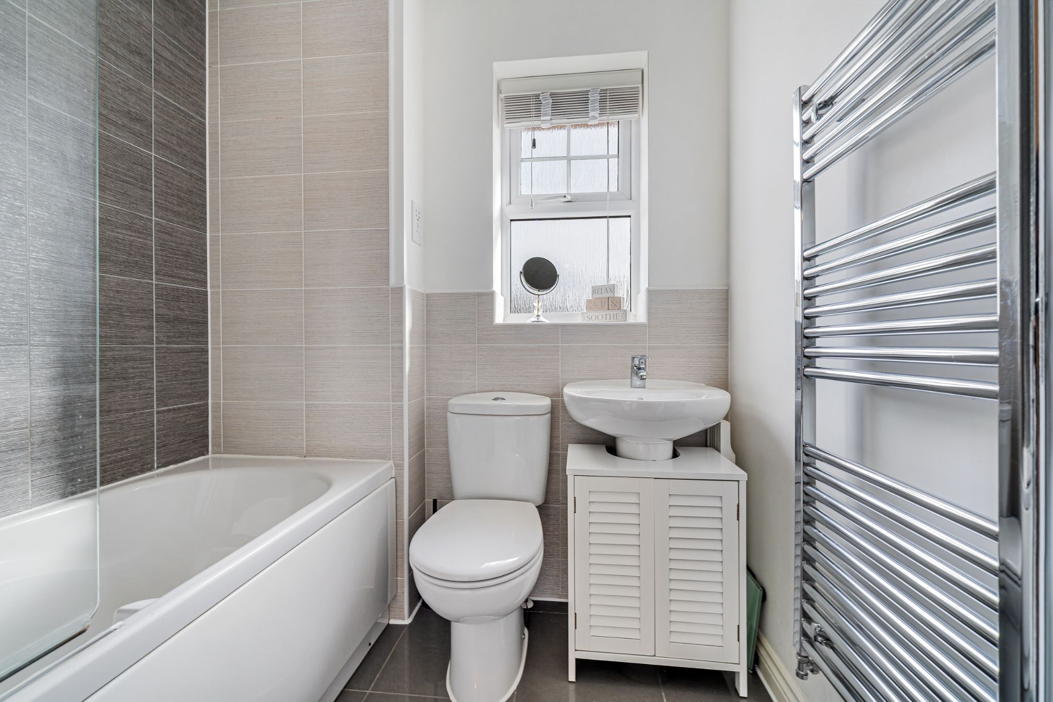 Returning to the entrance hallway and up the stairs, you will find three well-proportioned bedrooms and a modern three-piece family bathroom. The master bedroom is a generous double positioned to the rear of the property, benefitting from fitted wardrobes. Bedroom two is also a comfortable double, while bedroom three is a spacious single, ideal as a child’s bedroom, home office or guest room. The family bathroom is part-tiled in contemporary tones and comprises a bath with overhead shower, wash basin, WC, and a chrome heated towel rail.