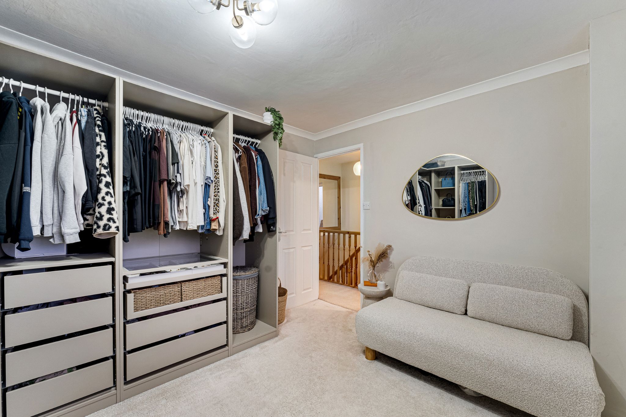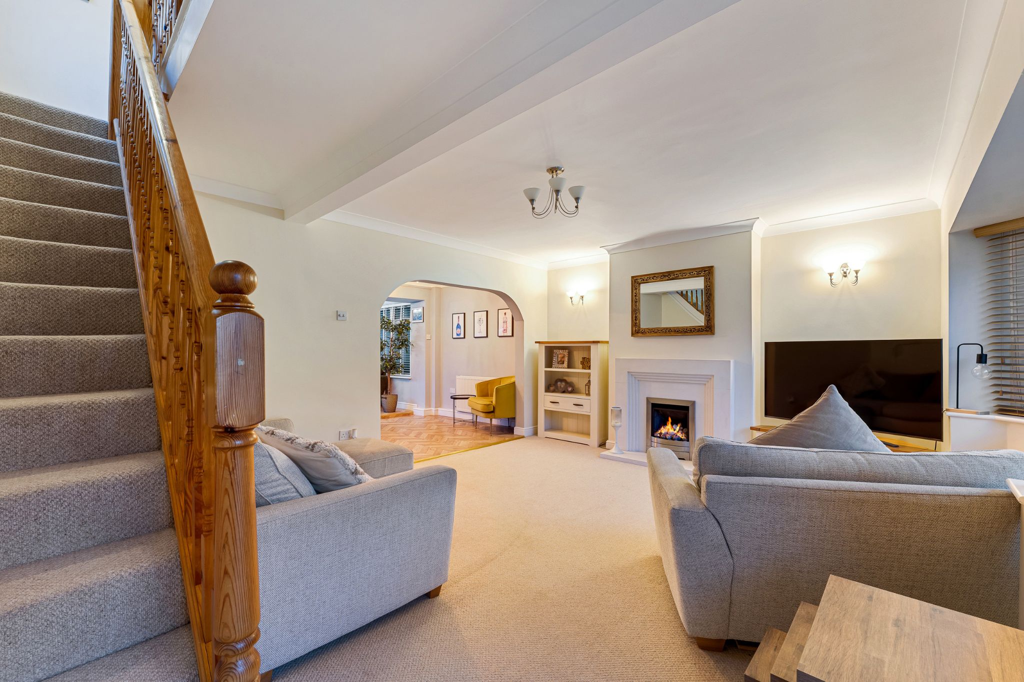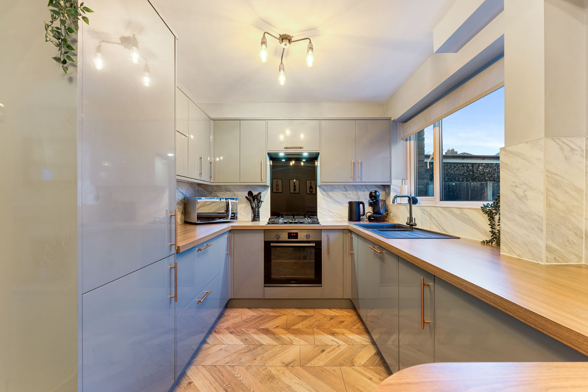 Into your entrance vestibule and through to your spacious lounge, a living flame gas fire takes centre stage and gives the room a warm glow. A lovely bay window looks over the front garden. The next room to discover is the impressive open plan kitchen-diner, featuring grey high gloss fitted wall and floor units with complimentary rose gold handles. Integrated fridge/freezer, dishwasher and washing machine, 4 ring gas hob with an extractor above and oven below. A breakfast bar is the perfect spot to enjoy your morning coffee, as well as space for a dining table. You’ll notice the fabulous herringbone effect laminate wood floor underfoot, which leads through into the sitting room, windows look over the garden and French doors open up to the Indian Stone flagged patio. Retrace your steps to the lounge to climb the staircase to the first floor.