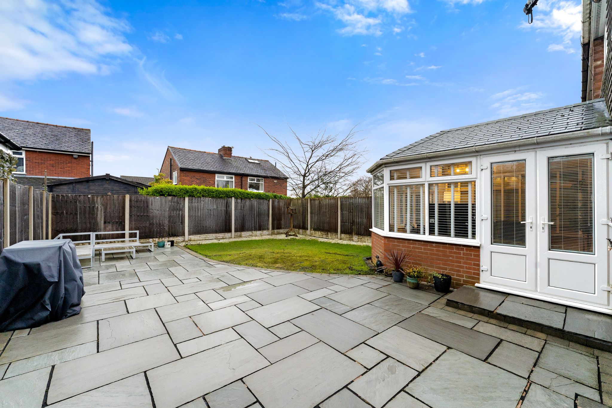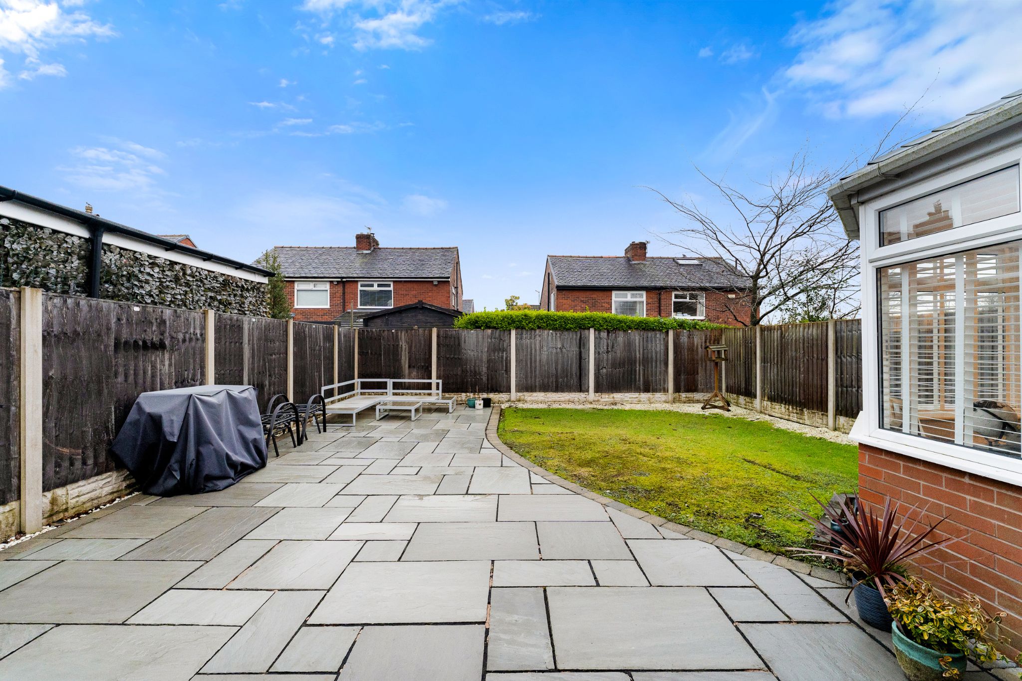 The rear garden is a generous size and includes a large grey Indian Stone flagged patio, perfect to position your garden furniture and BBQ to enjoy the summer sun. Whilst the adults are relaxing on the patio, they can watch the kids play happily on the lawn. To the front is a garden with a flagged driveway for off road parking.
