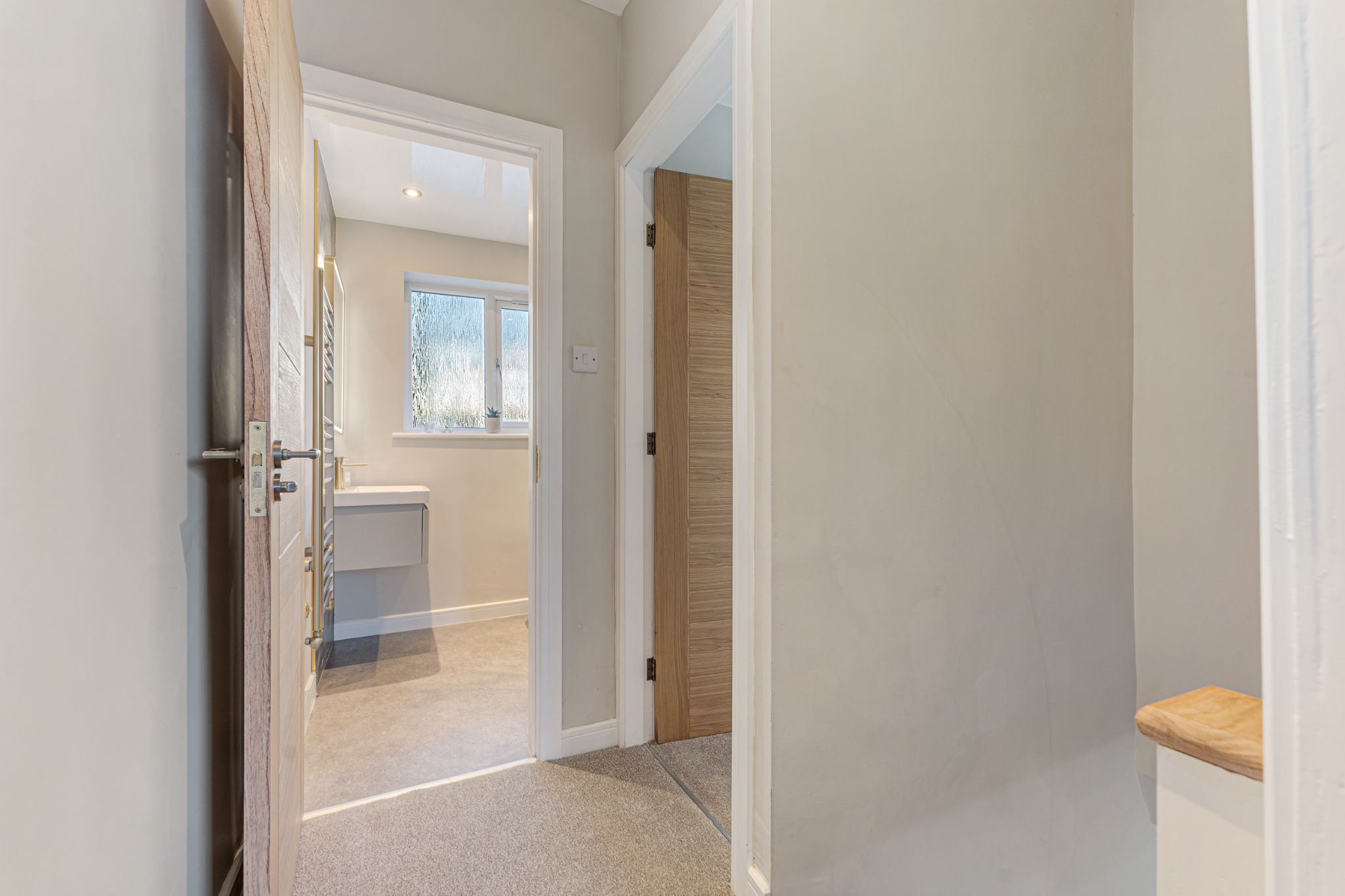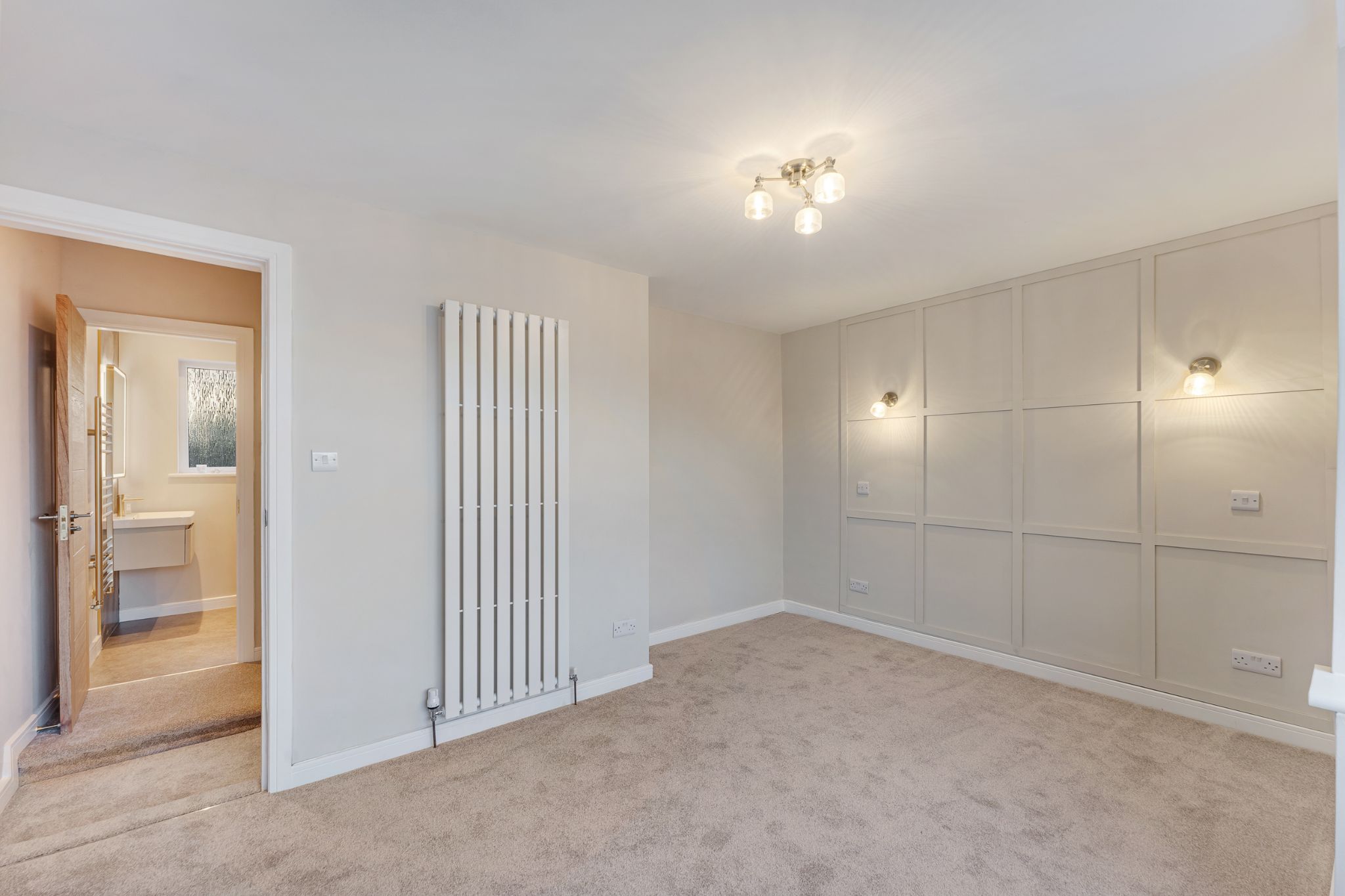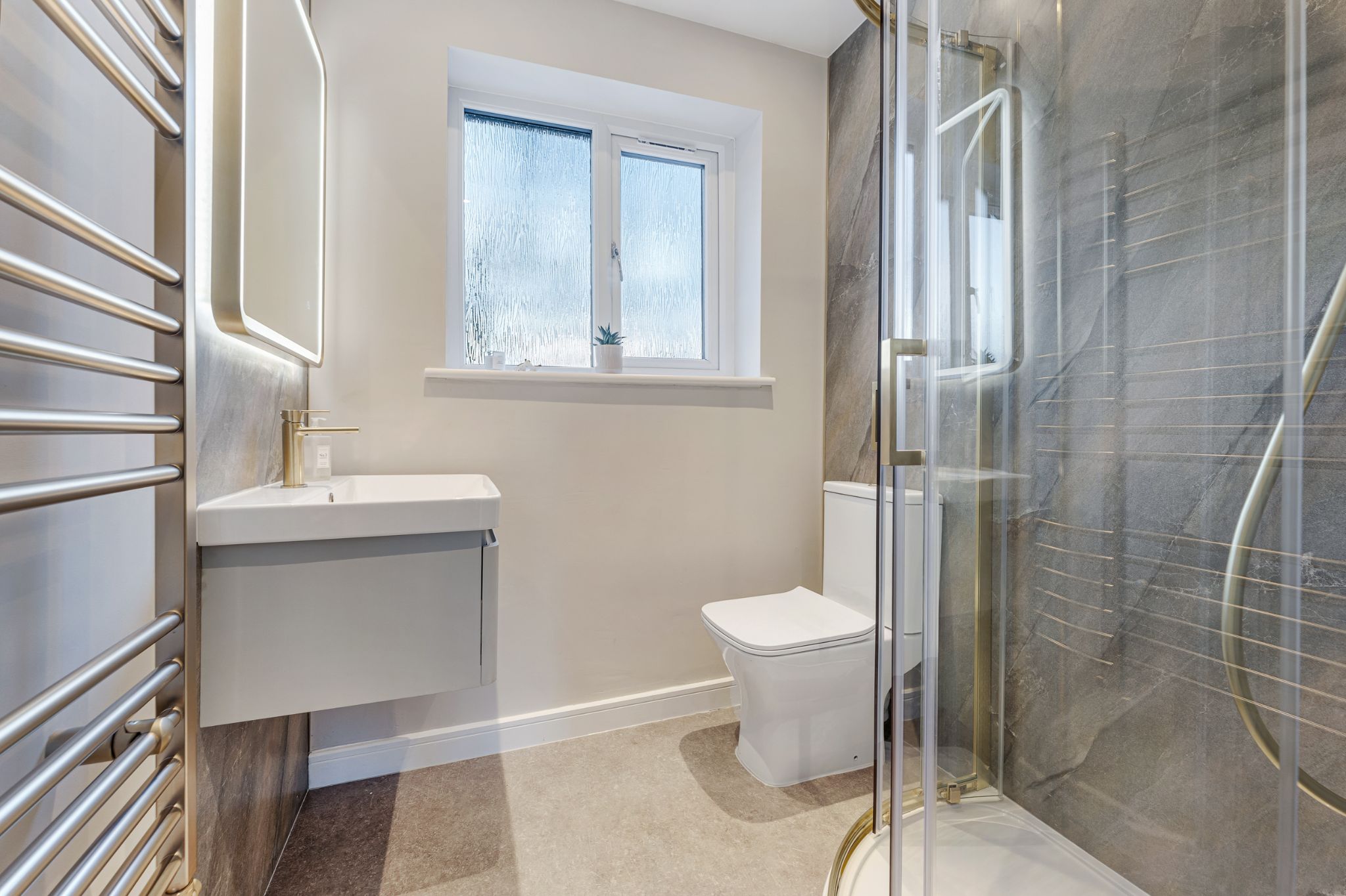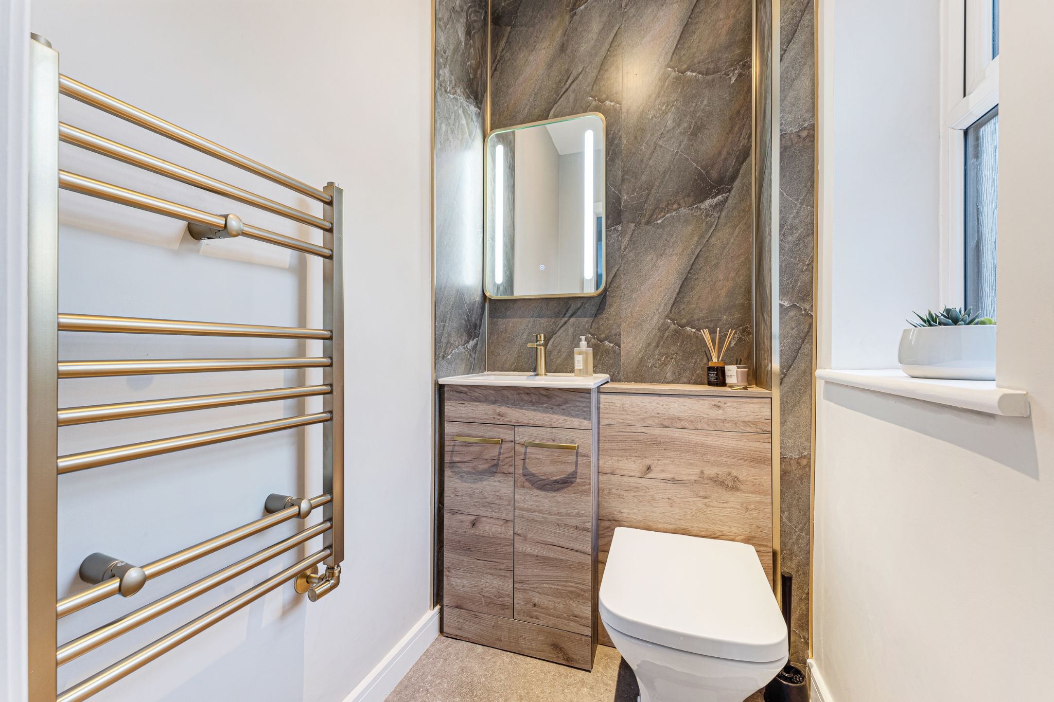 Integrated appliances include an electric combi oven and microwave, induction hob, fridge freezer, dishwasher, and a stylish matt black sink. A useful storage cupboard houses the new boiler and provides plumbing for a washing machine. There is ample space for a dining table, complemented by a lantern roof skylight and bi-folding doors that open onto the rear garden, creating a bright and airy space ideal for entertaining during the warmer months. The third bedroom can be utilised for a variety of uses, it is generously sized located on the ground floor, benefiting from its own lantern skylight and double patio doors leading directly to the rear garden. Completing the ground floor is a convenient WC, part-tiled and fitted with a vanity basin, WC with concealed cistern, LED mirror, and a brass heated towel rail.