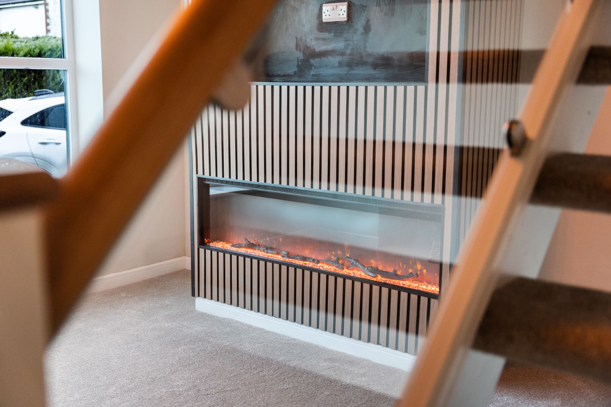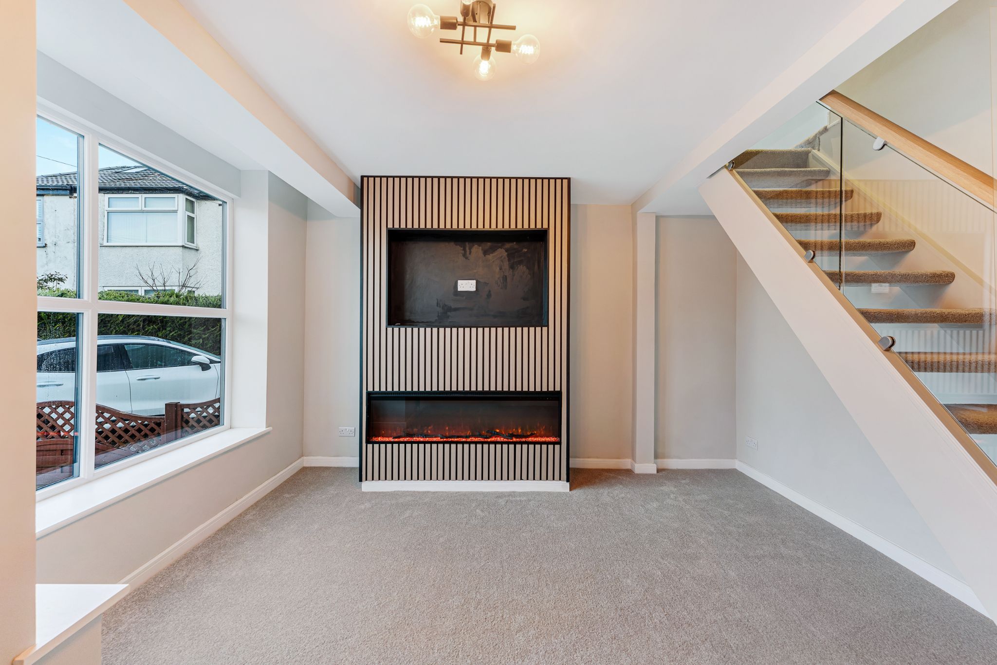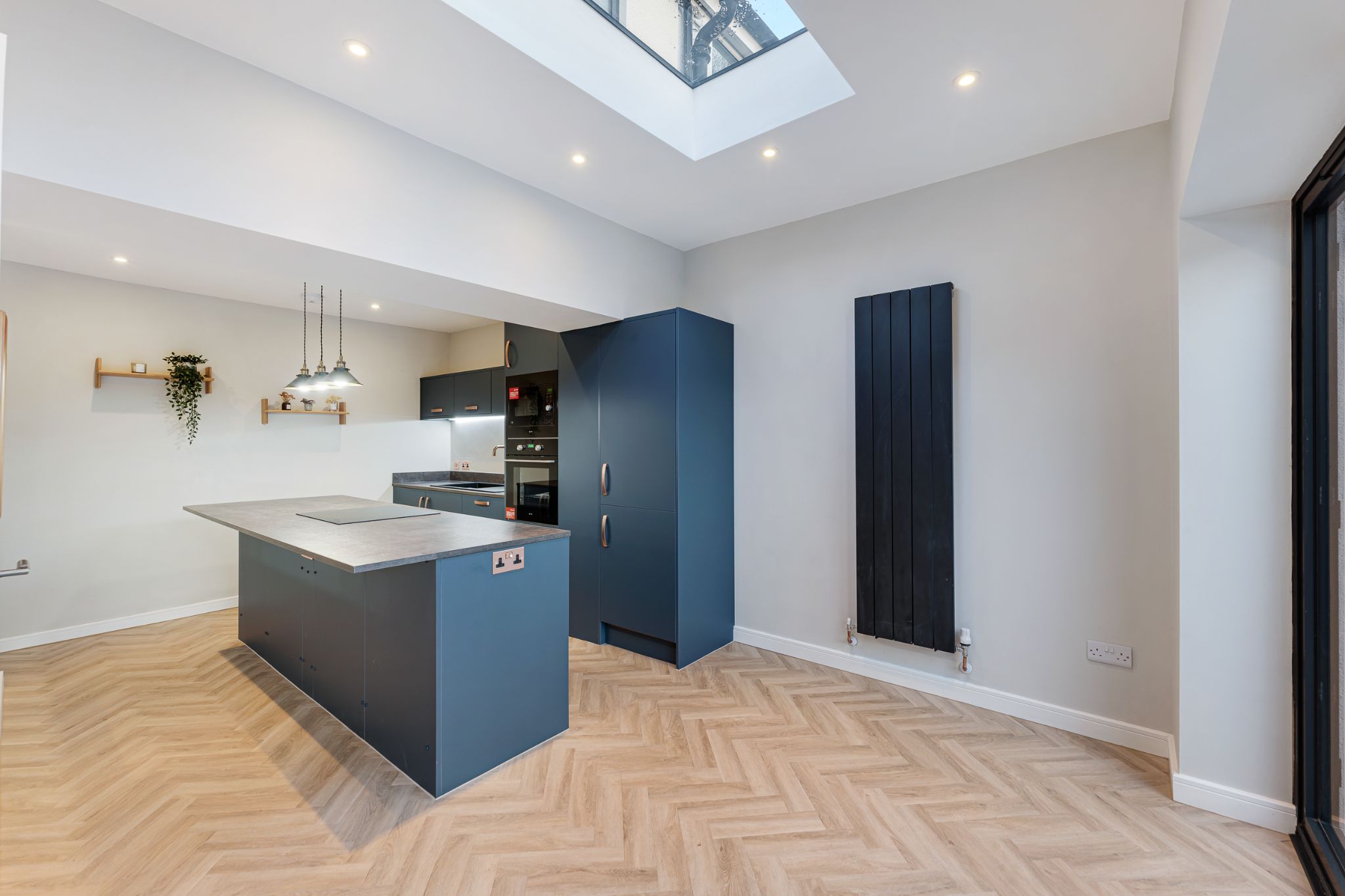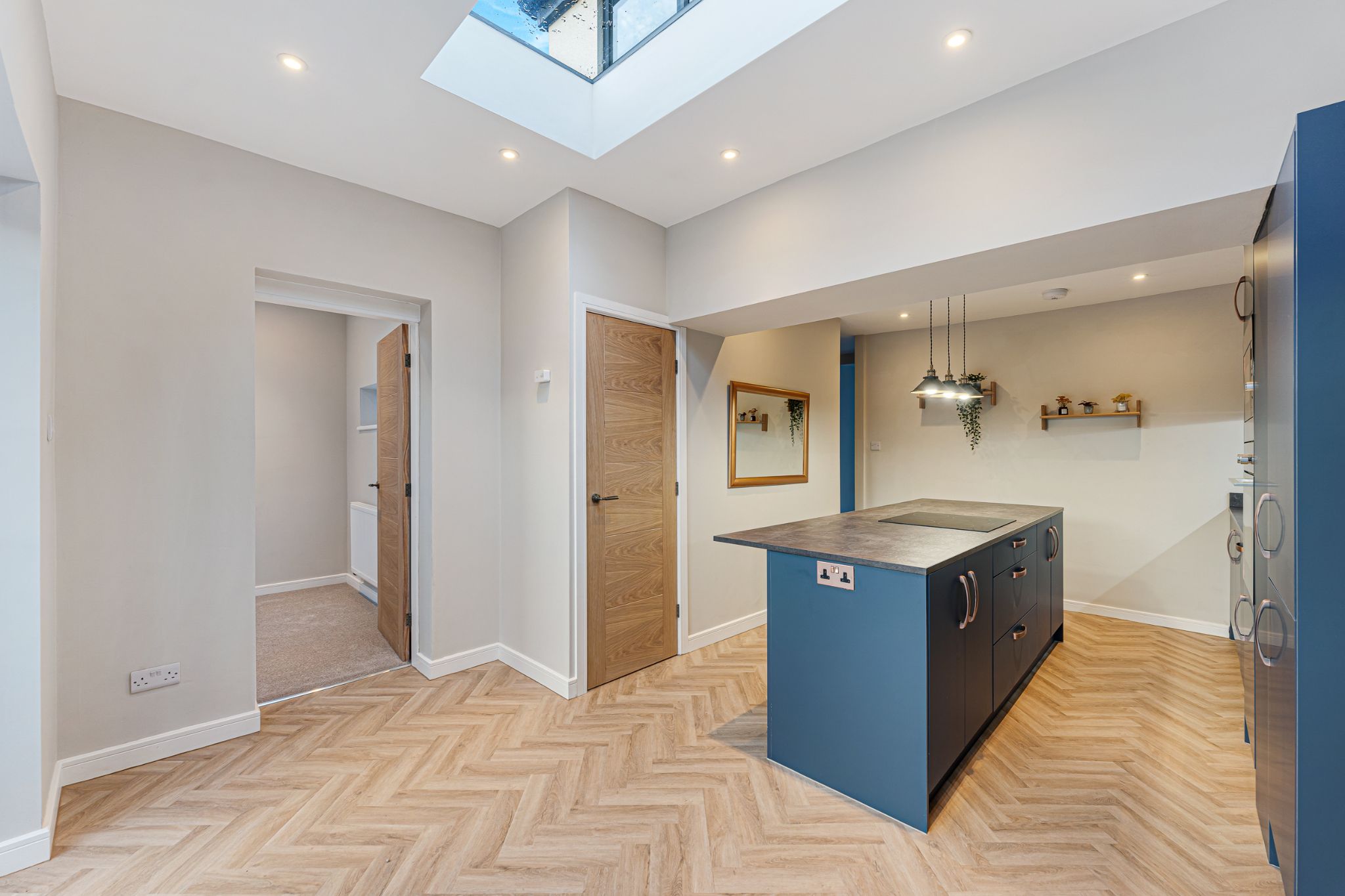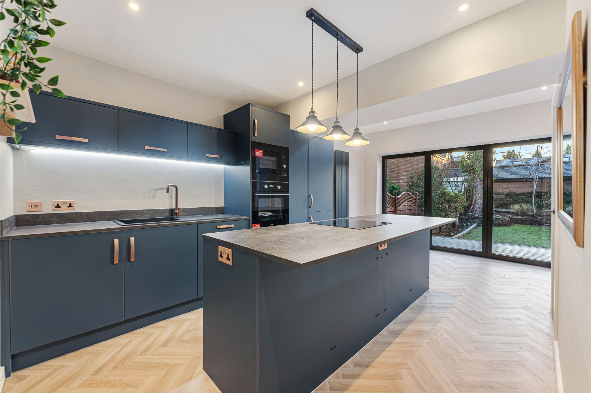 Into the welcoming entrance vestibule which leads through to a spacious lounge, featuring a large bay window and an attractive panelled media wall and built-in electric fire. Continuing through the property, you arrive at the kitchen-diner which has been extended and beautifully finished with navy wall and base units, rose gold fixtures and fittings, and a central island — perfect for enjoying your morning coffee.