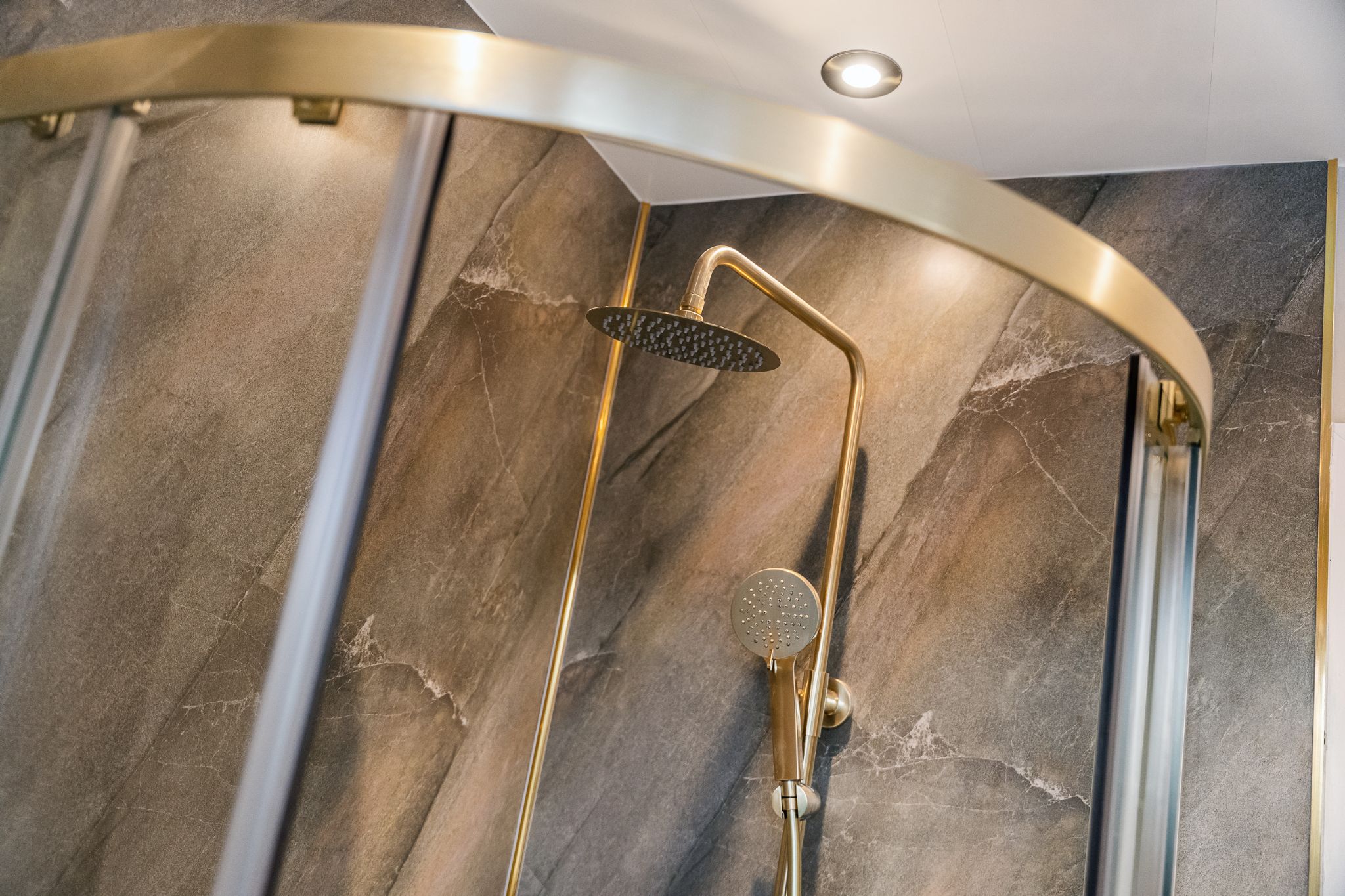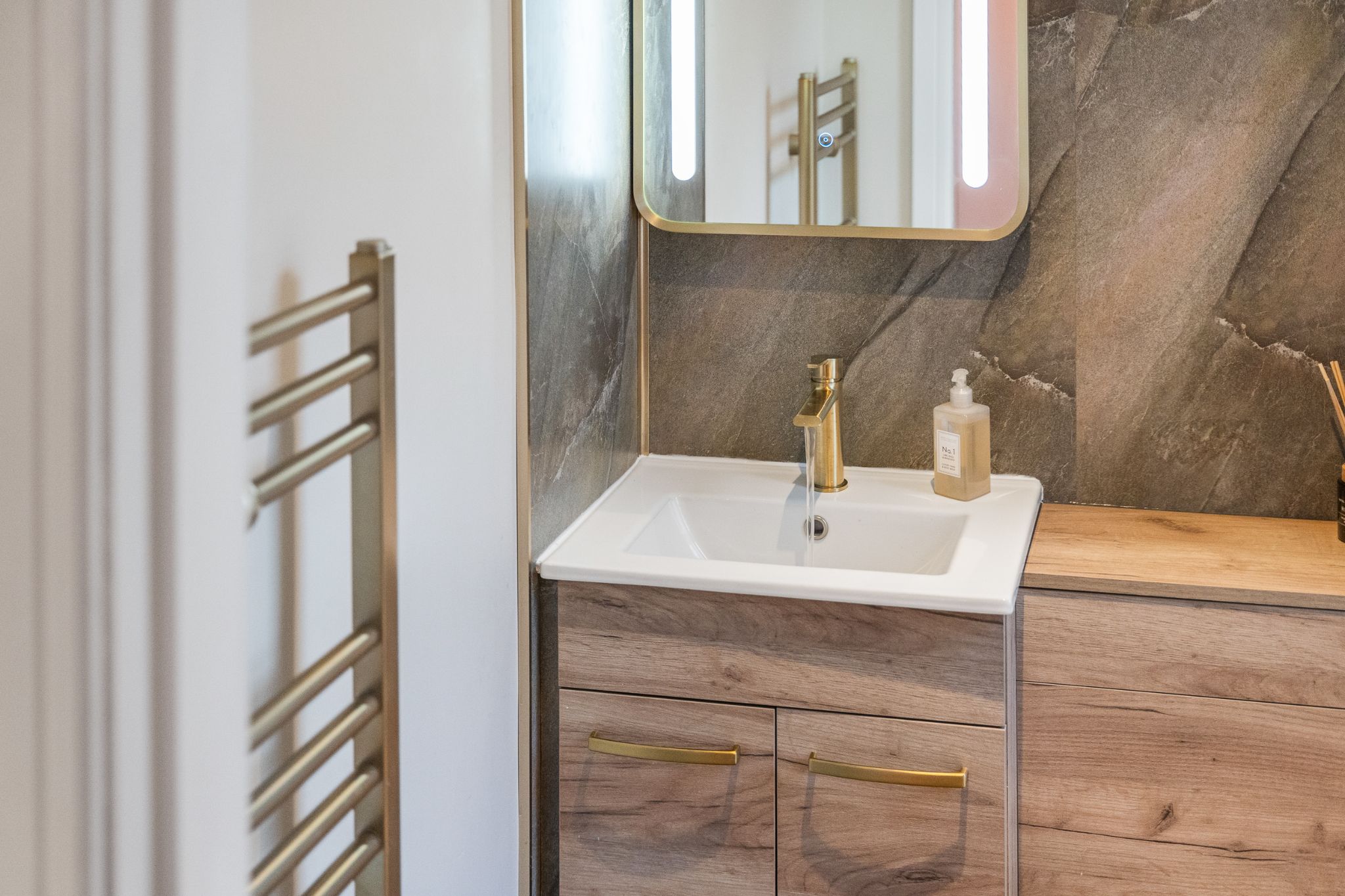 To the first floor, you will discover two well-proportioned bedrooms and the family bathroom. The master bedroom is a great-sized double, with a large bay window and stylish feature wall panelling with integrated bedside lighting. Bedroom two is a well-sized double overlooking the rear garden and the three-piece family bathroom is part-tiled in contemporary grey tones, with elegant brass fixtures, comprising of a WC, elevated vanity unit, enclosed shower, LED mirror, and a brass heated towel rail.