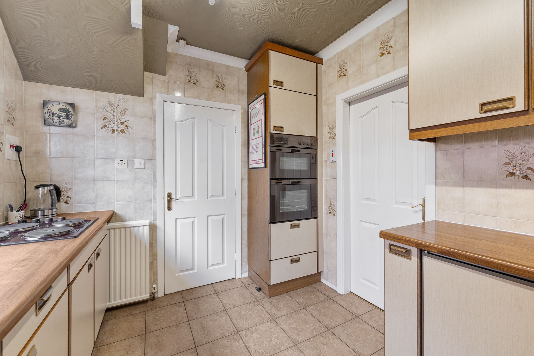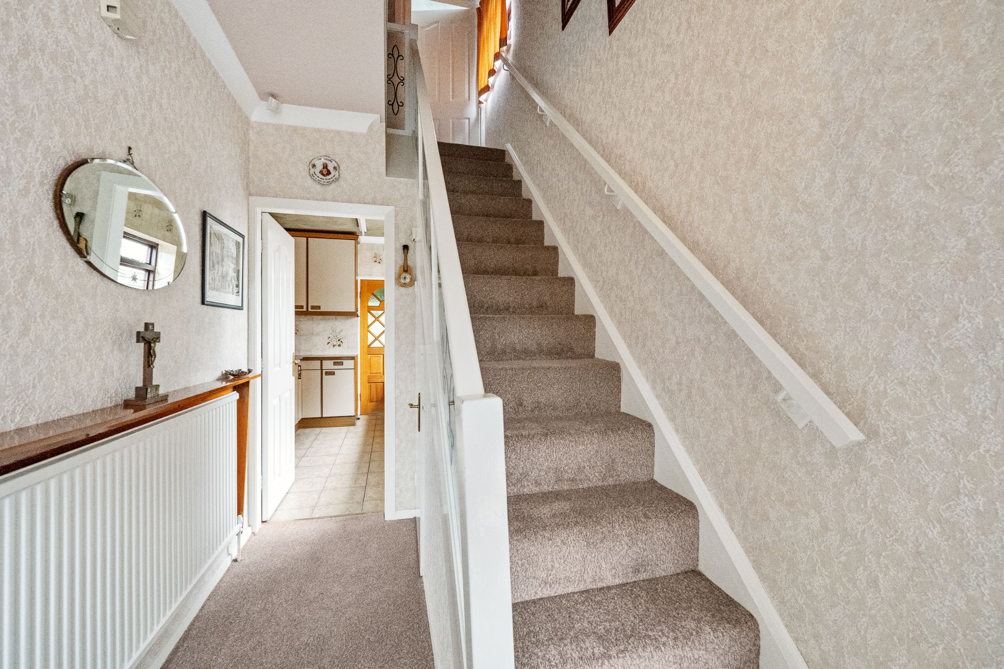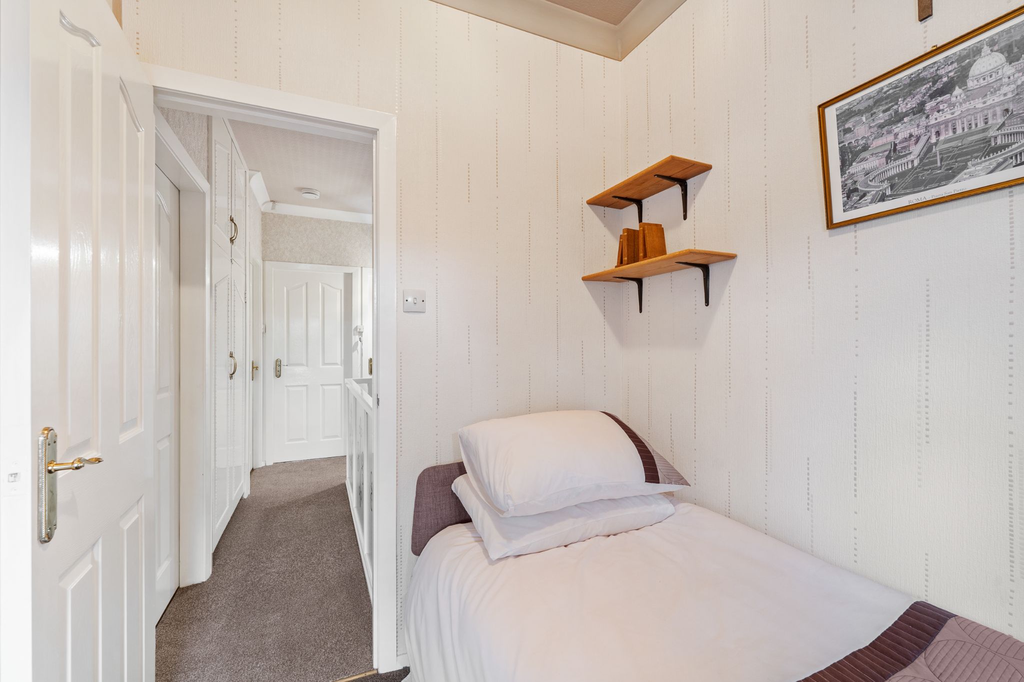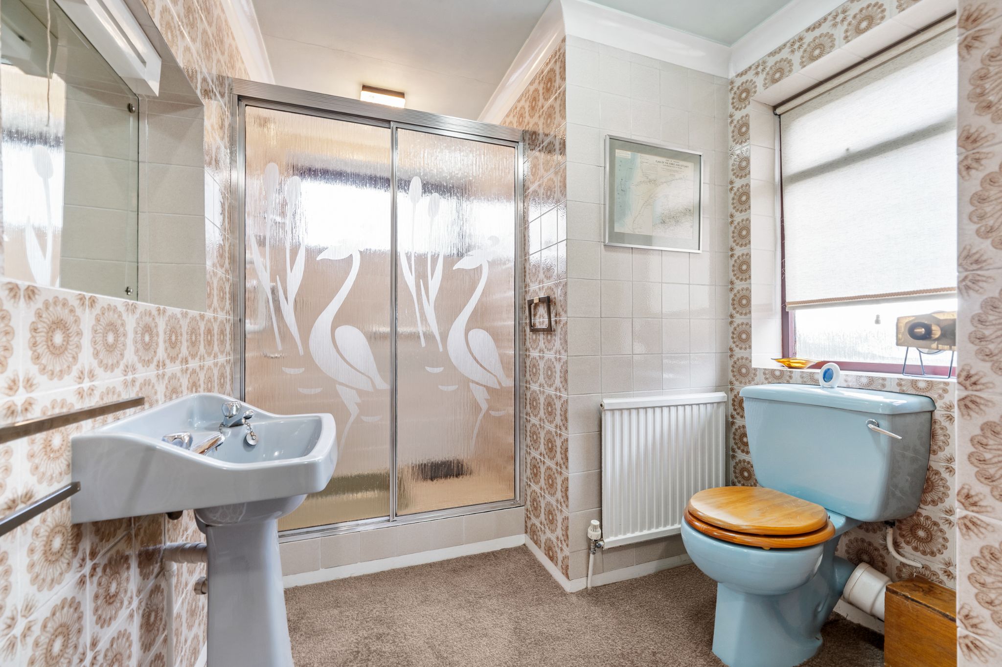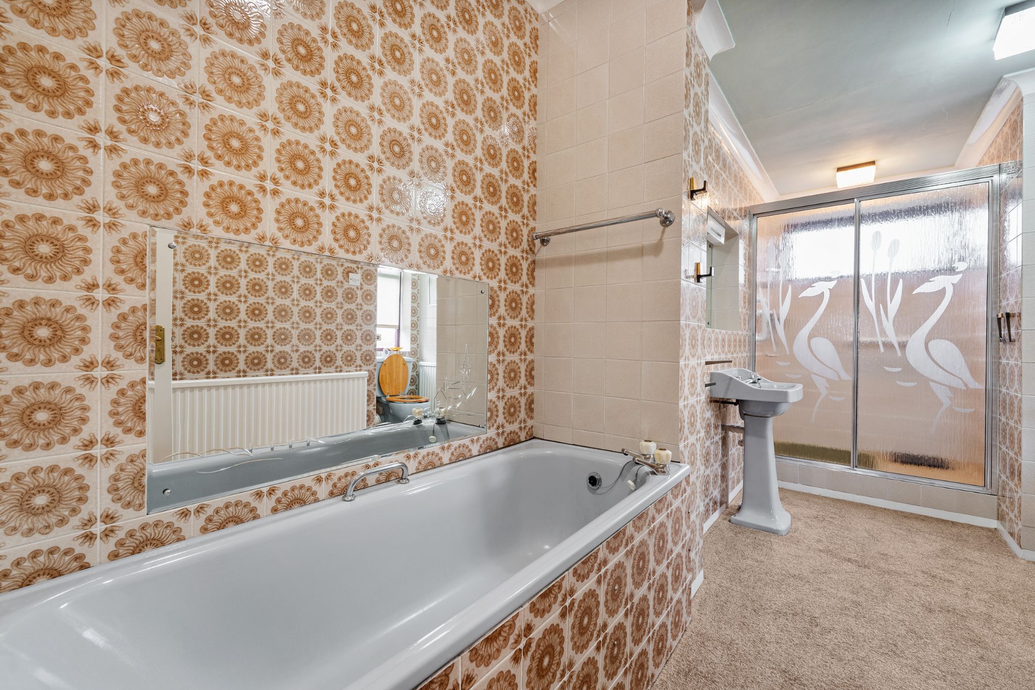 Retrace your steps to the entrance hall and up the stairs,. On the first floor, you will find a large airing cupboard for useful storage, three well-proportioned bedrooms, a four-piece family bathroom, and a separate WC. The master bedroom is positioned to the front of the property and benefits from fitted furniture. Bedroom two has been extended over the dining room, providing ample space and featuring built-in storage cupboards, while bedroom three is a generous single, ideal as a home office or a child’s bedroom. The family bathroom is fully tiled and comprises a bath, wash basin, WC, and a large enclosed shower. A fully tiled separate WC is conveniently located next to the bathroom, for added convenience.