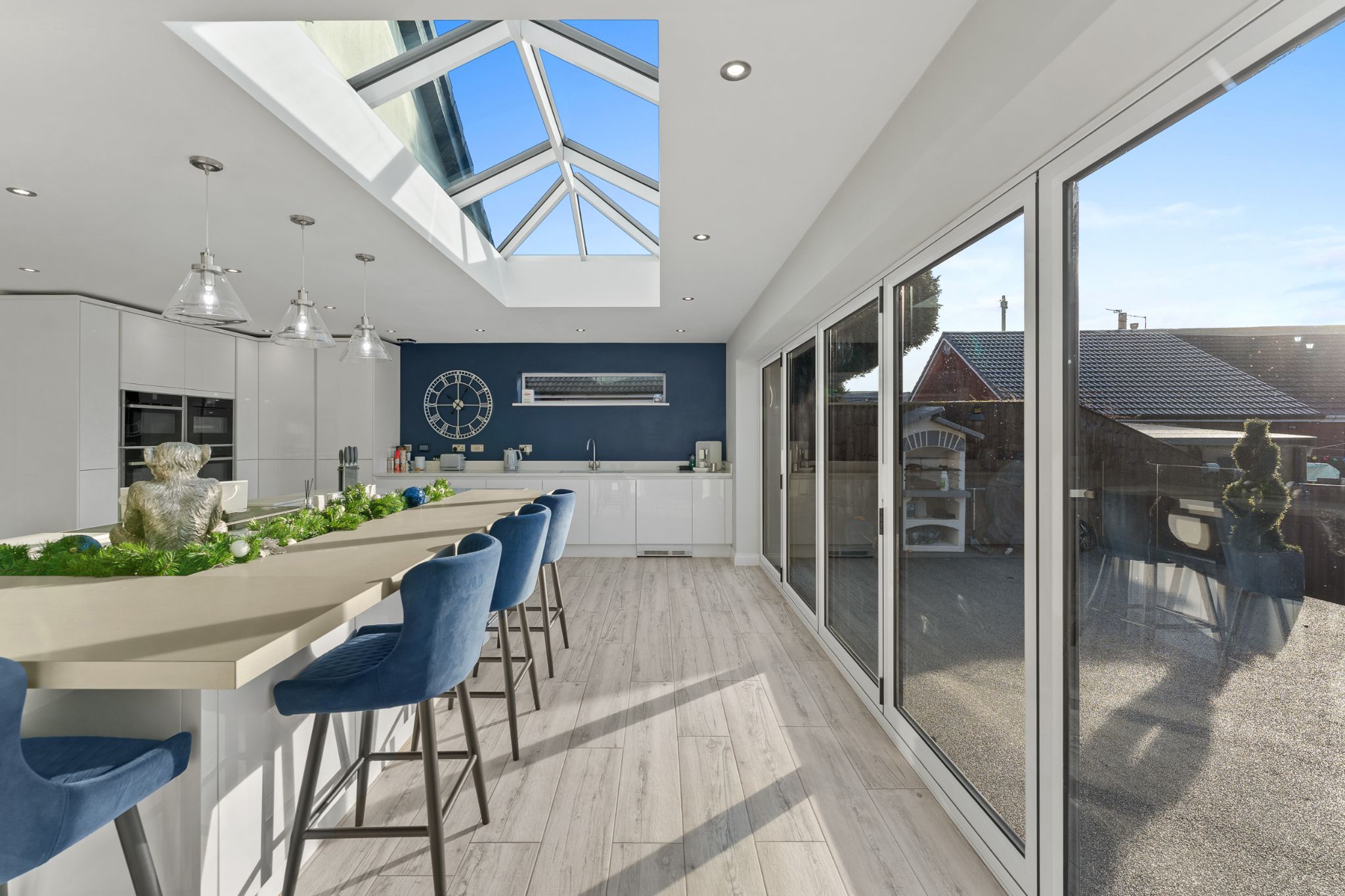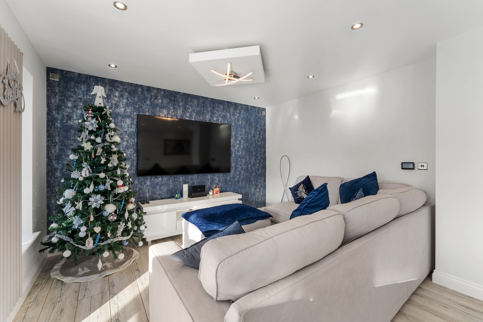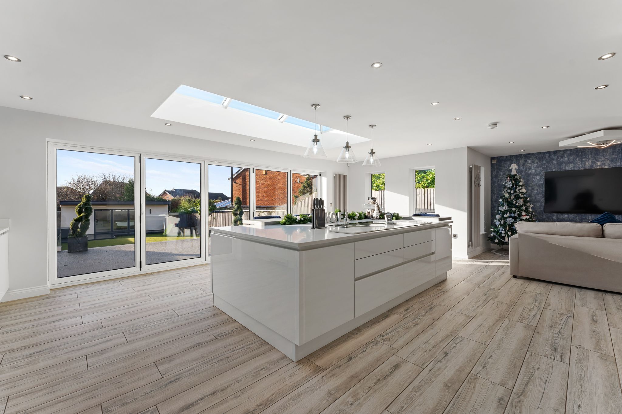Into your welcoming entrance hallway where wood effect tiles and underfloor heating flows through a number of rooms in the downstairs living space, to your right is a separate cosy lounge with a large front window and a feature floating ceiling with lighting. Continuing down the hallway you will find the show stopping open-plan kitchen, dining and family room— the true heart of the home, designed for modern living, this is where the action happens... Cooking, eating and entertaining - a place for the whole family to gather and enjoy each other’s company after going about their busy days! Large bi-folding doors opening up to the fantastic garden bringing the outside in during those warmer summer months, a state of the art lantern roof skylight makes this stunning room extremely bright and airy. The kitchen comprises of white gloss wall and base units, quartz worktops, integrated full size fridge and freezer, electric induction hob, double oven - a stylish elevated breakfast bar surrounding the kitchen island, perfect to dine from.