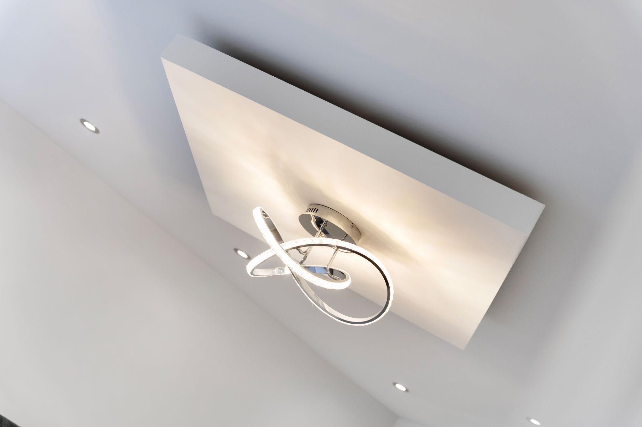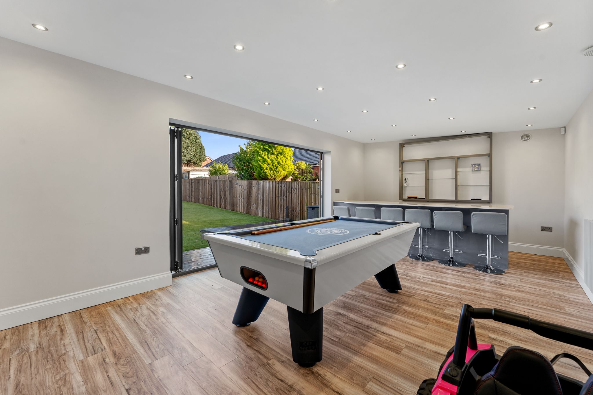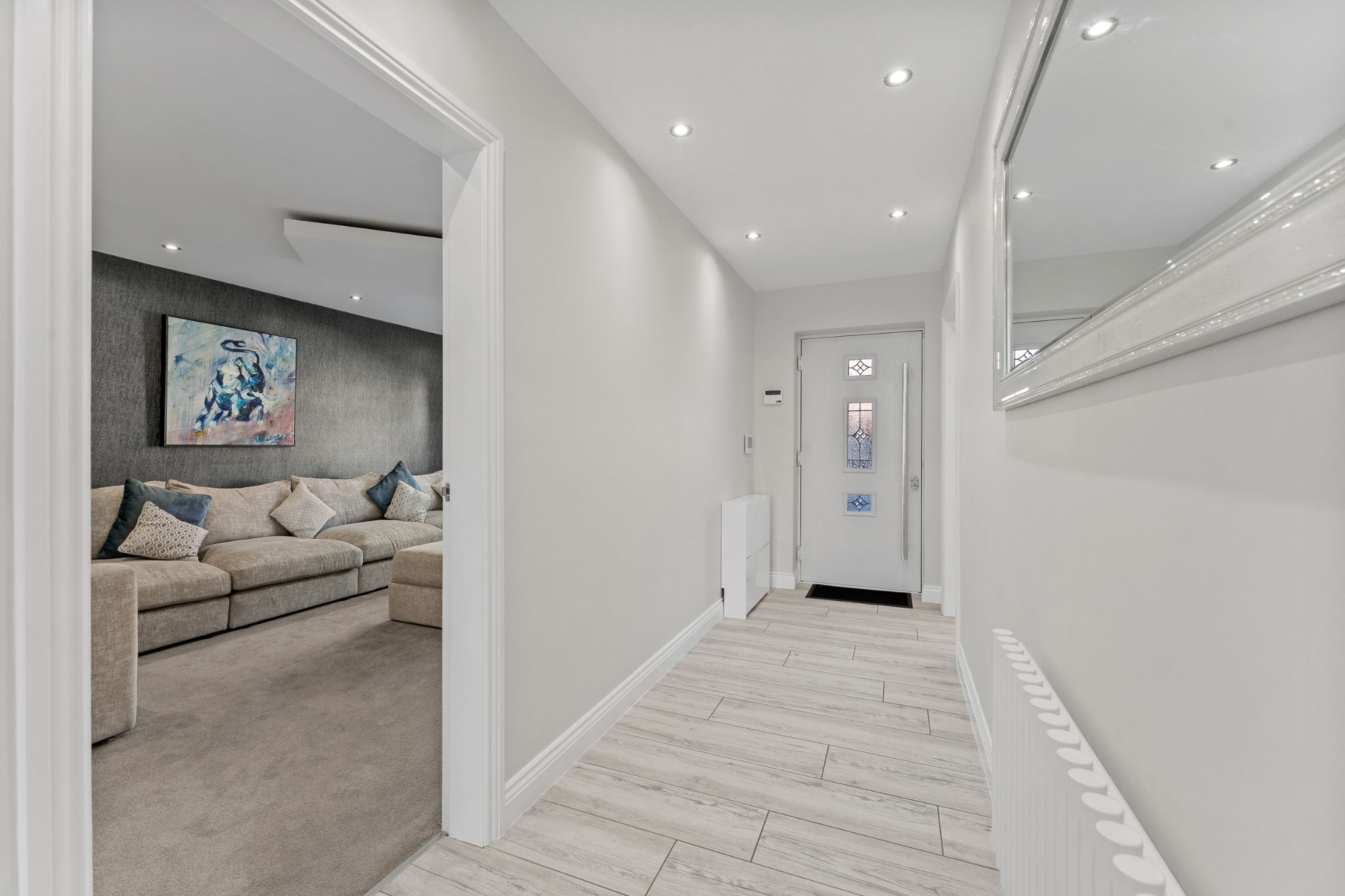 Into your welcoming entrance hallway where wood effect tiles and underfloor heating flows through a number of rooms in the downstairs living space, to your right is a separate cosy lounge with a large front window and a feature floating ceiling with lighting. Continuing down the hallway you will find the show stopping open-plan kitchen, dining and family room— the true heart of the home, designed for modern living, this is where the action happens... Cooking, eating and entertaining - a place for the whole family to gather and enjoy each other’s company after going about their busy days! Large bi-folding doors opening up to the fantastic garden bringing the outside in during those warmer summer months, a state of the art lantern roof skylight makes this stunning room extremely bright and airy. The kitchen comprises of white gloss wall and base units, quartz worktops, integrated full size fridge and freezer, electric induction hob, double oven - a stylish elevated breakfast bar surrounding the kitchen island, perfect to dine from.