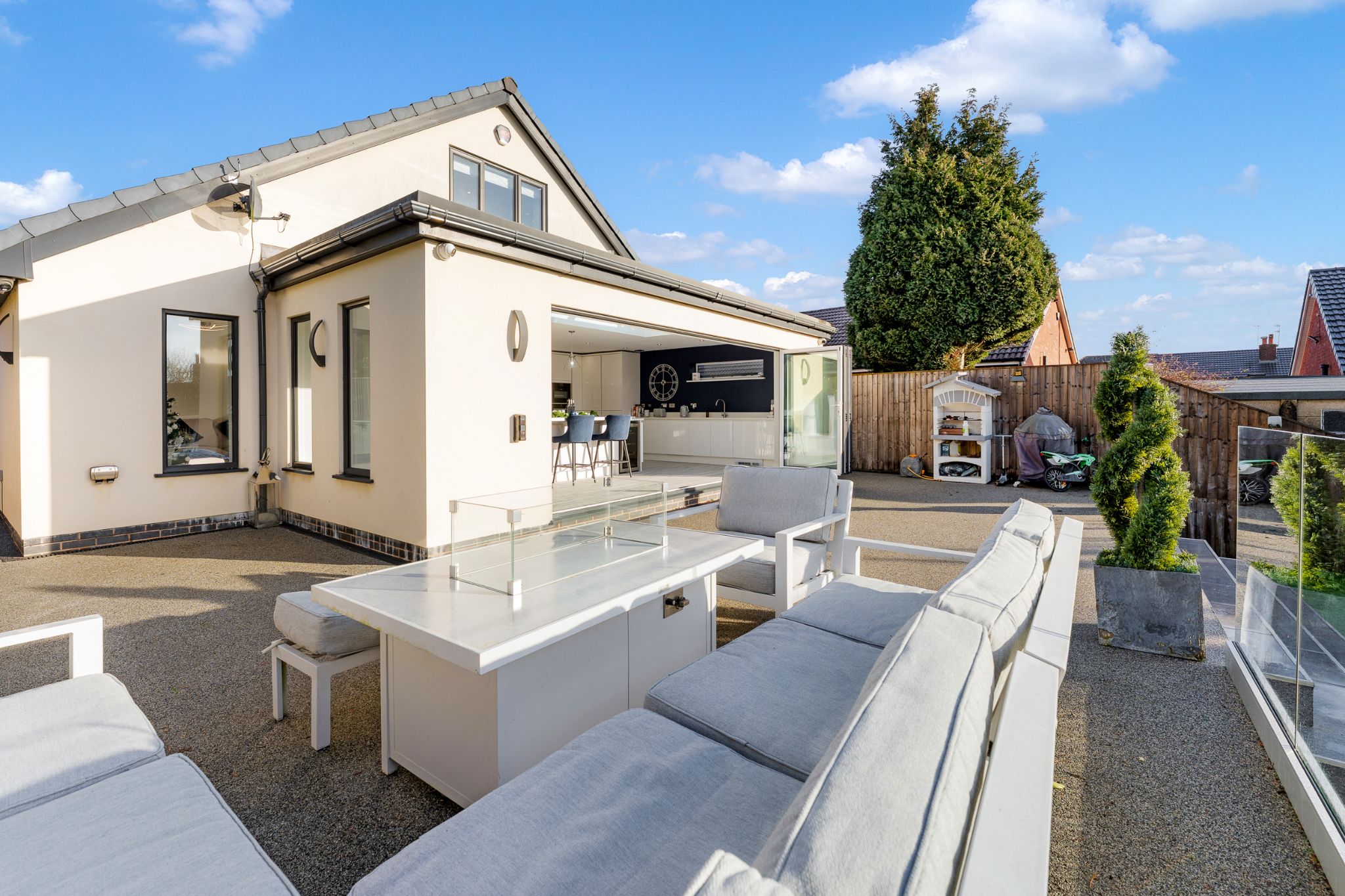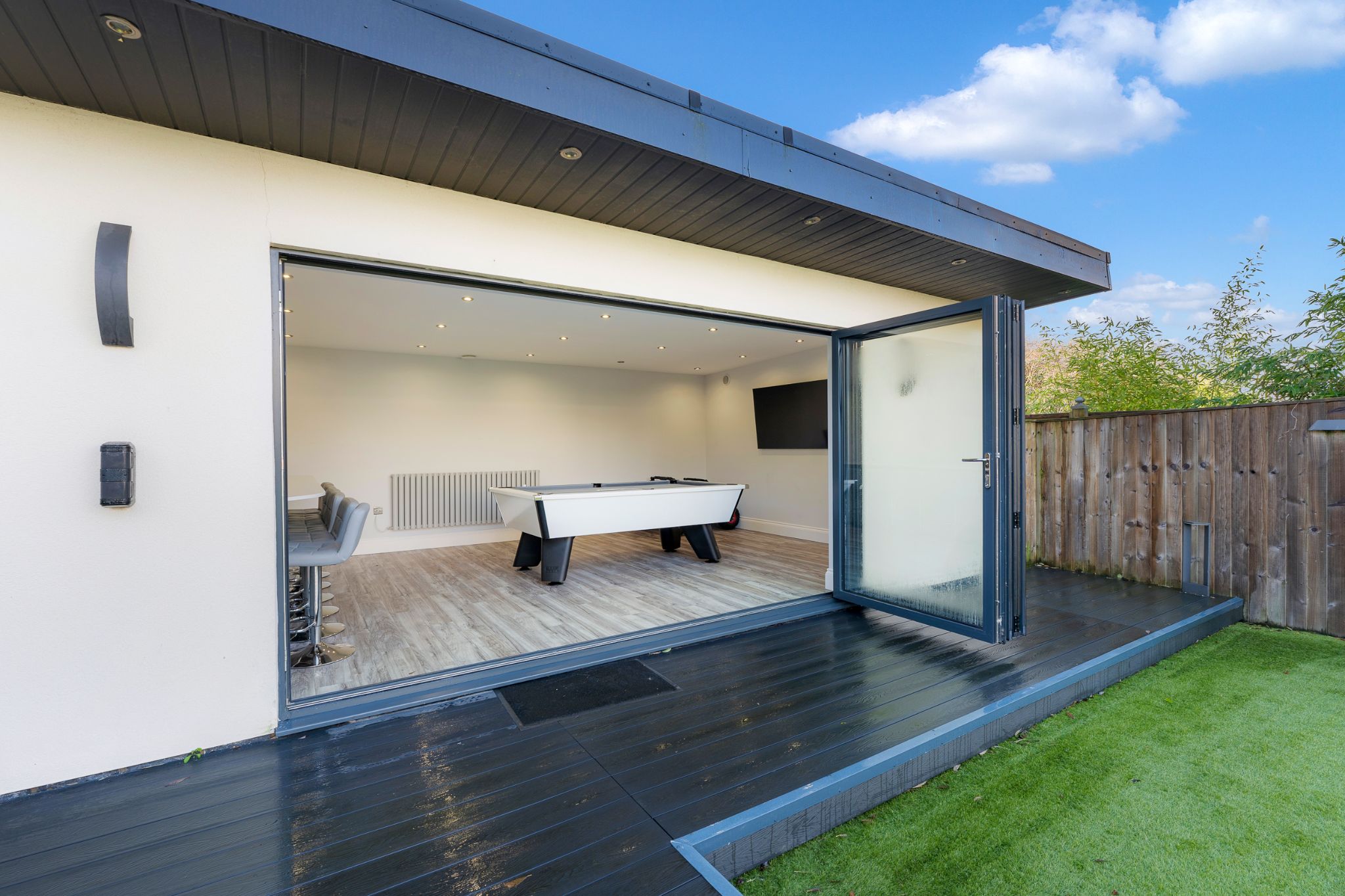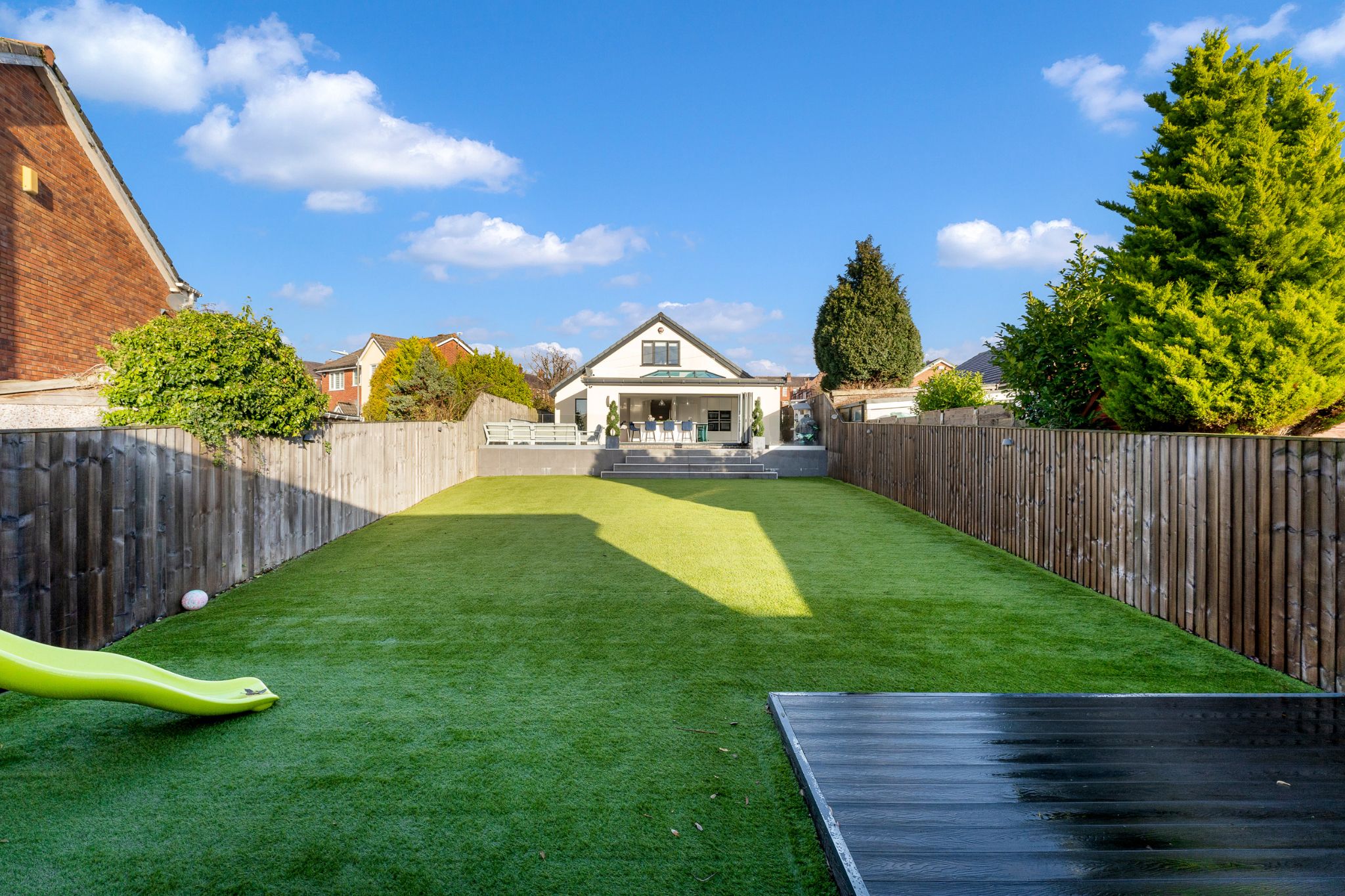 Externally, the home sits on a generous plot, complete with a professionally landscaped rear garden, a substantial grey resin patio area with a glazed balustrade and outside lighting, perfect for dining al-fresco through those warmer summer months. The adults can sit and relax on this patio and fire up the BBQ, whilst they sit and watch the kids play happily on the extensive astro-turfed lawns. A fabulous garden room provides flexible space for a number of uses and features power and light, bi-folding doors to open up onto the garden. A gated driveway offers secure off-road parking and leads to a detached garage. The property is complete with a secure alarm and camera system.